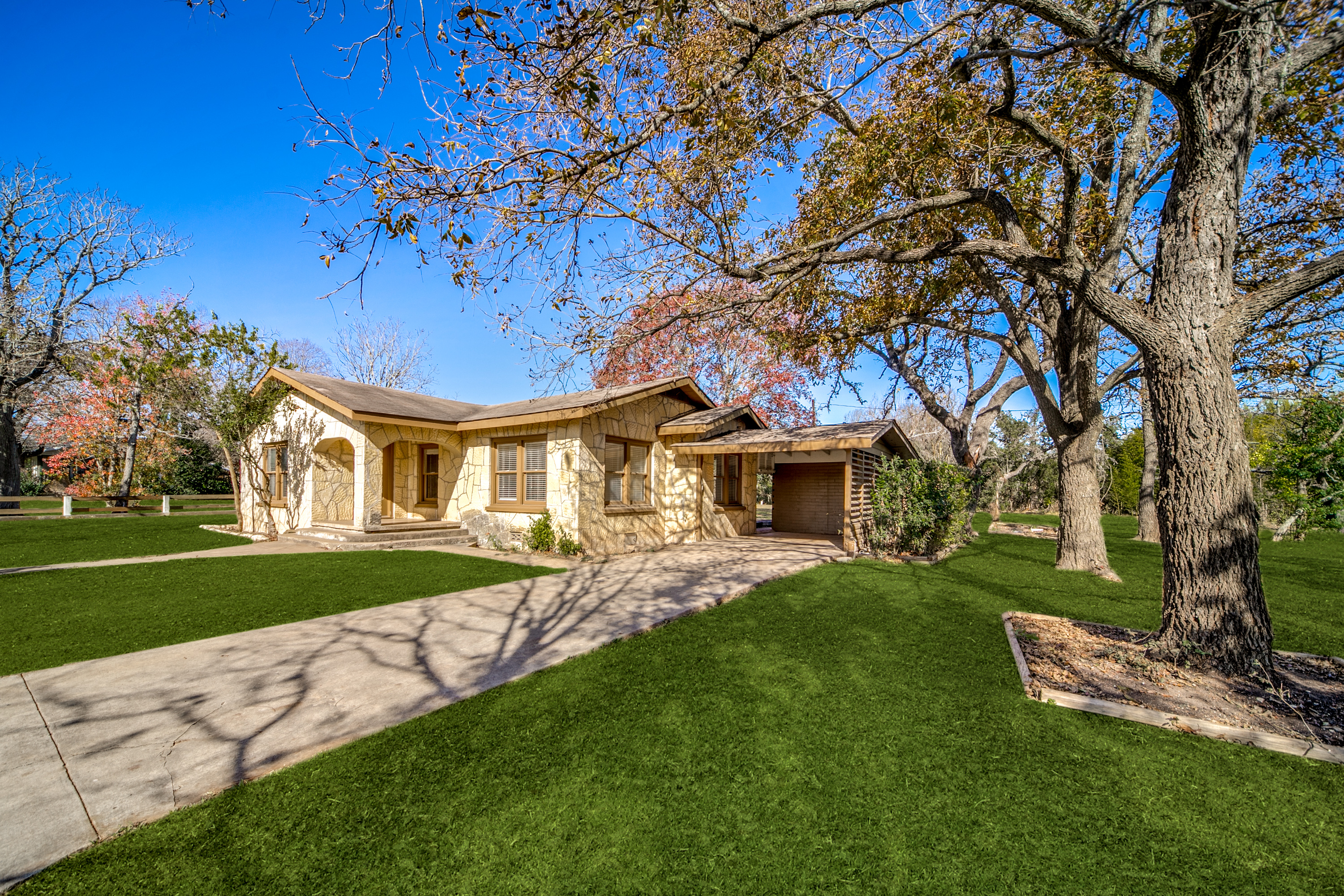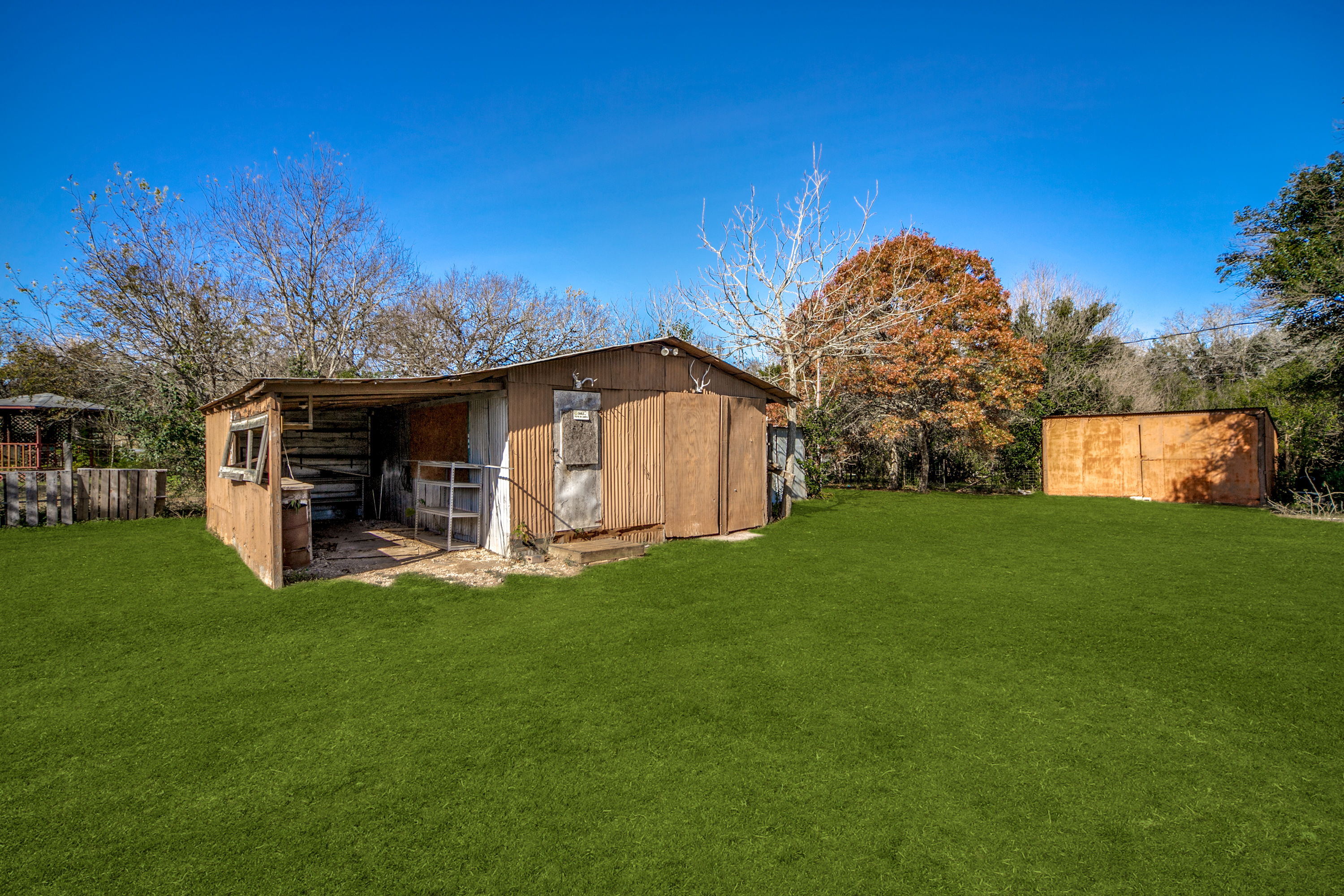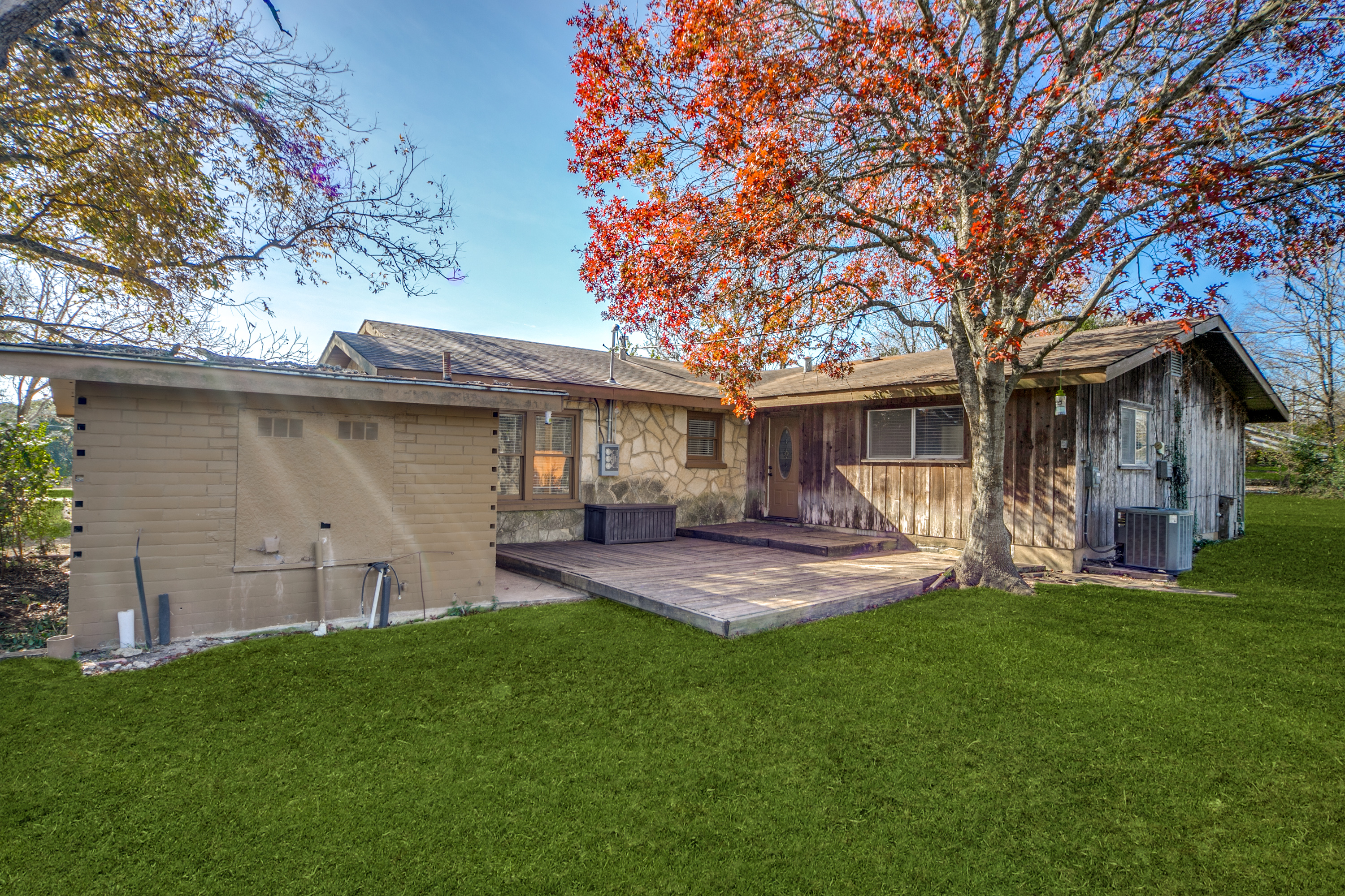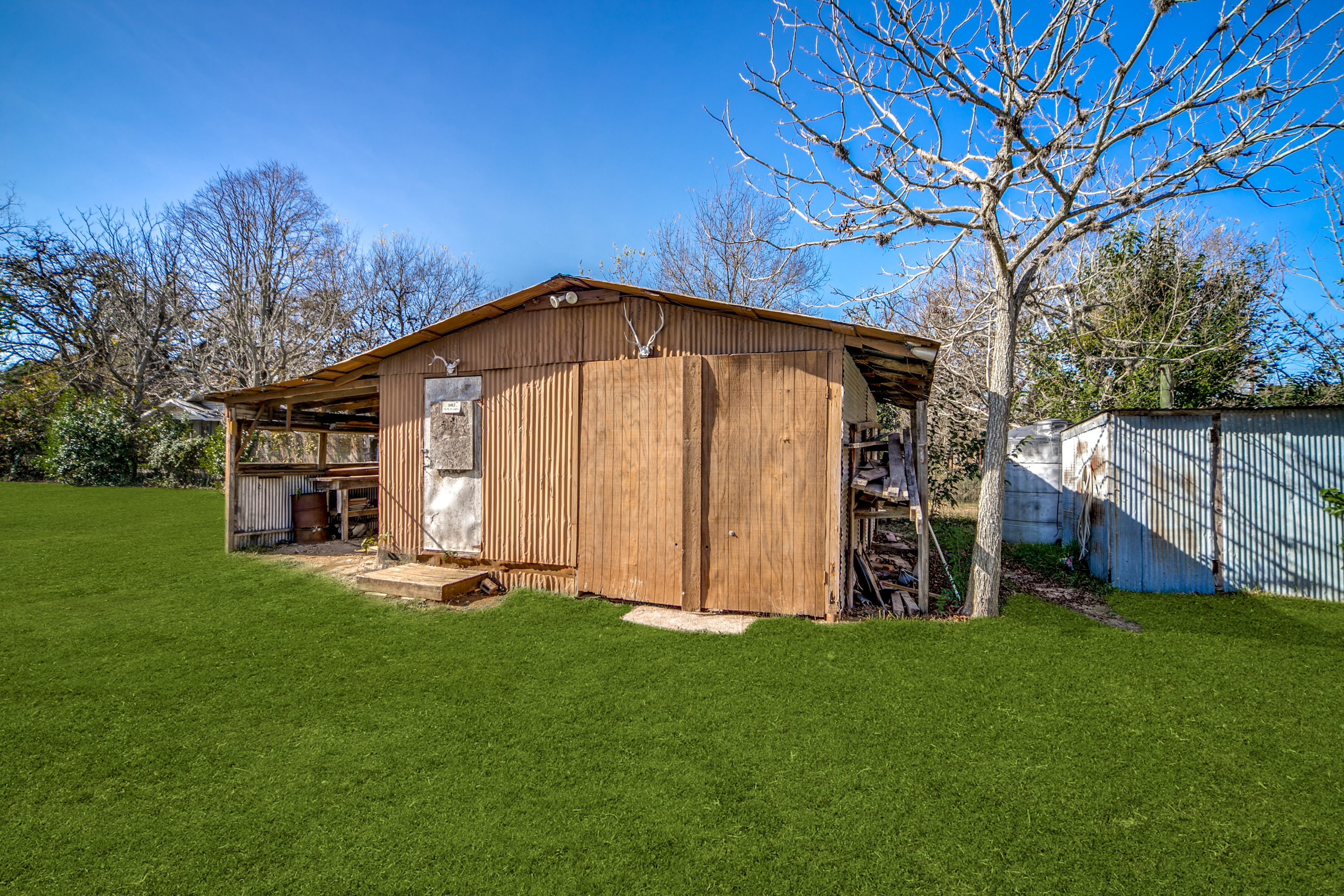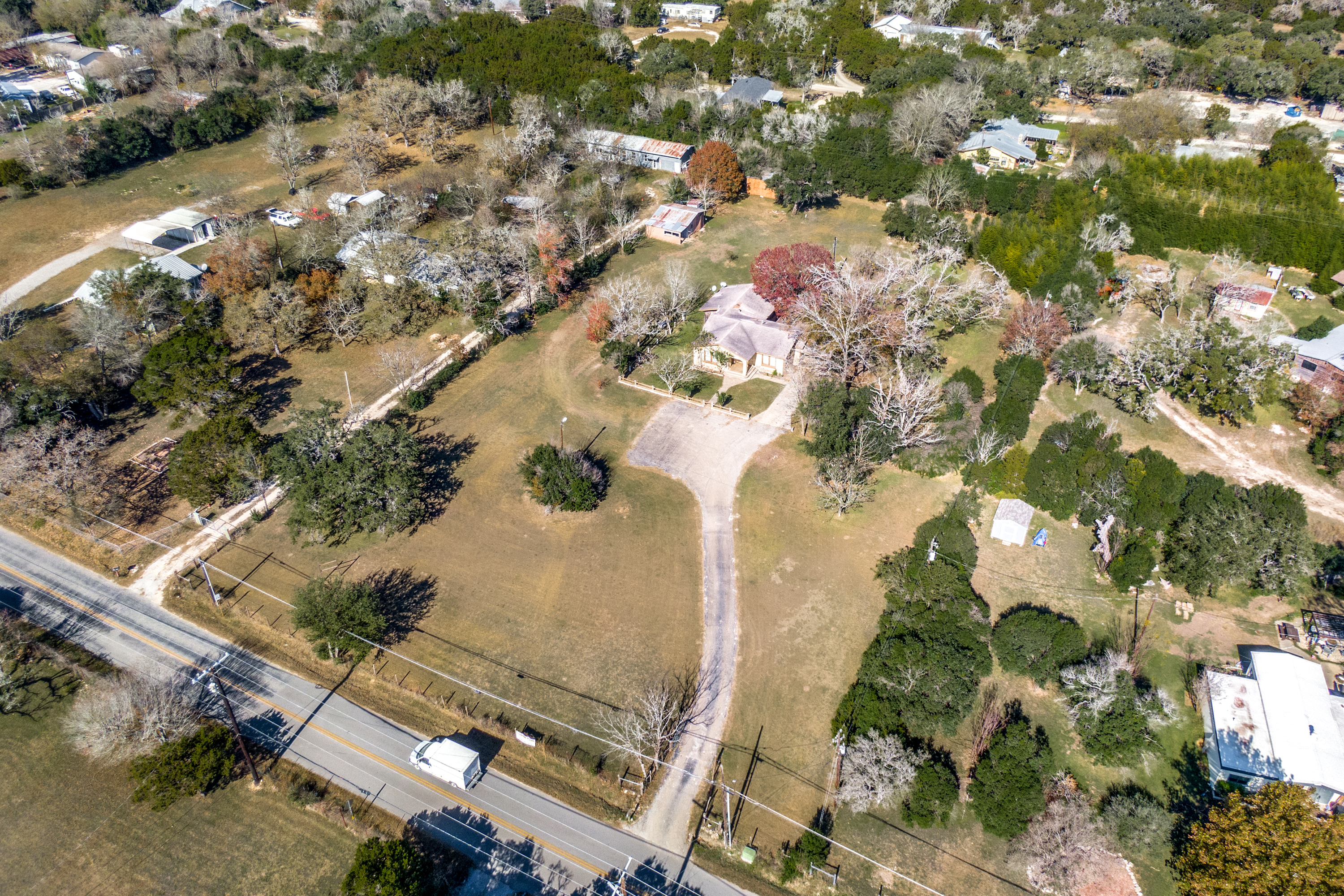 Rare Unrestricted nearly 2 Acre Property with easy IH-10 Access! Offering the perfect opportunity to run a business out of the existing home and outbuildings or LIVE and work at the same property. Nice mature trees-great potential for parking. Two big living areas, potential four bedrooms. Saltillo tile in the kitchen with granite counters, electric range, refrigerator, original hardwood floors through much of the home. One car carport.