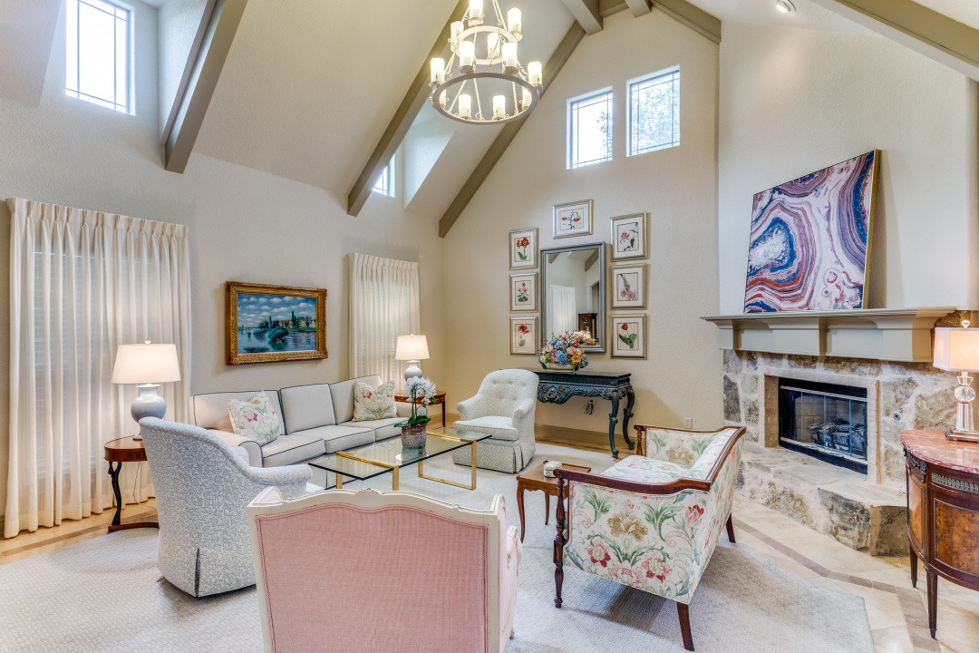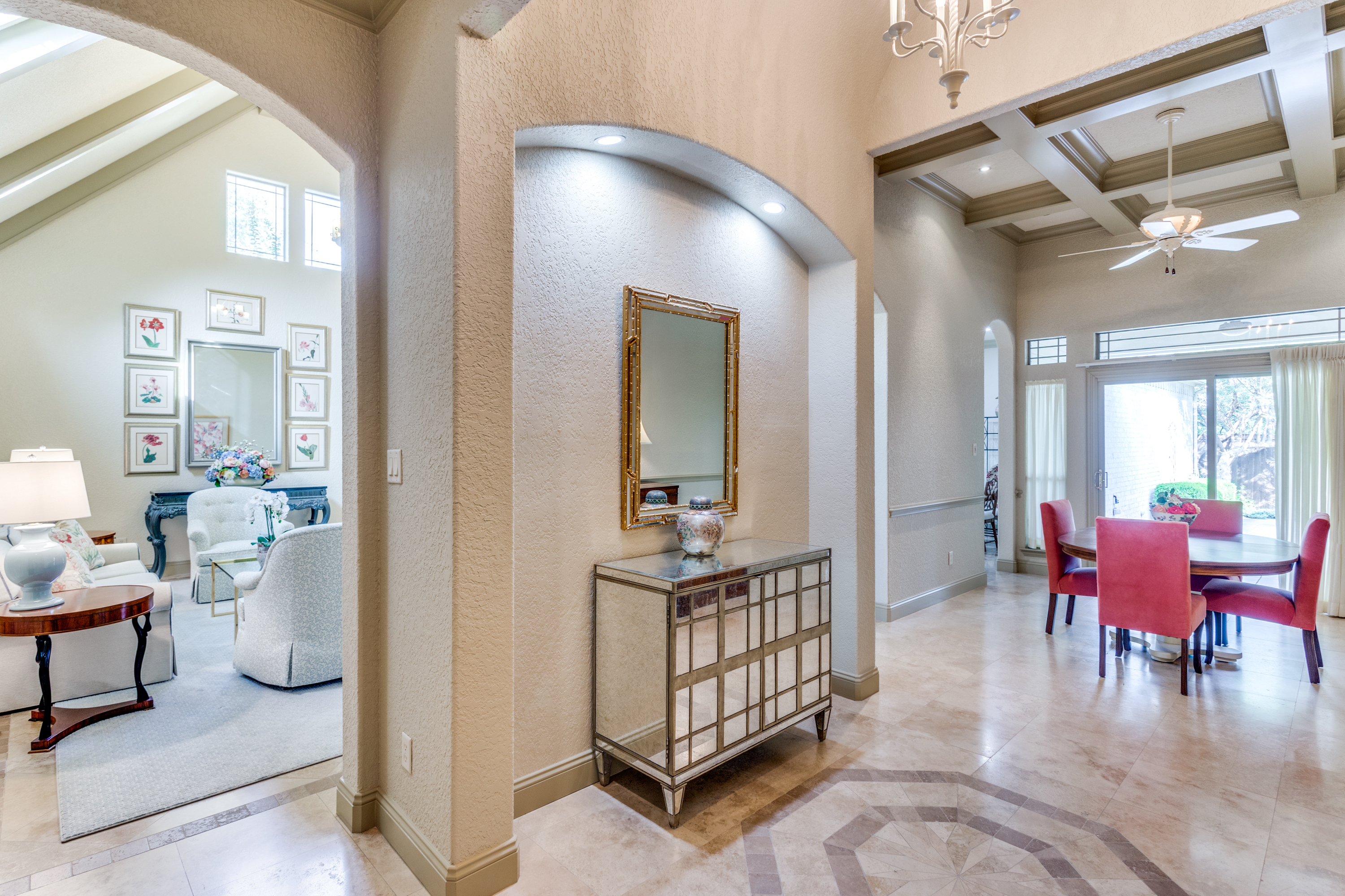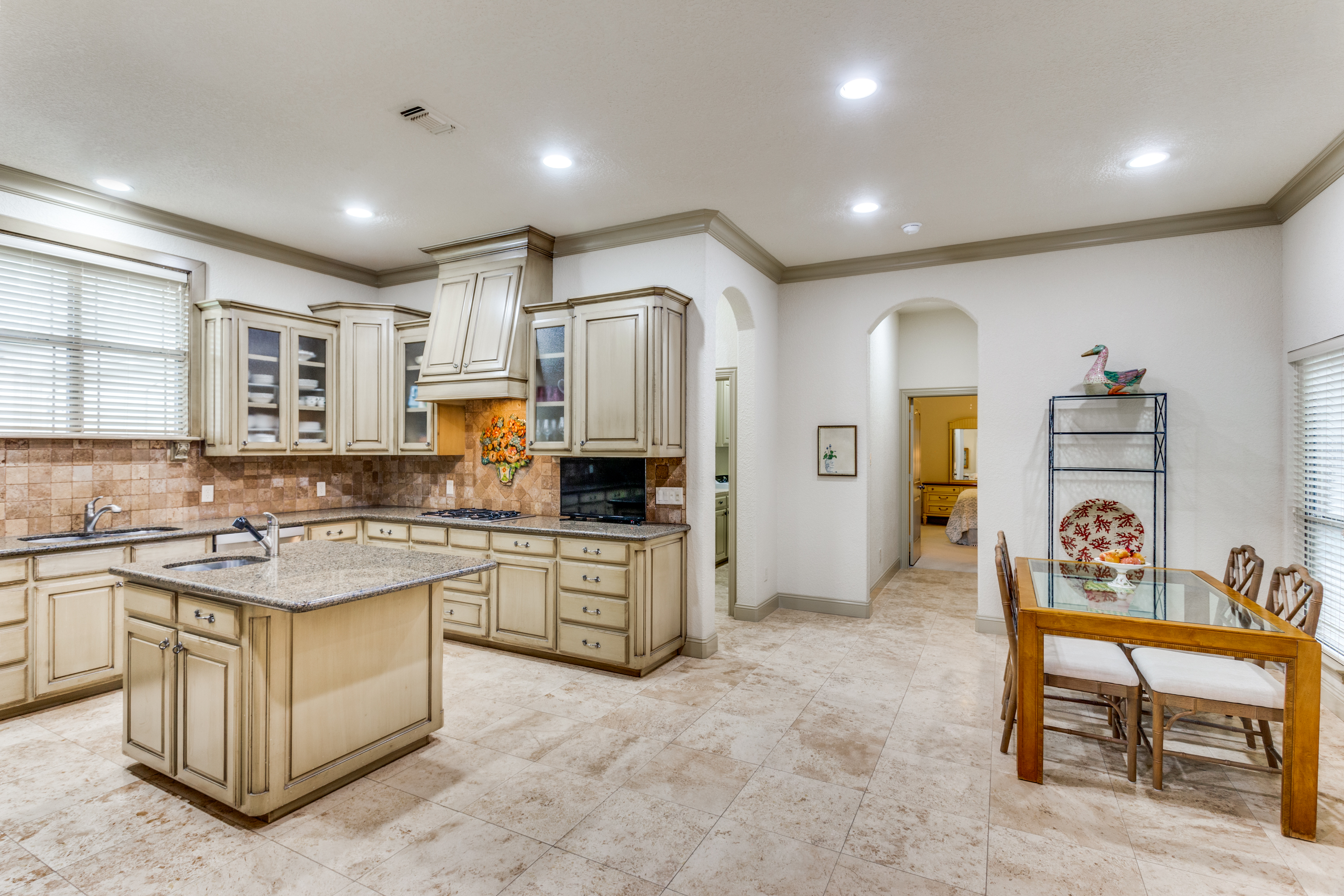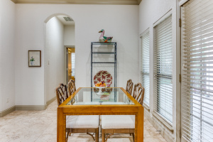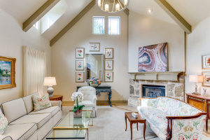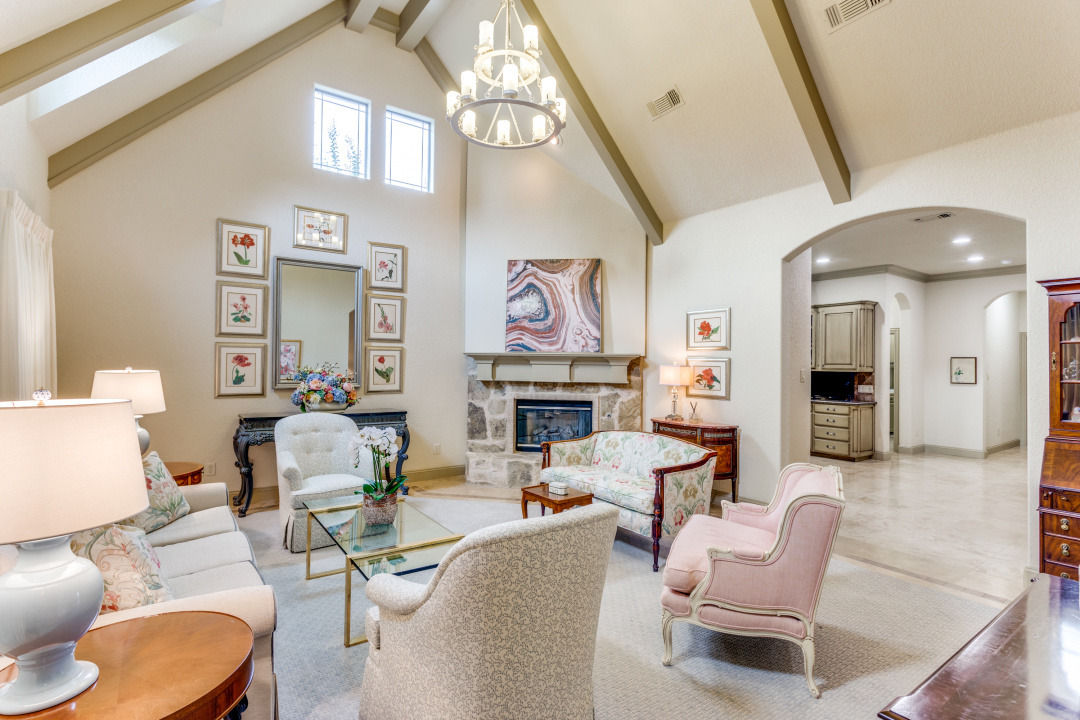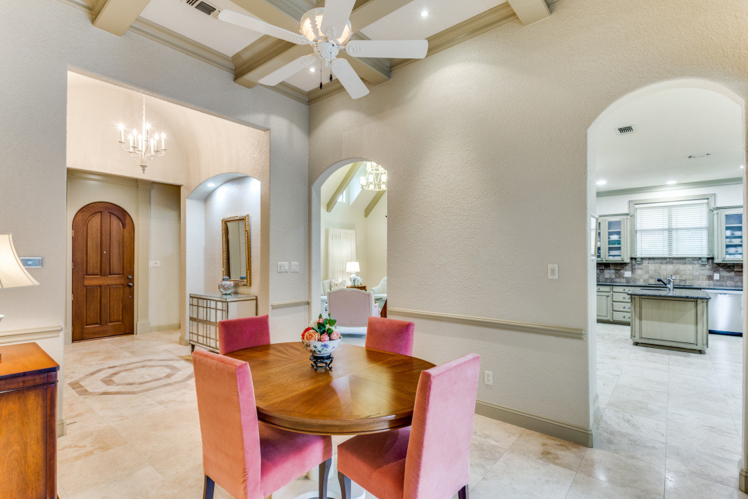 This property features an open floor plan that flows from room to room through expansive doorways. The view from the entry is through a dining area to the backyard covered patio. The living room is a spacious airy space, containing an impressive chandelier, a gas log fireplace and this area is flooded with light from dormer windows located in the vaulted ceiling. The kitchen includes a work sink and prep sink, stainless appliances, an abundance of counter space and remarkable cabinet storage. All bedrooms are in separate areas of the home, and each has a private bath and walk-in closets. The primary suite is oversized and contains a sitting area surrounded by windows; an ensuite bath with 2 walk-in closets complete the room. The entire home contains travertine flooring, natural light from large windows, upgraded fixtures & lighting, and the property is positioned in a quiet courtyard for privacy.