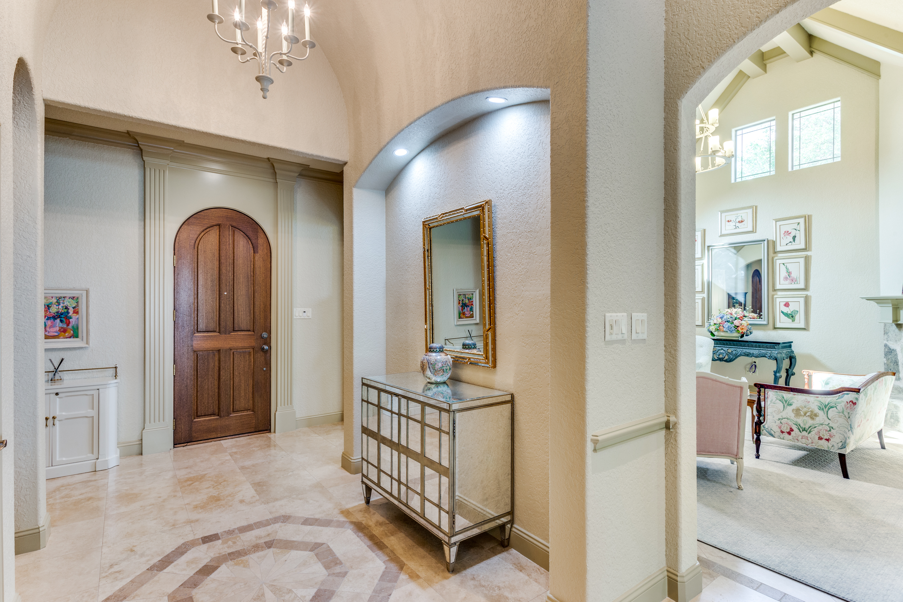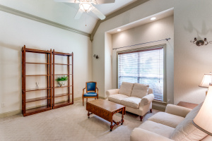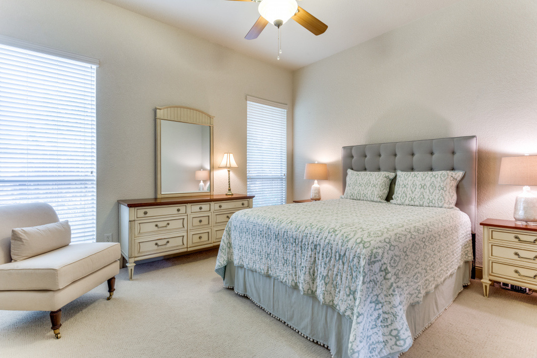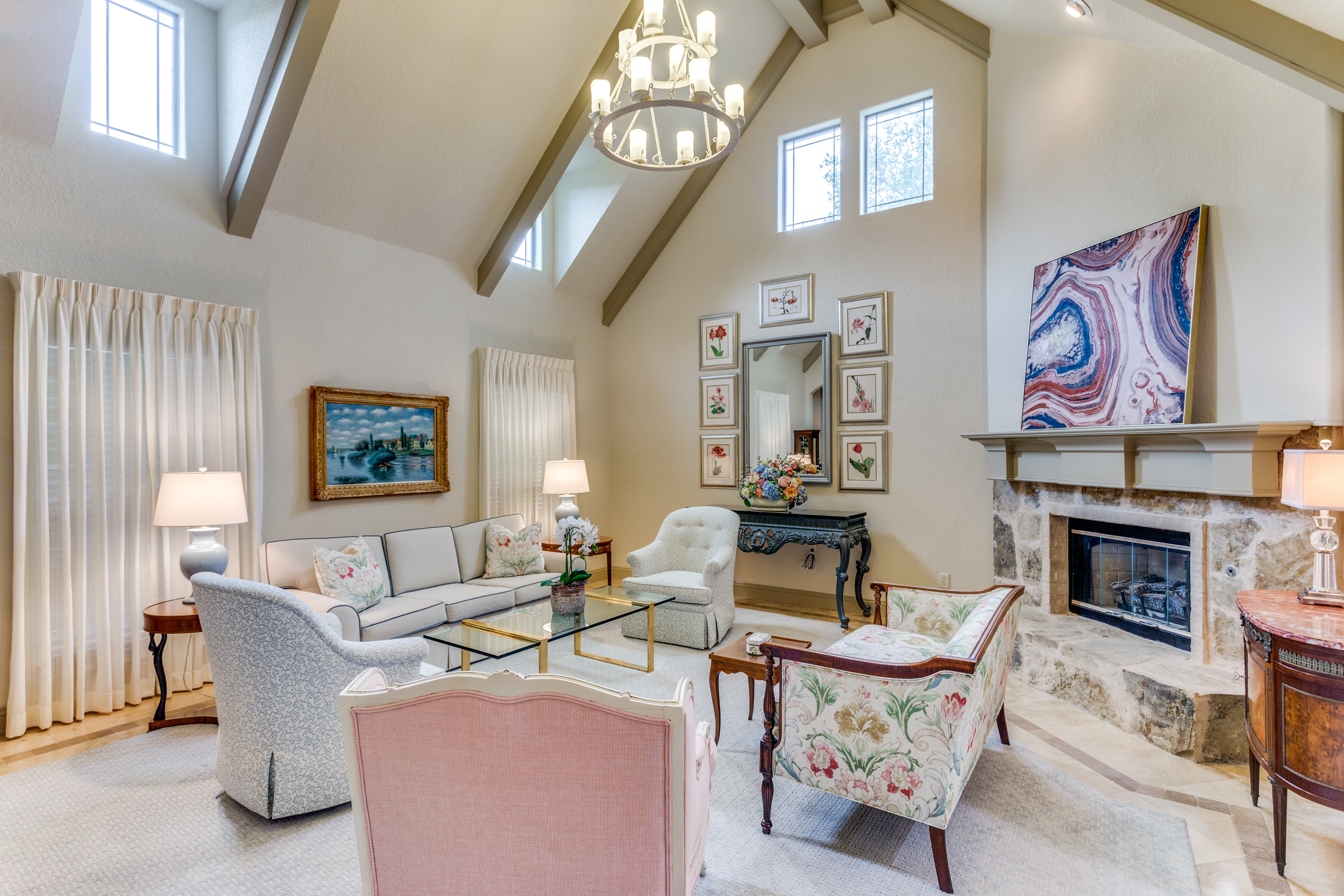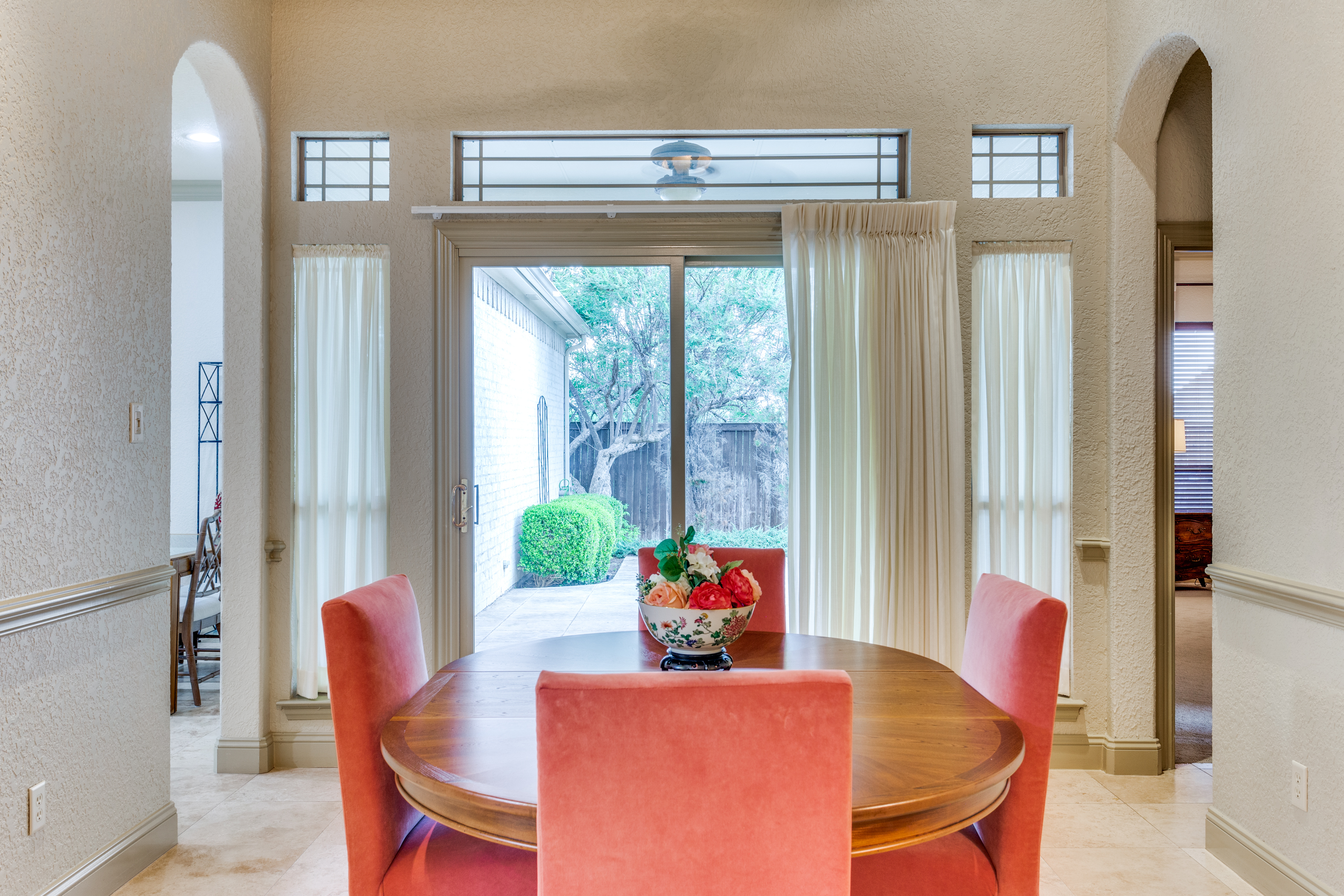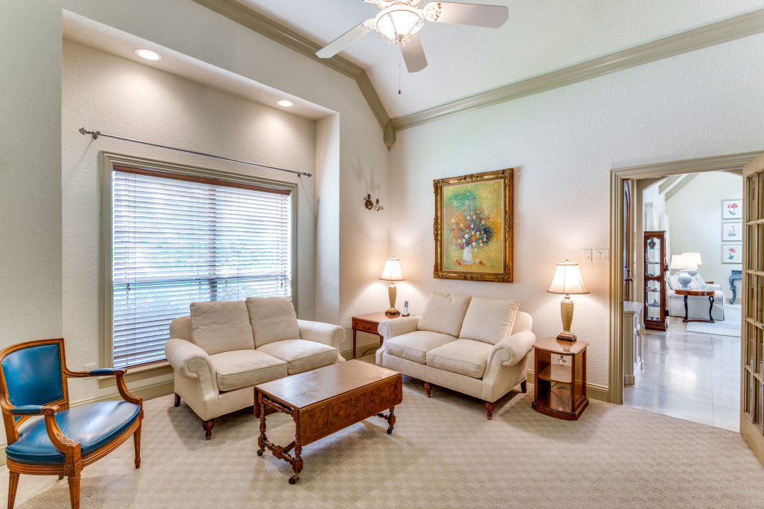 This property features an open floor plan that flows from room to room through expansive doorways. The view from the entry is through a dining area to the backyard covered patio. The living room is a spacious airy space, containing an impressive chandelier, a gas log fireplace and this area is flooded with light from dormer windows located in the vaulted ceiling. The kitchen includes a work sink and prep sink, stainless appliances, an abundance of counter space and remarkable cabinet storage. All bedrooms are in separate areas of the home, and each has a private bath and walk-in closets. The primary suite is oversized and contains a sitting area surrounded by windows; an ensuite bath with 2 walk-in closets complete the room. The entire home contains travertine flooring, natural light from large windows, upgraded fixtures & lighting, and the property is positioned in a quiet courtyard for privacy.