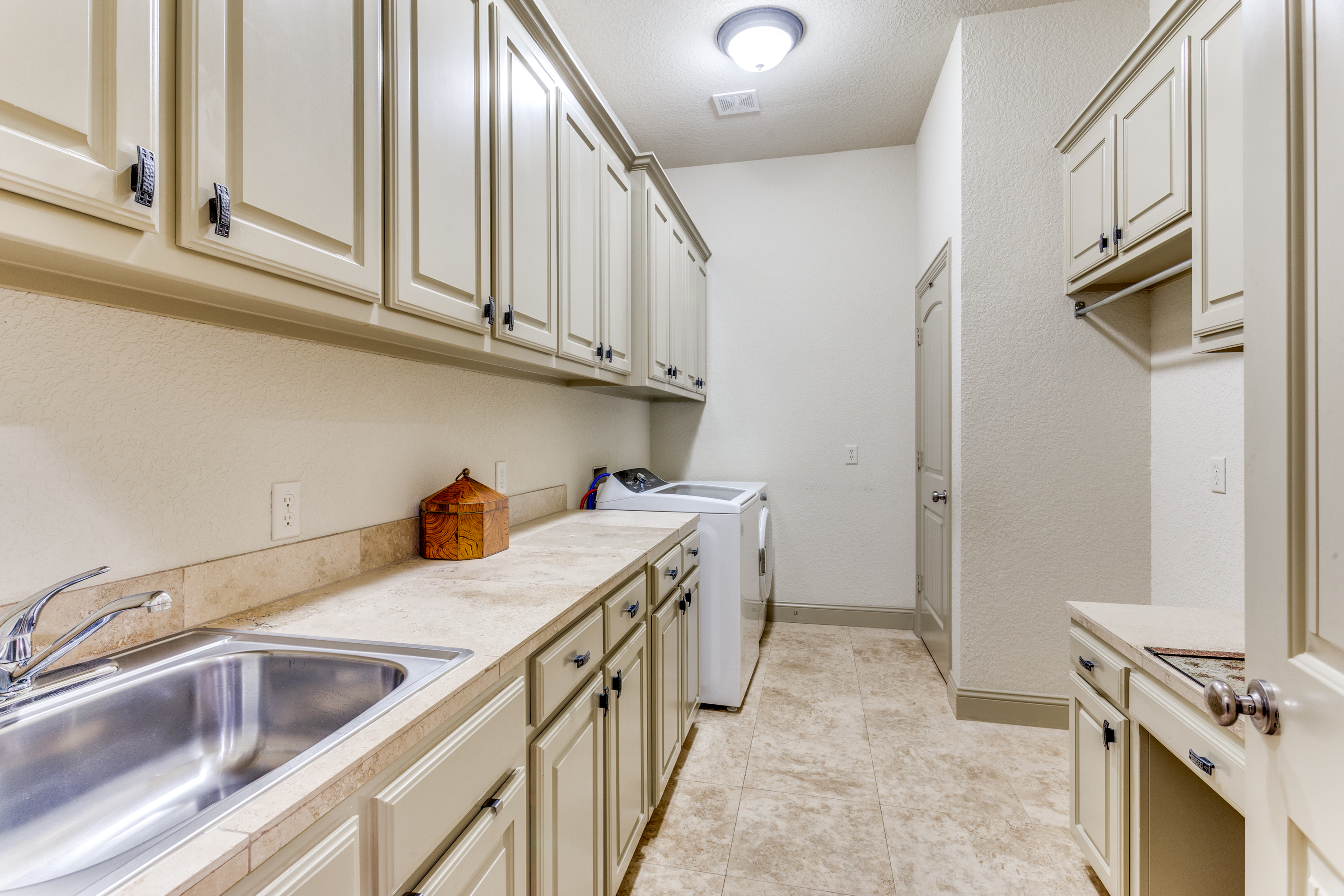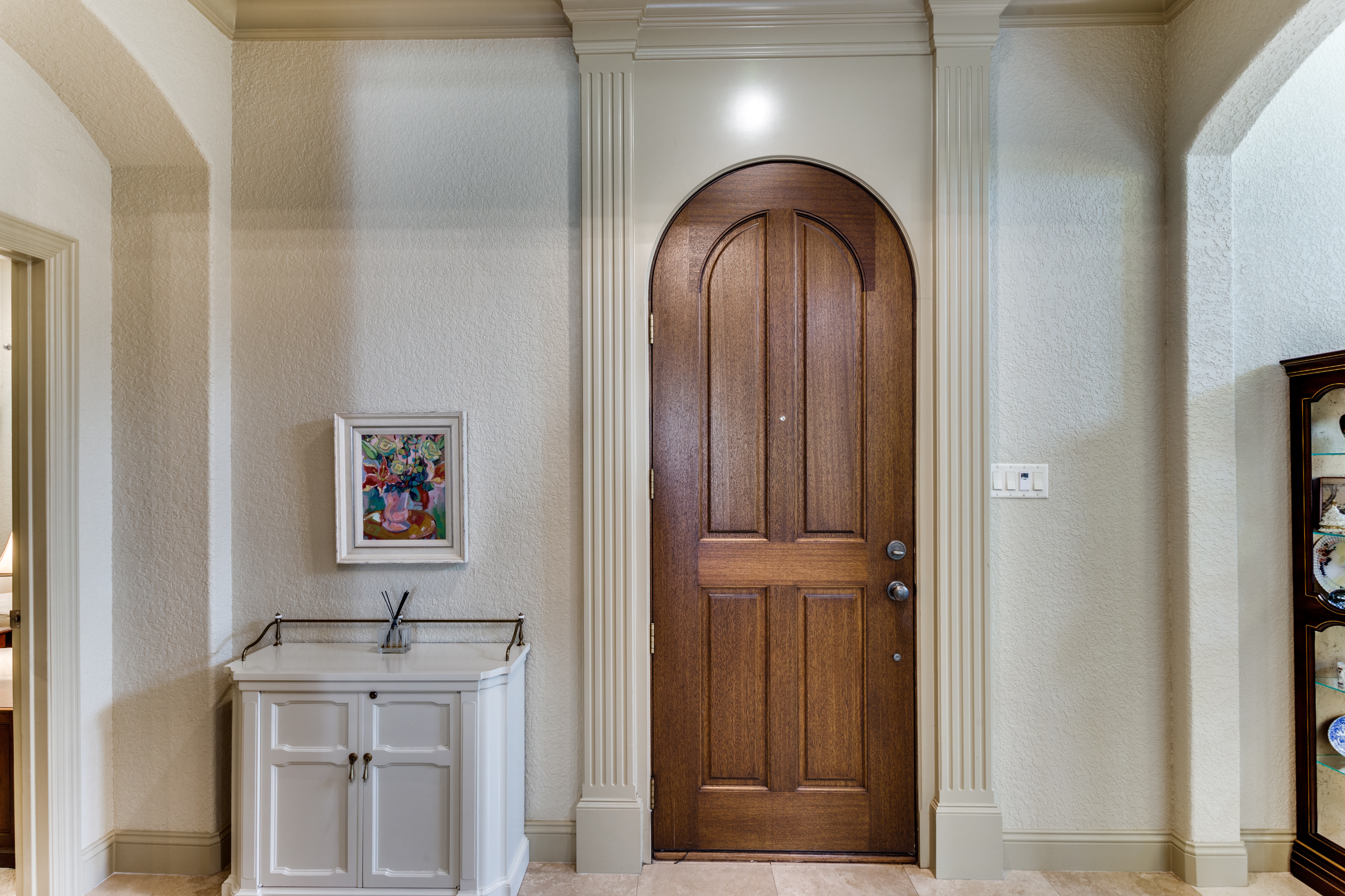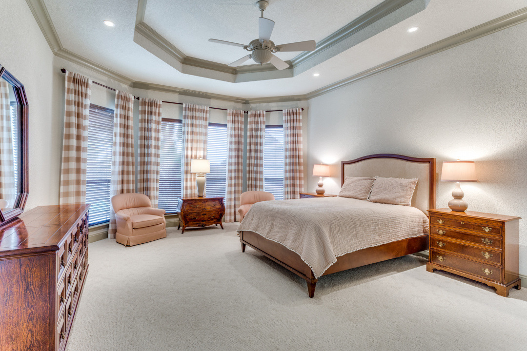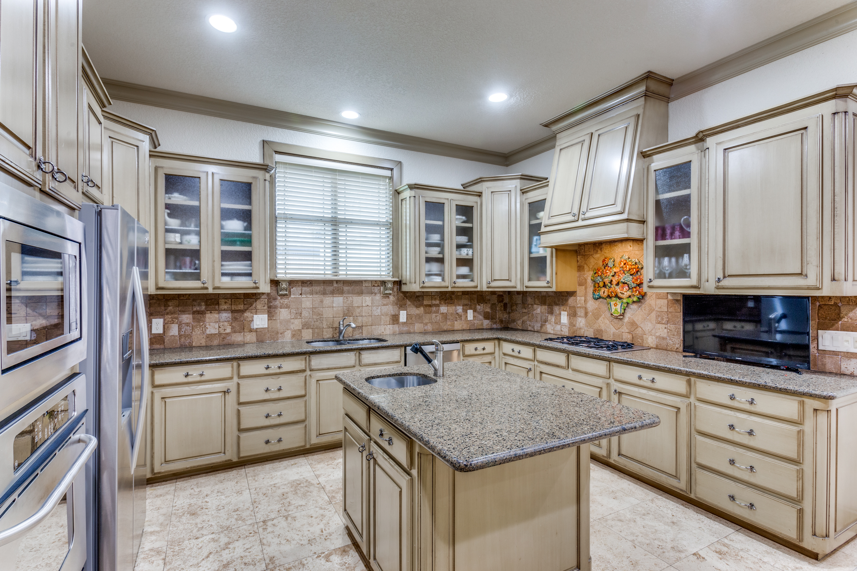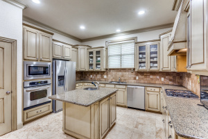 This property features an open floor plan that flows from room to room through expansive doorways. The view from the entry is through a dining area to the backyard covered patio. The living room is a spacious airy space, containing an impressive chandelier, a gas log fireplace and this area is flooded with light from dormer windows located in the vaulted ceiling. The kitchen includes a work sink and prep sink, stainless appliances, an abundance of counter space and remarkable cabinet storage. All bedrooms are in separate areas of the home, and each has a private bath and walk-in closets. The primary suite is oversized and contains a sitting area surrounded by windows; an ensuite bath with 2 walk-in closets complete the room. The entire home contains travertine flooring, natural light from large windows, upgraded fixtures & lighting, and the property is positioned in a quiet courtyard for privacy.