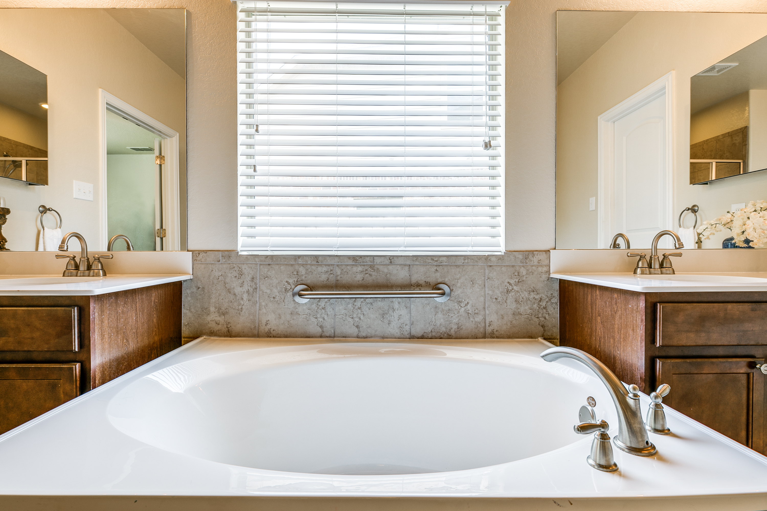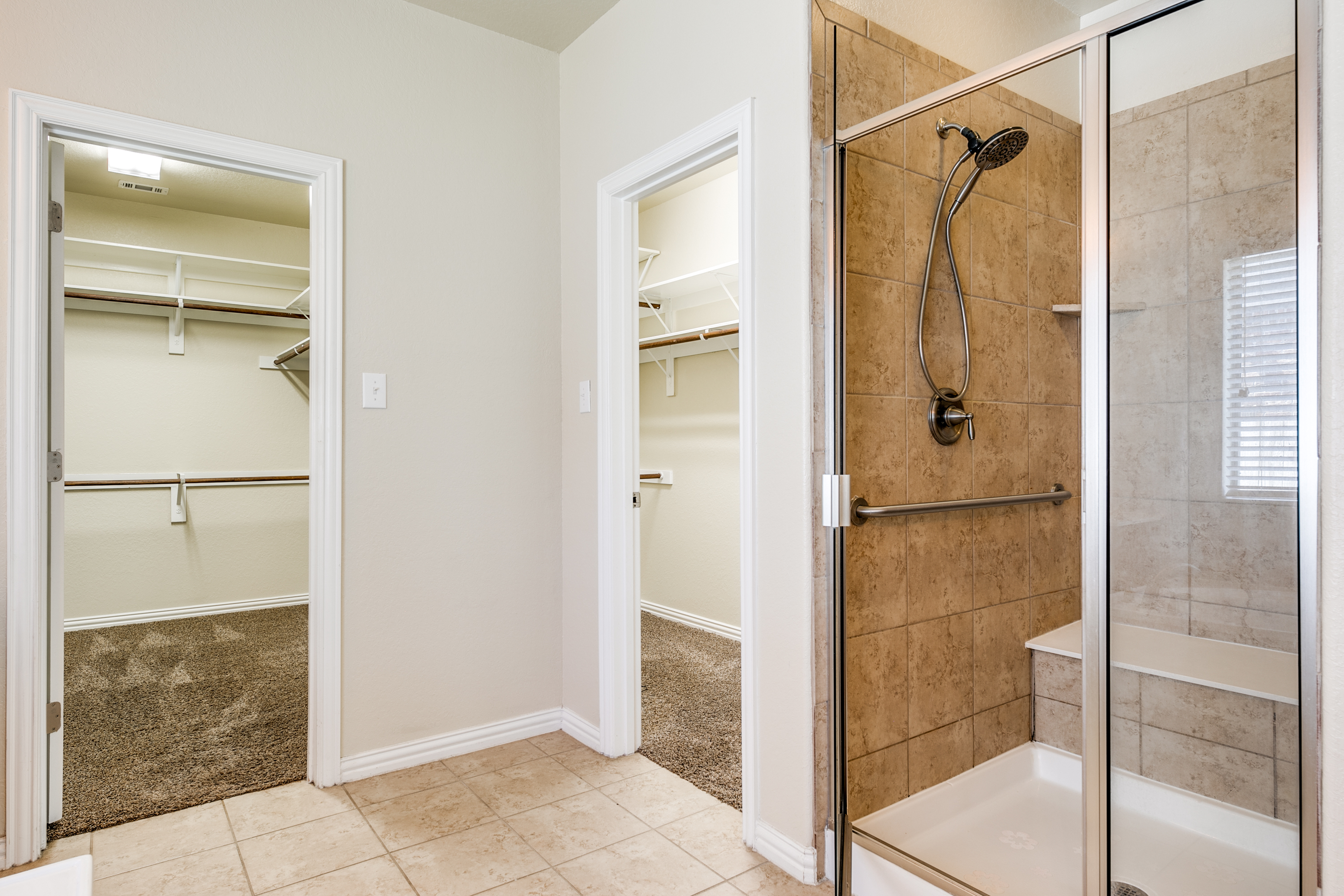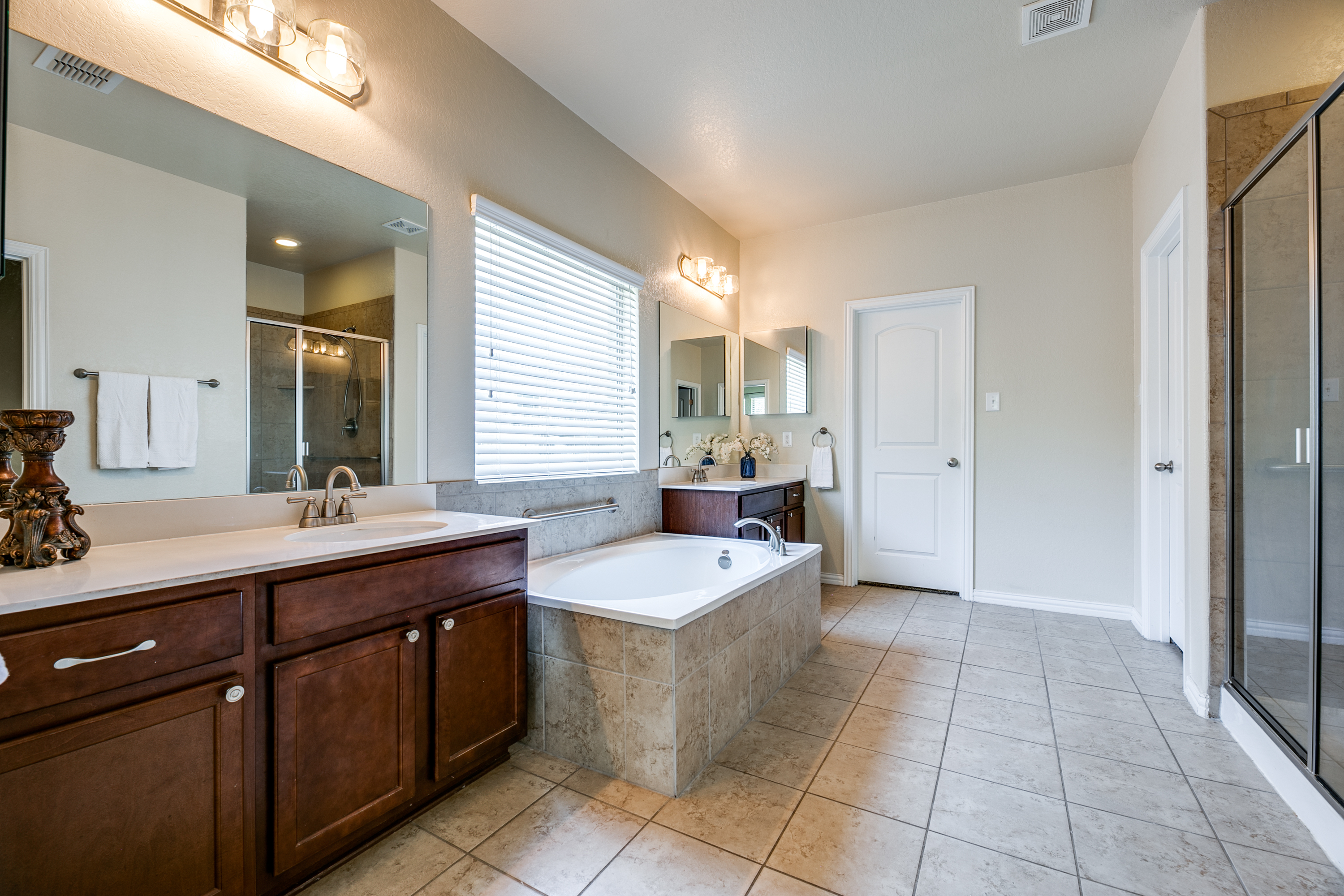 • Master suite with natural lighting, small living space, double closets, double sinks, an oversized tub, and open shower.