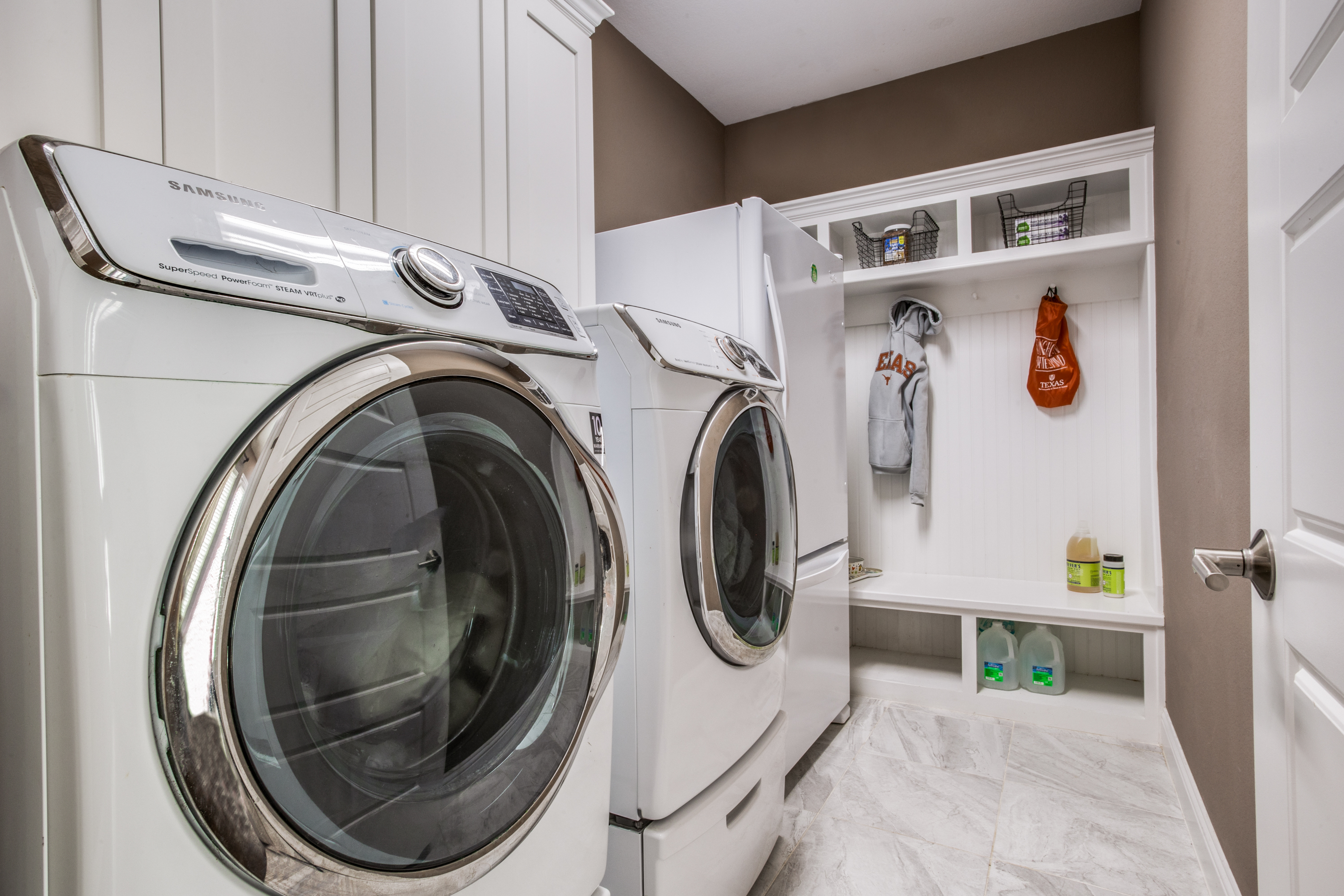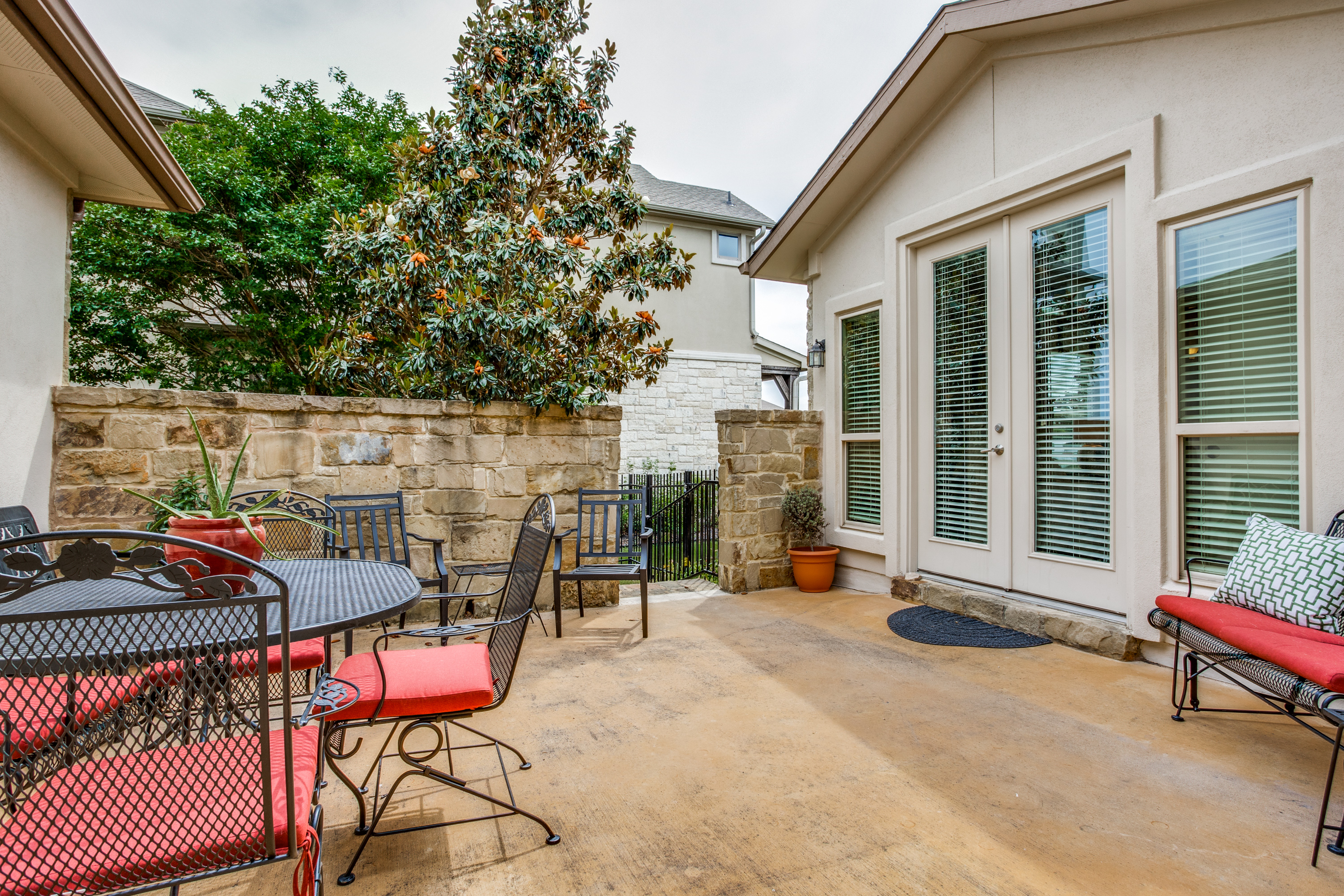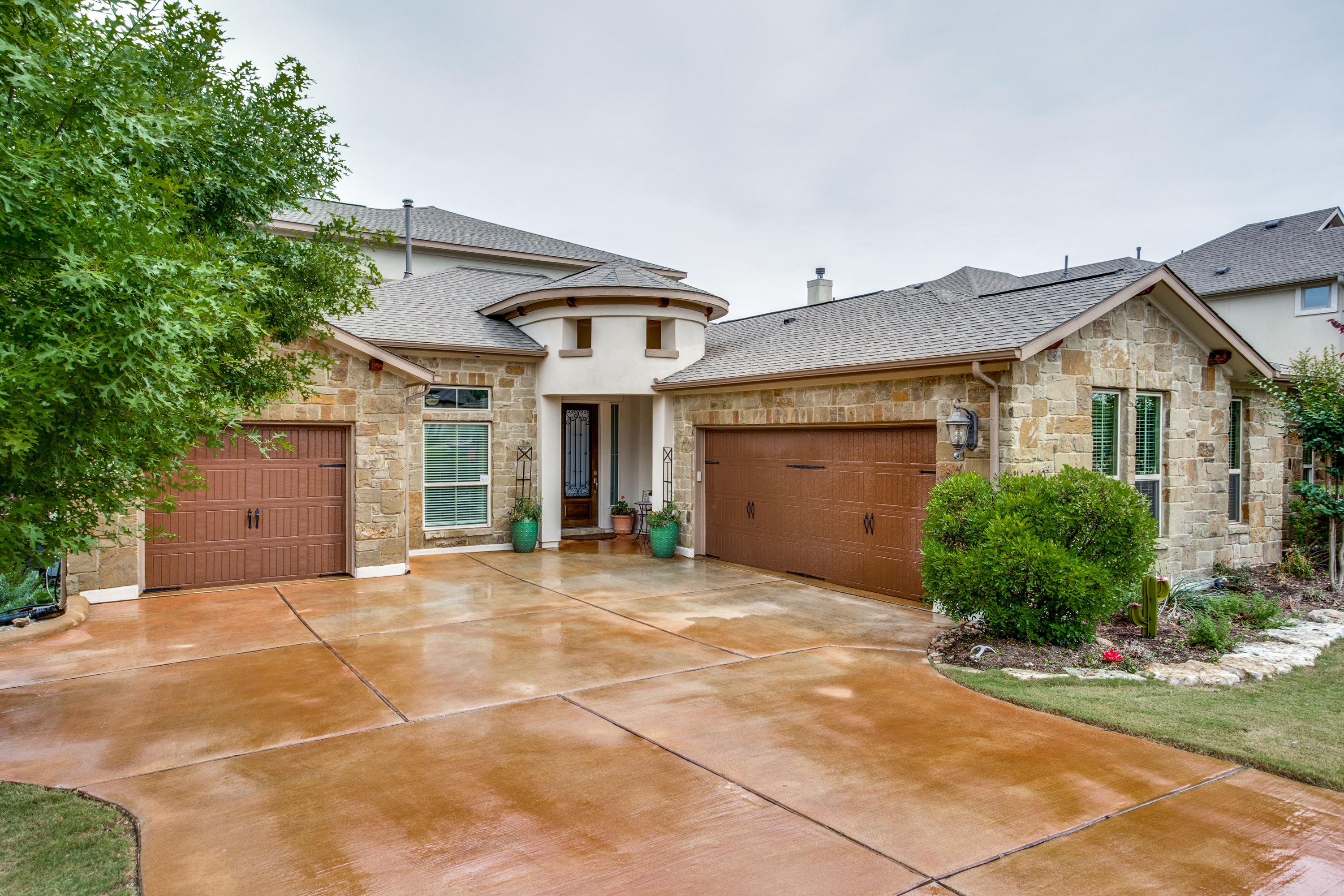 The four-sided stone and stucco exterior were recently painted, has solar boards in the attic and 2 tankless water heaters which help make a more energy-efficient home, 5 security cameras, and professional lighting on the front of the home, and professional landscaping for year-round low maintenance color.