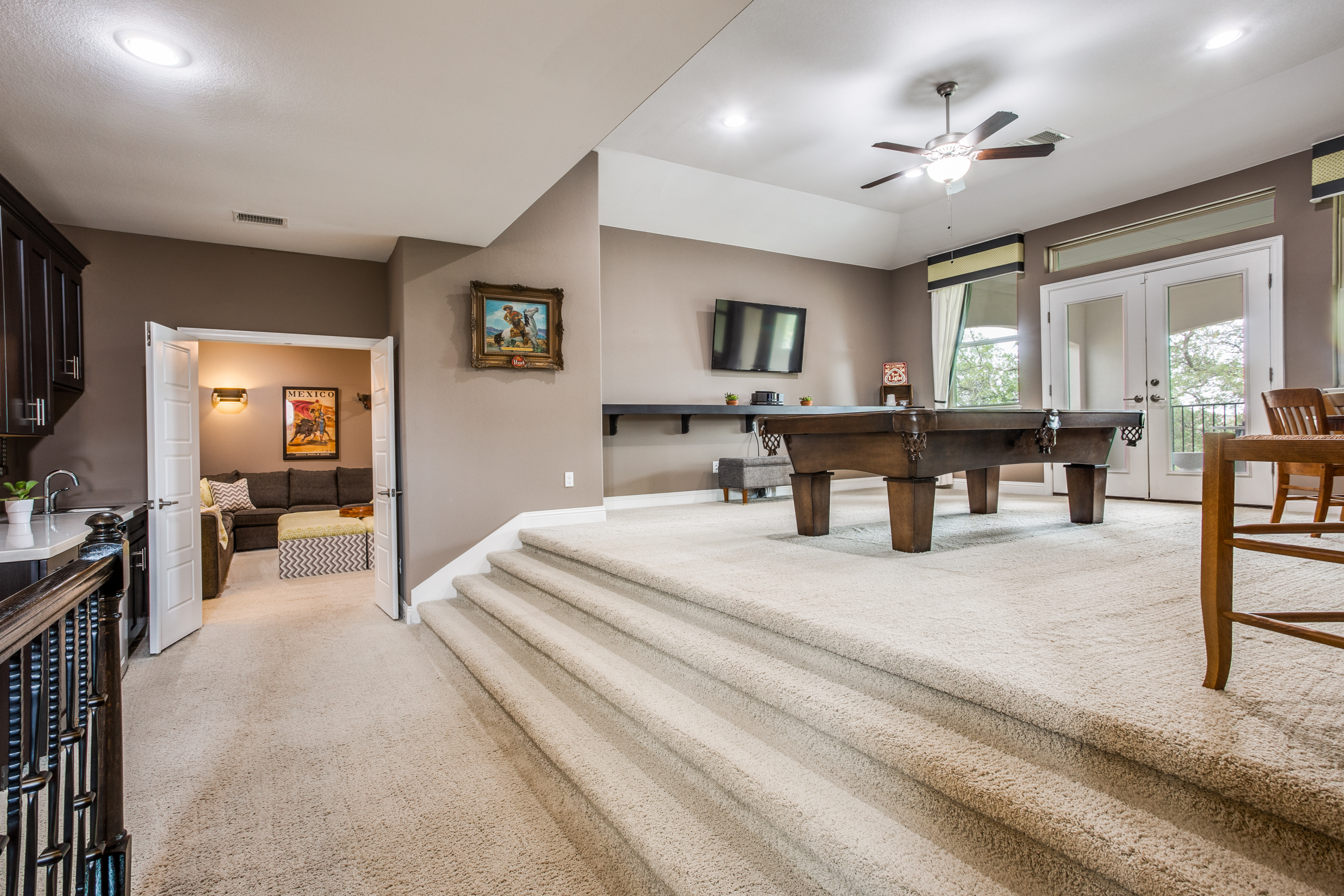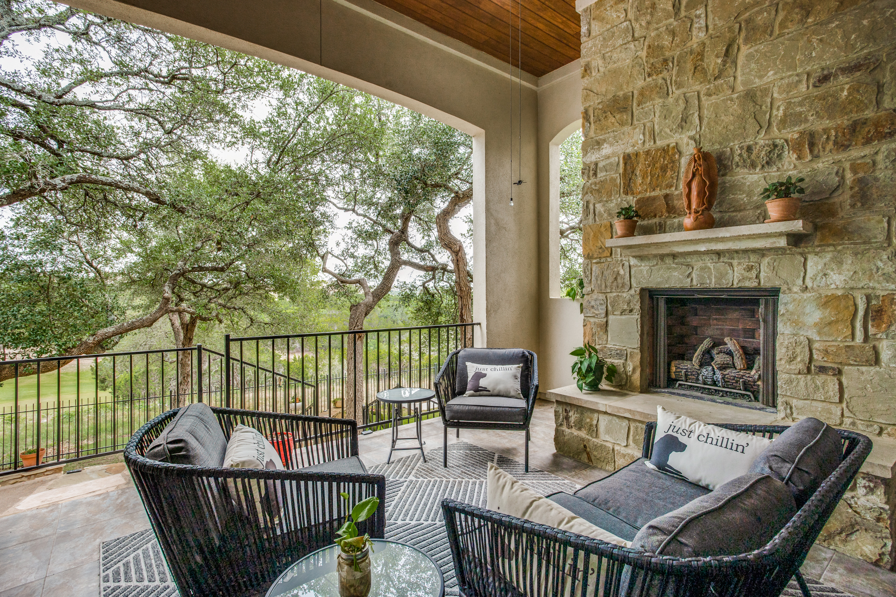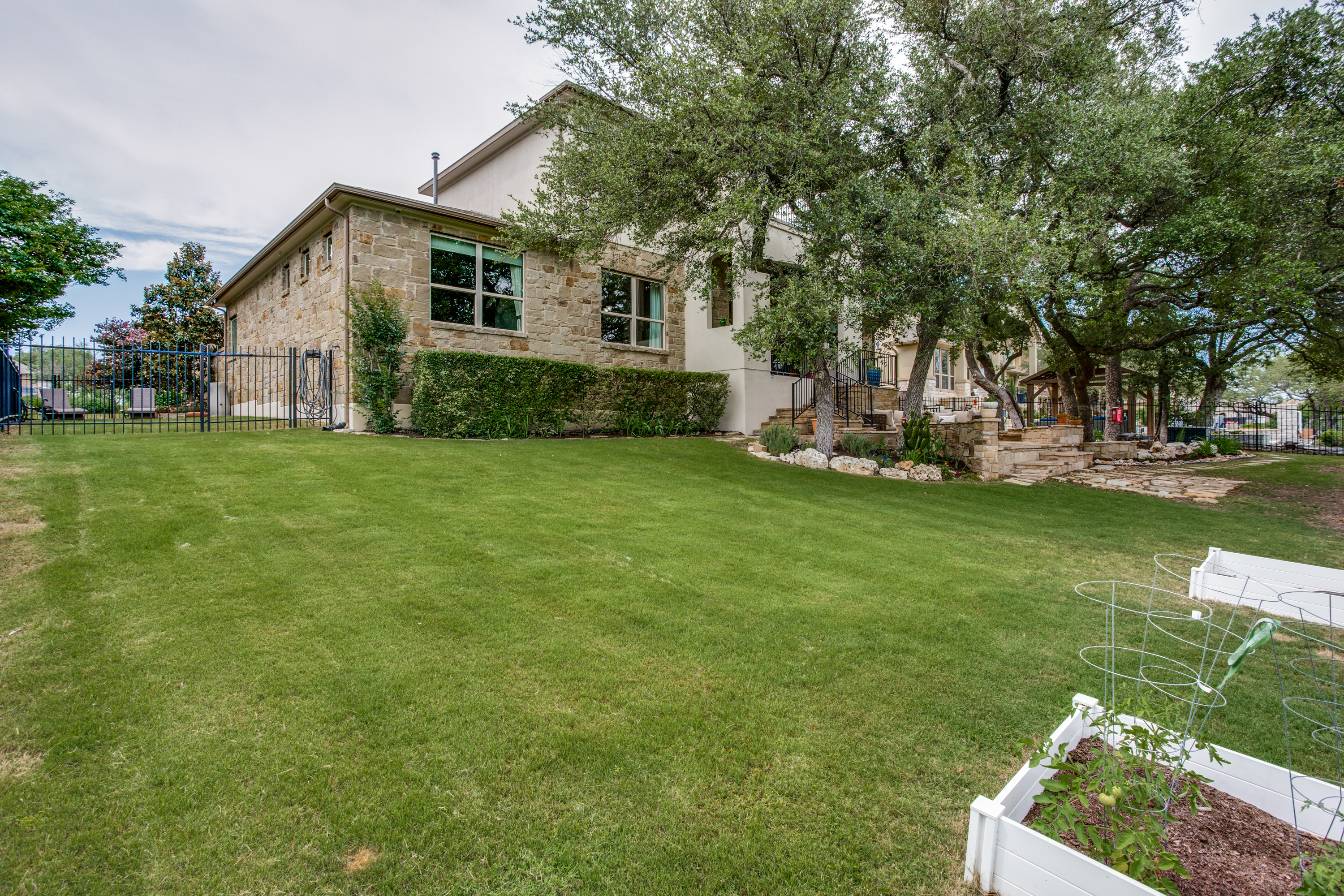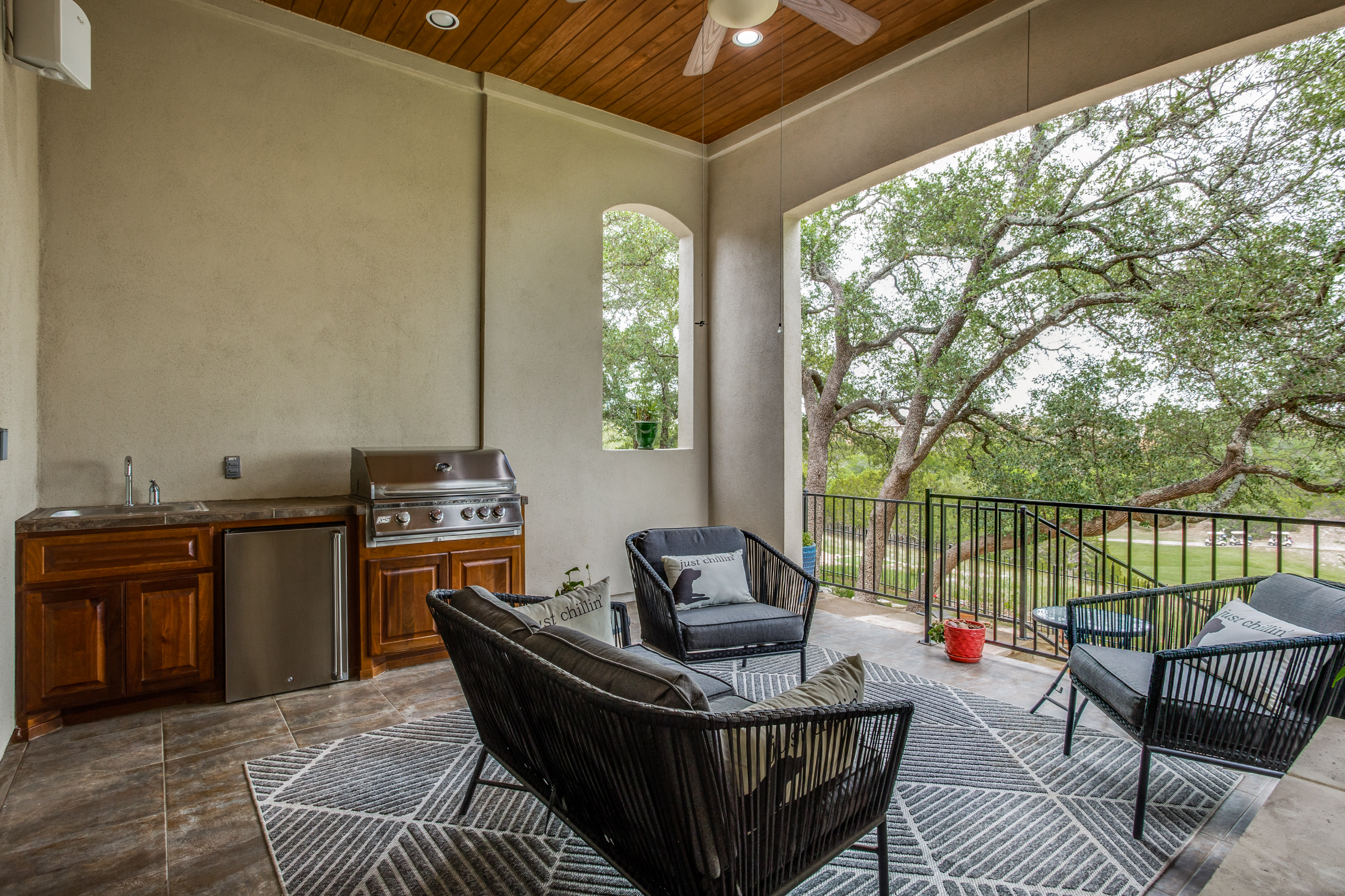 The main owners’ suite is complemented with a spa experience walk-in shower and soaking tub bathroom. The private additional owner suite has a walk-in shower and private access to an outdoor patio. Enjoy high-end designer details throughout the home with newly painted bright walls (06/22), crown molding, coffered ceilings, and hardwood floors. The main floor living room has access to the covered porch with a stone fireplace, an outdoor kitchen with a sink/fridge, and a built-in grill. The fully fenced backyard has a multi-tiered stone patio, surrounded by trees, providing hours of shade, an herb garden, and professional landscaping with exterior lighting. The spacious 2nd floor includes a 5th bedroom and 4th full bath, wet bar, and game room with a 2nd-floor outdoor balcony, and a media room accompanied by a large HDTV, surround sound system, and built-in cabinets.
