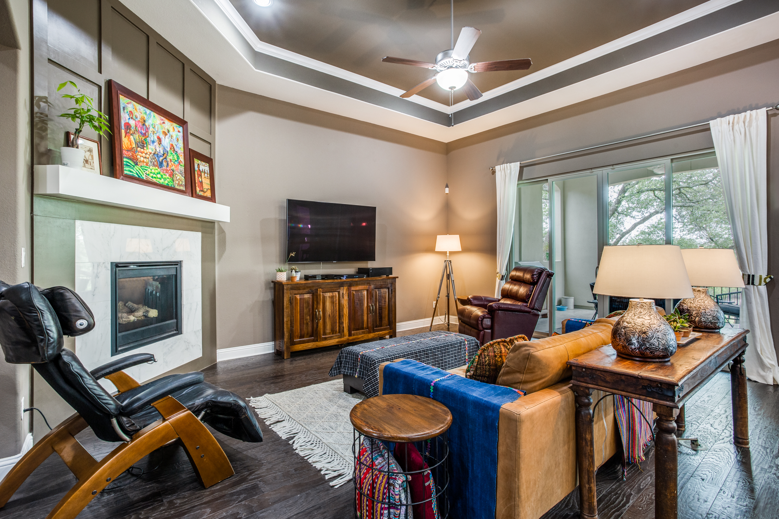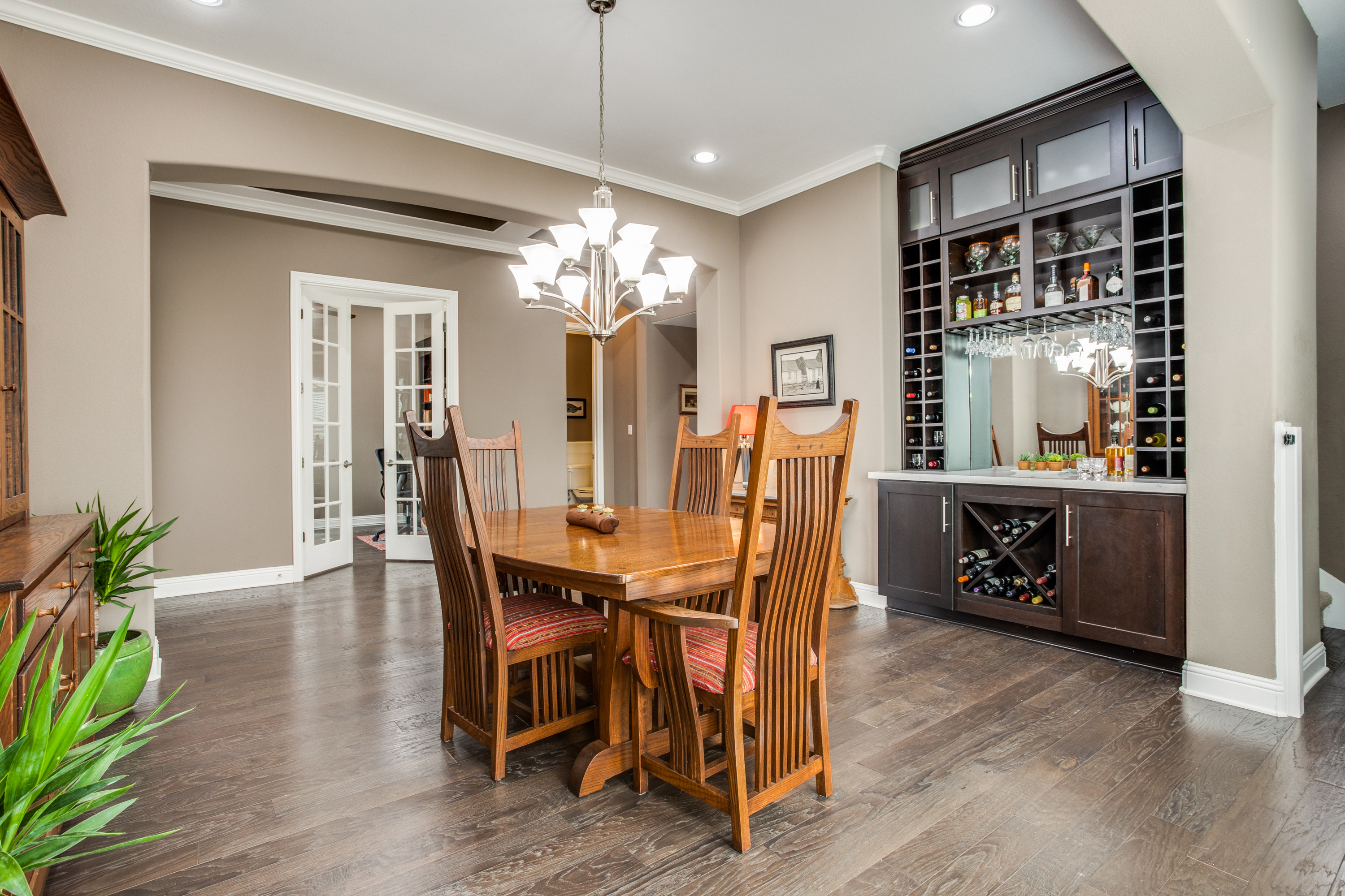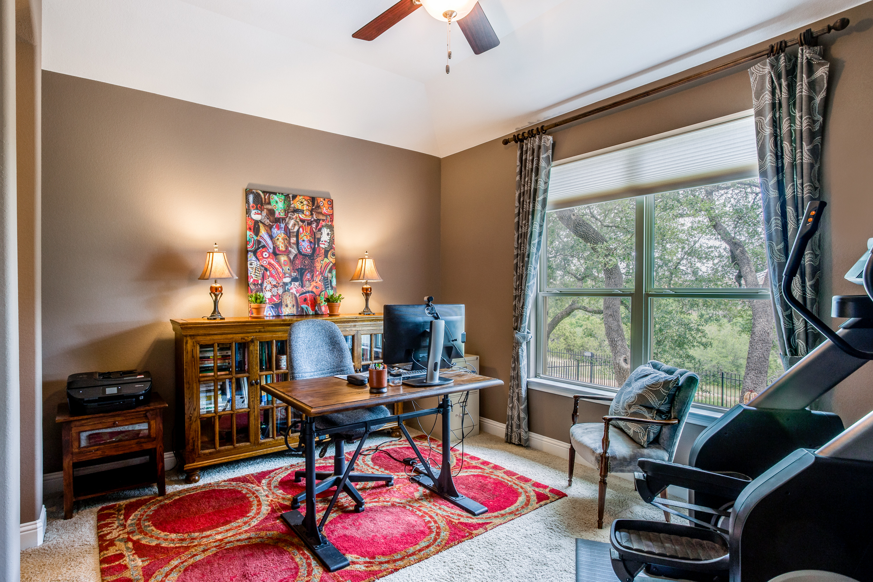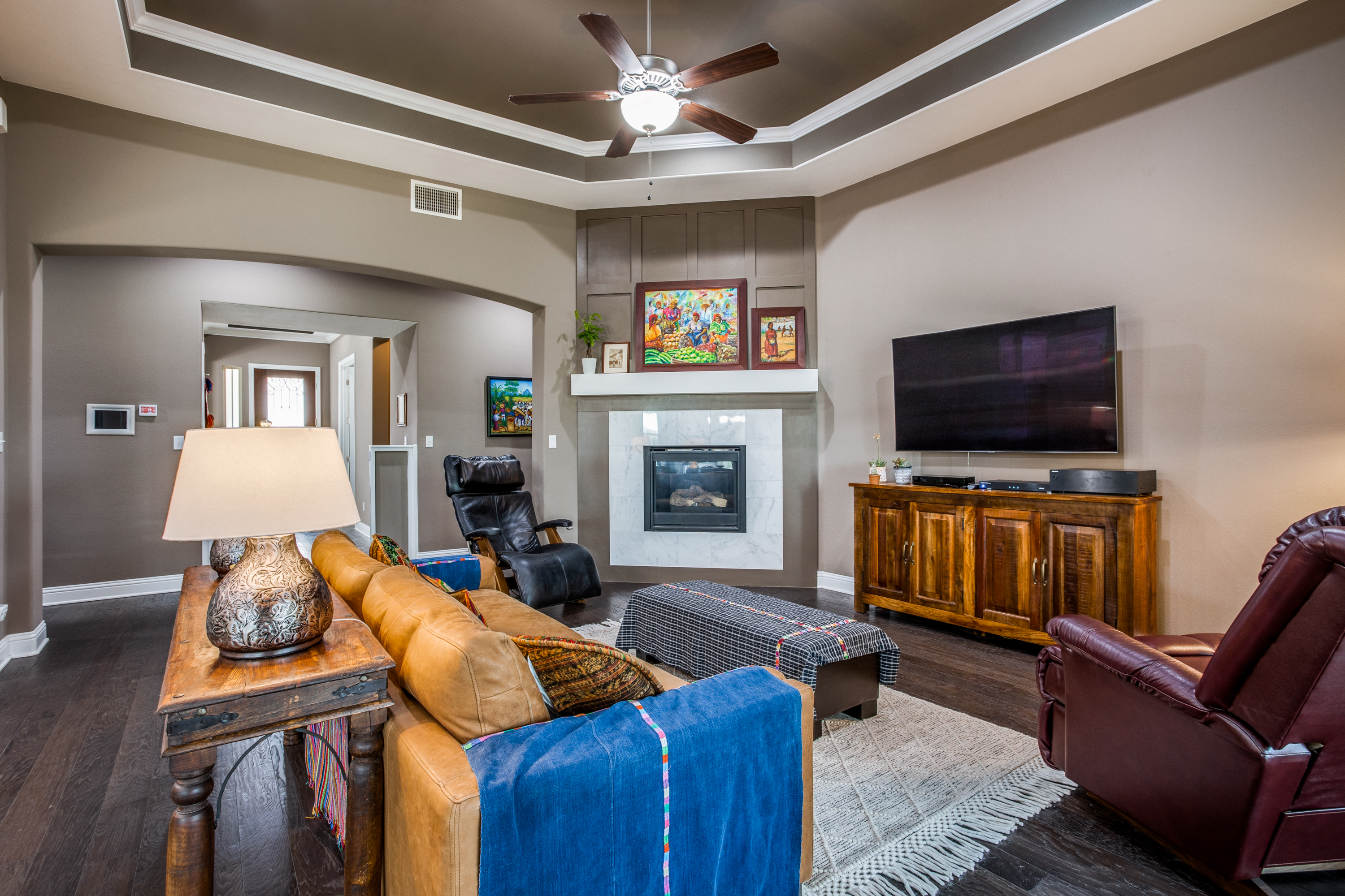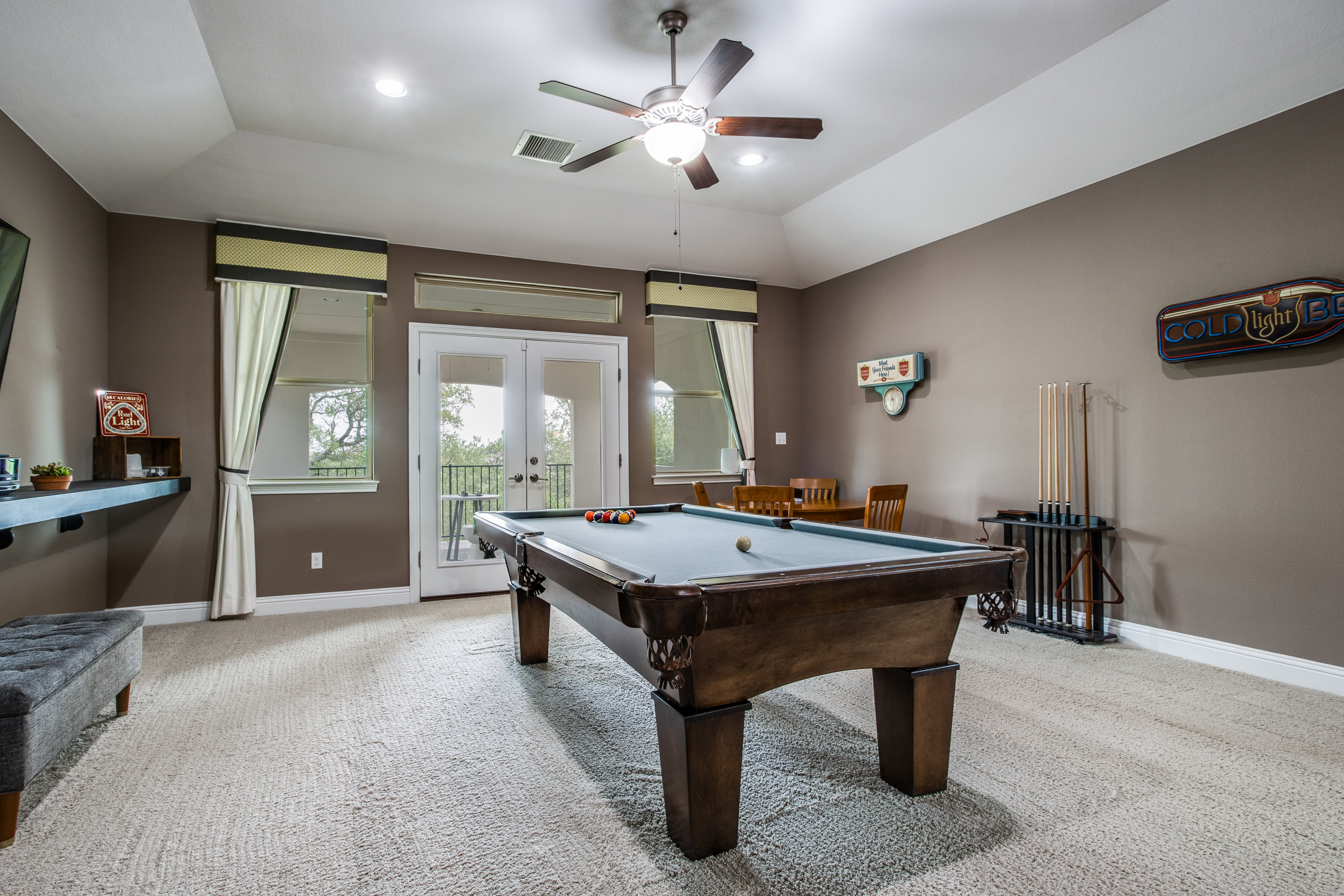 The main owners’ suite is complemented with a spa experience walk-in shower and soaking tub bathroom. The private additional owner suite has a walk-in shower and private access to an outdoor patio. Enjoy high-end designer details throughout the home with newly painted bright walls (06/22), crown molding, coffered ceilings, and hardwood floors. The main floor living room has access to the covered porch with a stone fireplace, an outdoor kitchen with a sink/fridge, and a built-in grill. The fully fenced backyard has a multi-tiered stone patio, surrounded by trees, providing hours of shade, an herb garden, and professional landscaping with exterior lighting. The spacious 2nd floor includes a 5th bedroom and 4th full bath, wet bar, and game room with a 2nd-floor outdoor balcony, and a media room accompanied by a large HDTV, surround sound system, and built-in cabinets.