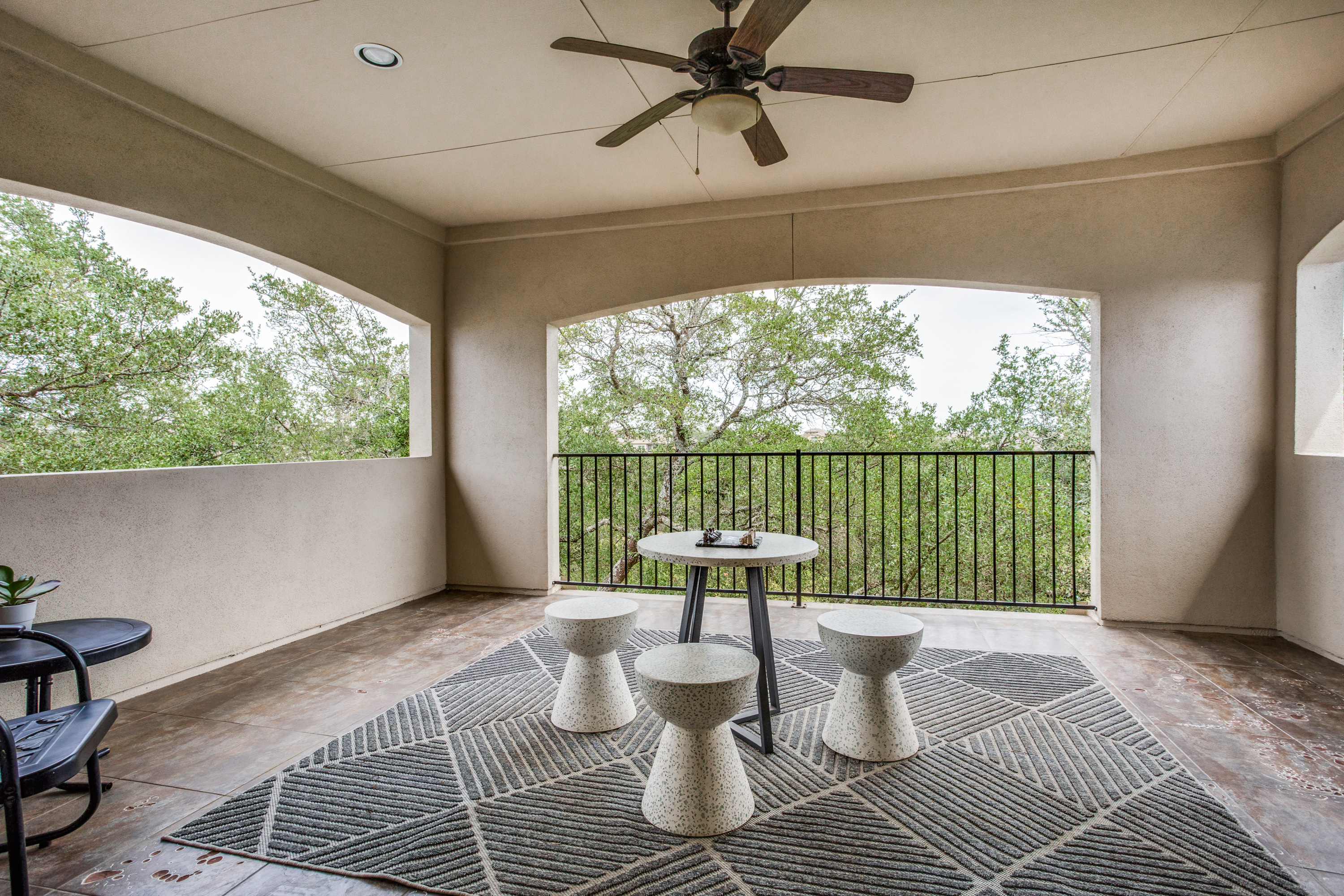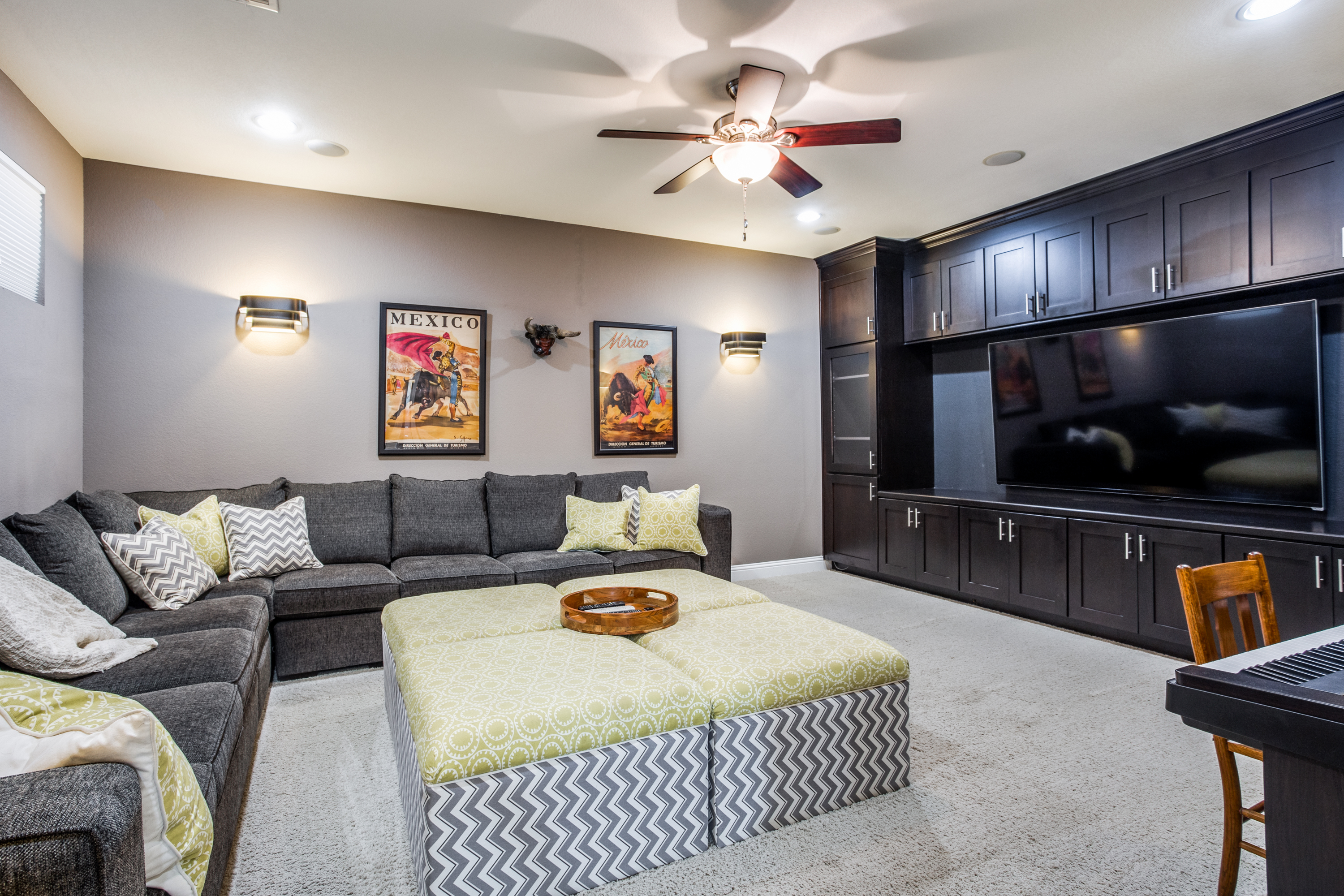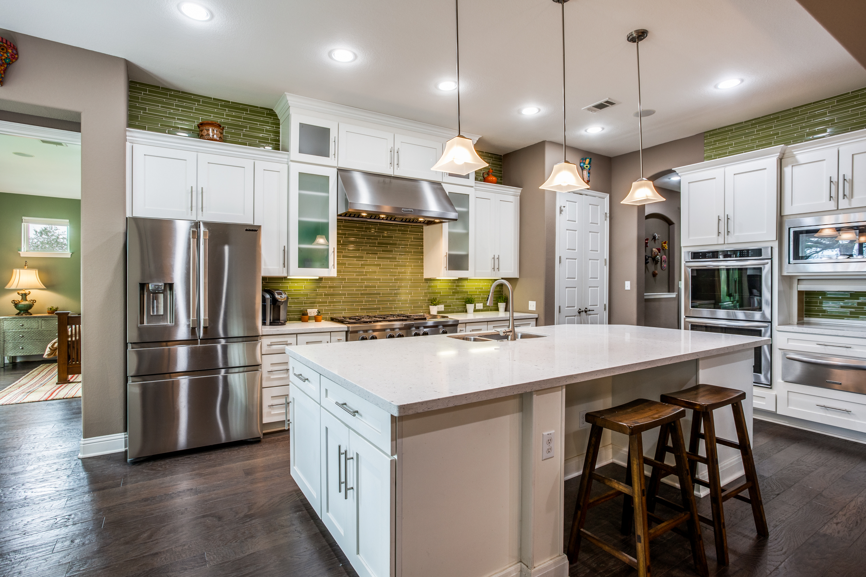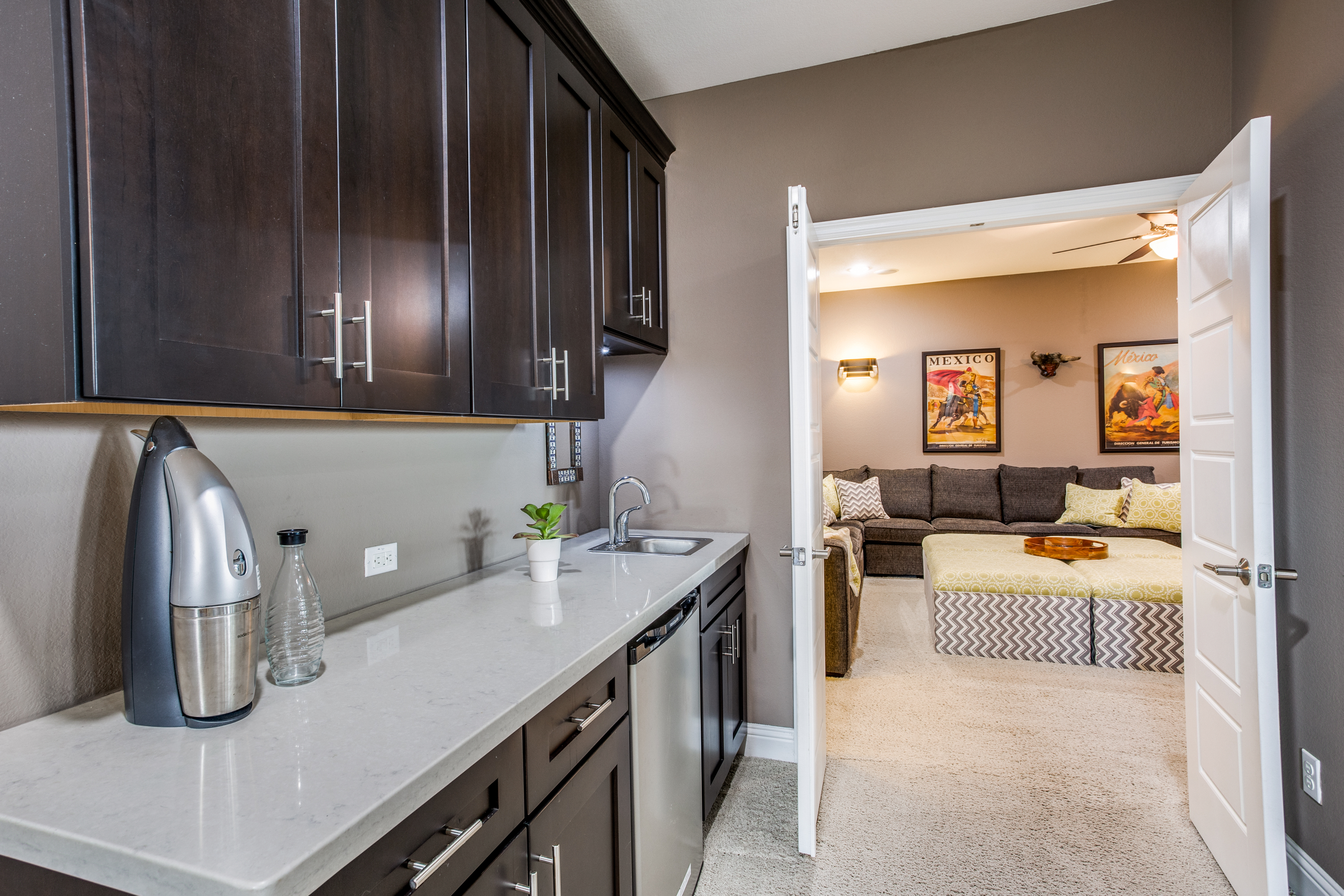 The main owners’ suite is complemented with a spa experience walk-in shower and soaking tub bathroom. The private additional owner suite has a walk-in shower and private access to an outdoor patio. Enjoy high-end designer details throughout the home with newly painted bright walls (06/22), crown molding, coffered ceilings, and hardwood floors. The main floor living room has access to the covered porch with a stone fireplace, an outdoor kitchen with a sink/fridge, and a built-in grill. The fully fenced backyard has a multi-tiered stone patio, surrounded by trees, providing hours of shade, an herb garden, and professional landscaping with exterior lighting. The spacious 2nd floor includes a 5th bedroom and 4th full bath, wet bar, and game room with a 2nd-floor outdoor balcony, and a media room accompanied by a large HDTV, surround sound system, and built-in cabinets.
