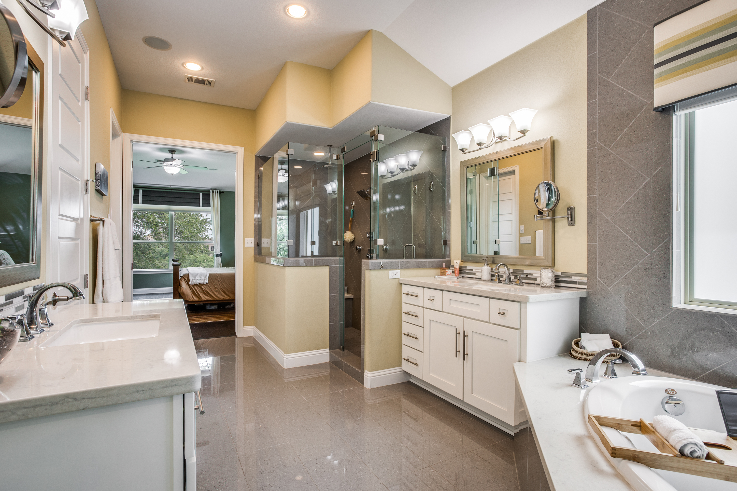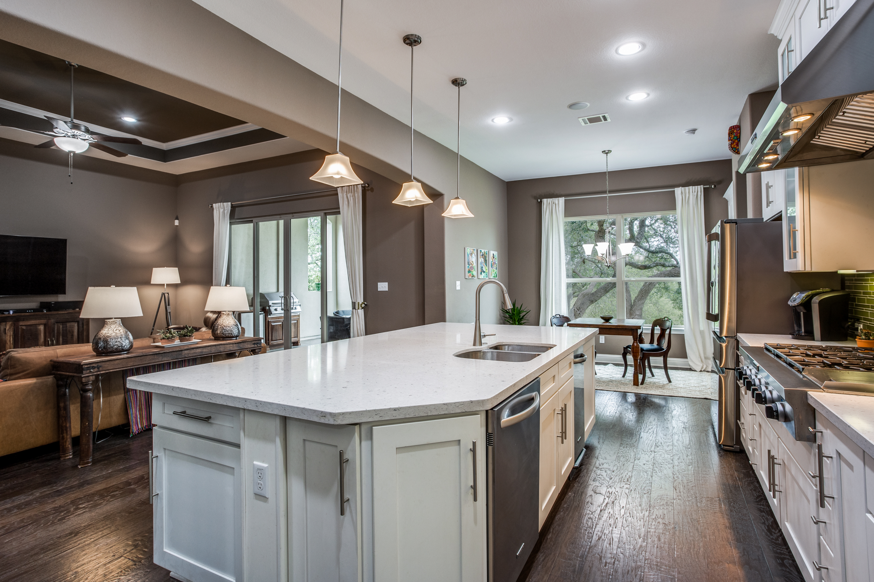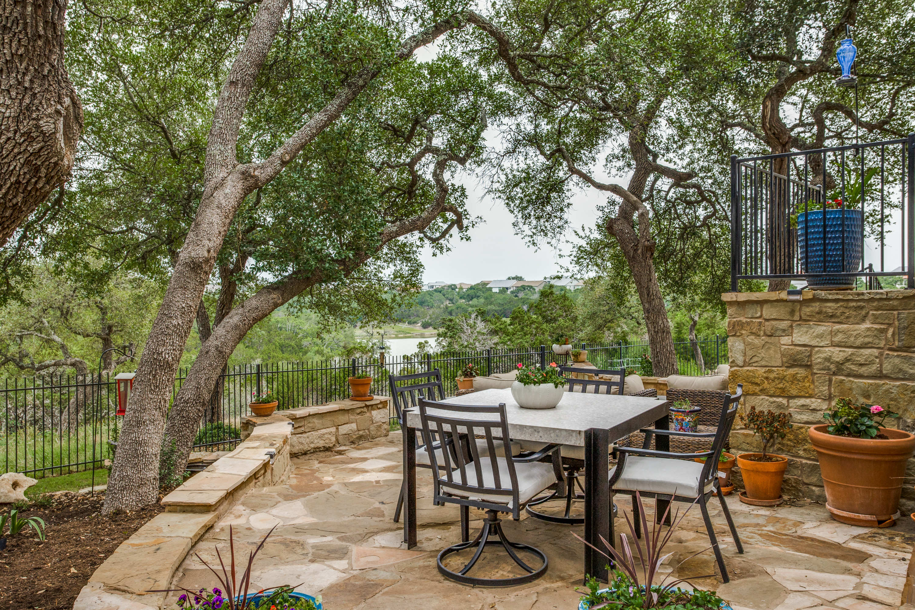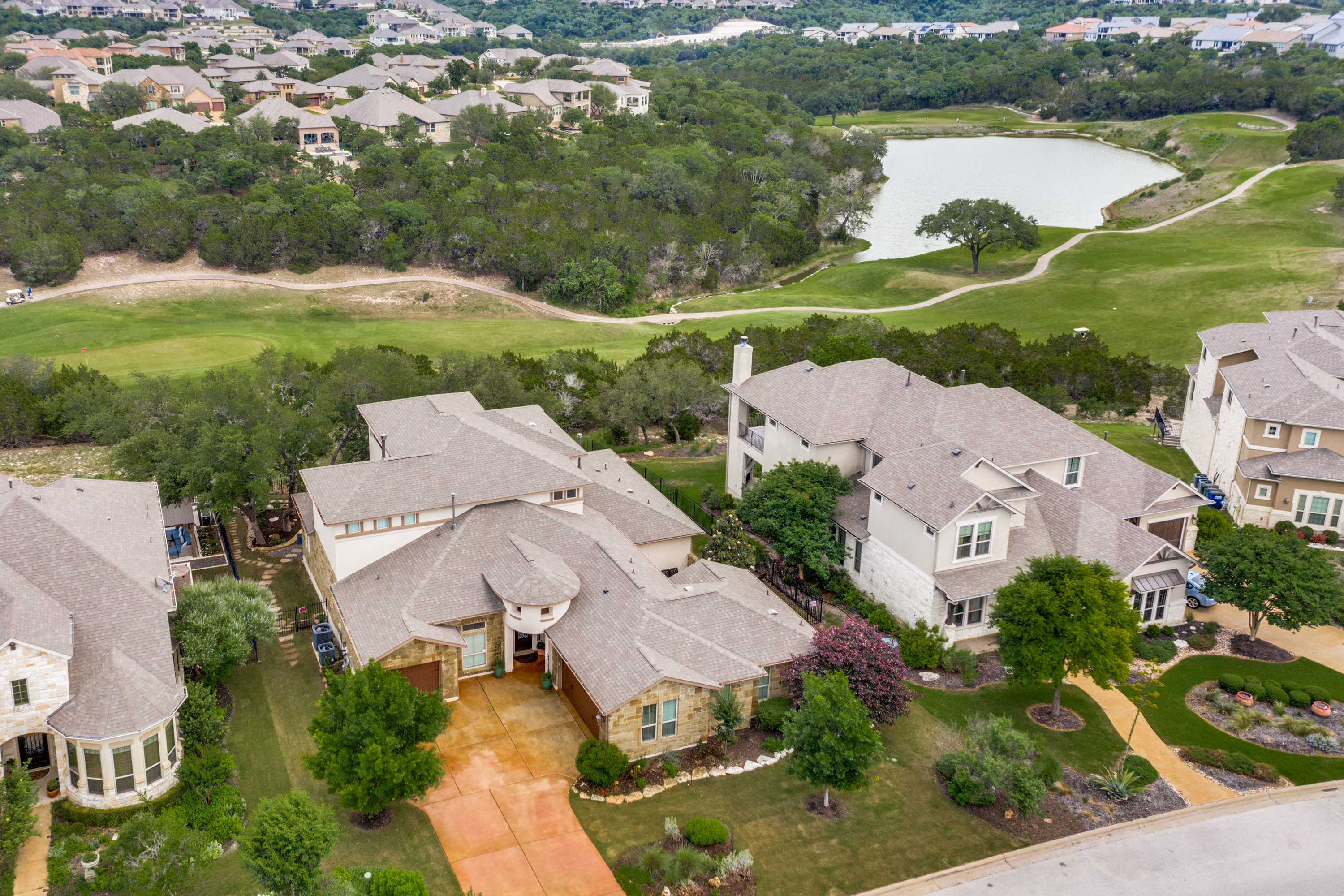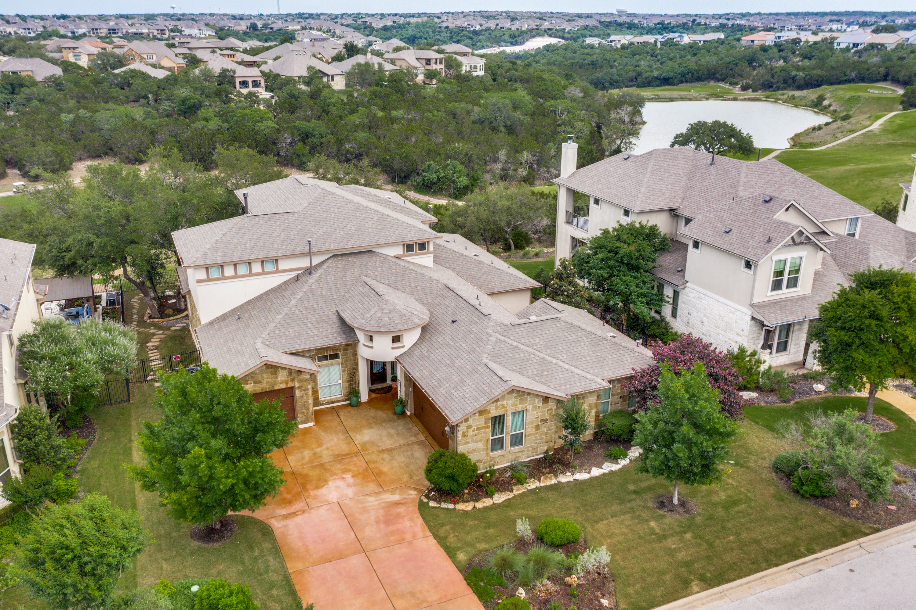 Owners will enjoy this former Grand Haven model built with over $300K in builder/owner upgrades in the highly desired Crystal Falls Cap Rock Estates gated community. This luxury NW-facing home sits on a premium lot with views of the golf course and pond providing a private backyard paradise nestled under mature oaks. The design makes exceptional use of 4,446/SF with 4 outdoor patios and room for a pool. The spacious first floor has 4 bedrooms, including 2 owner suites, 3.5 baths, a formal dining area with a built-in buffet/wine bar, and an executive office with a built-in desk and bookcases. The eat-in kitchen with an extra-large quartz island is surrounded by KitchenAid pro-style appliances including a 6-burner gas range w/griddle, double convection oven, and warming drawer.