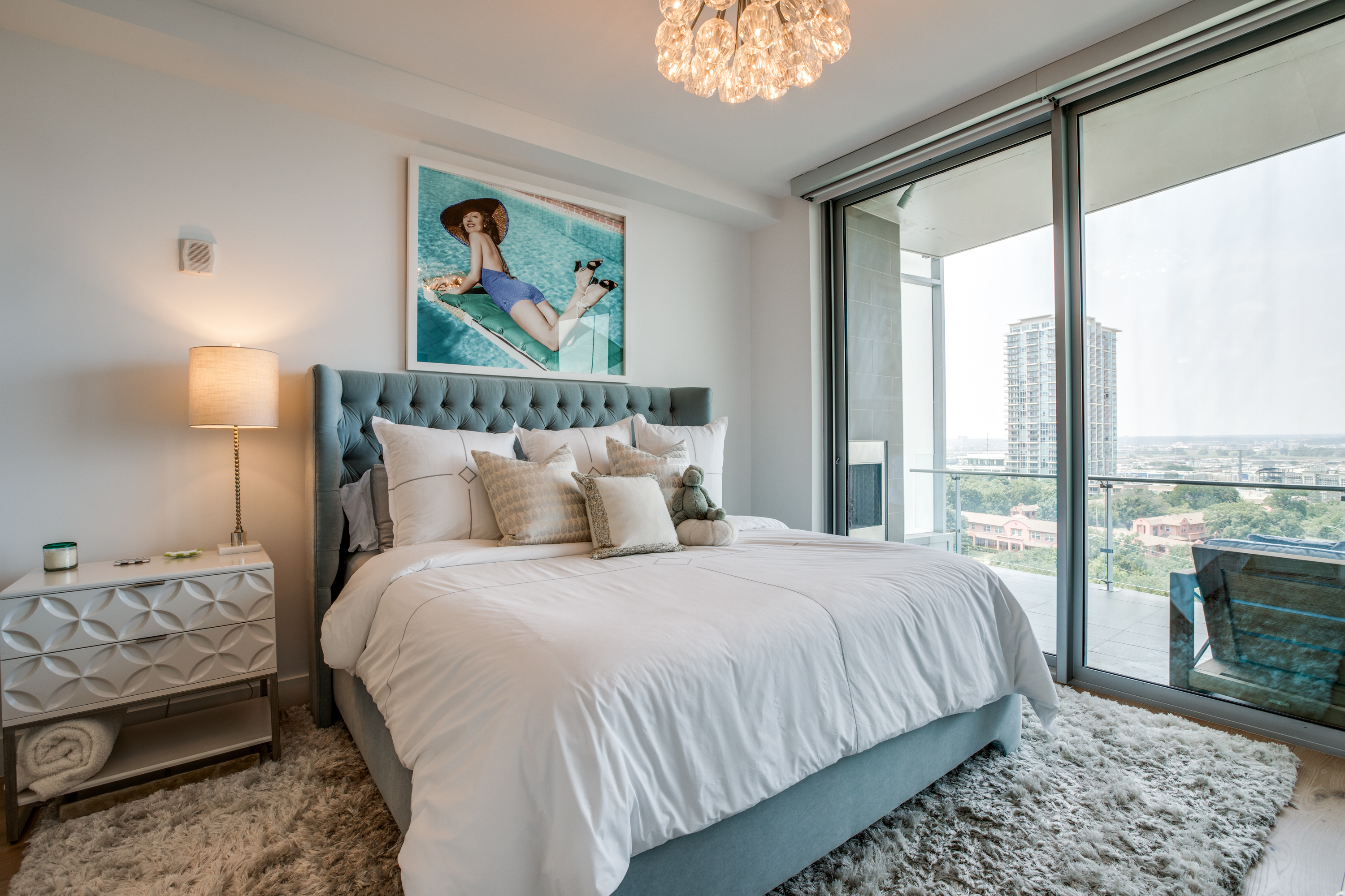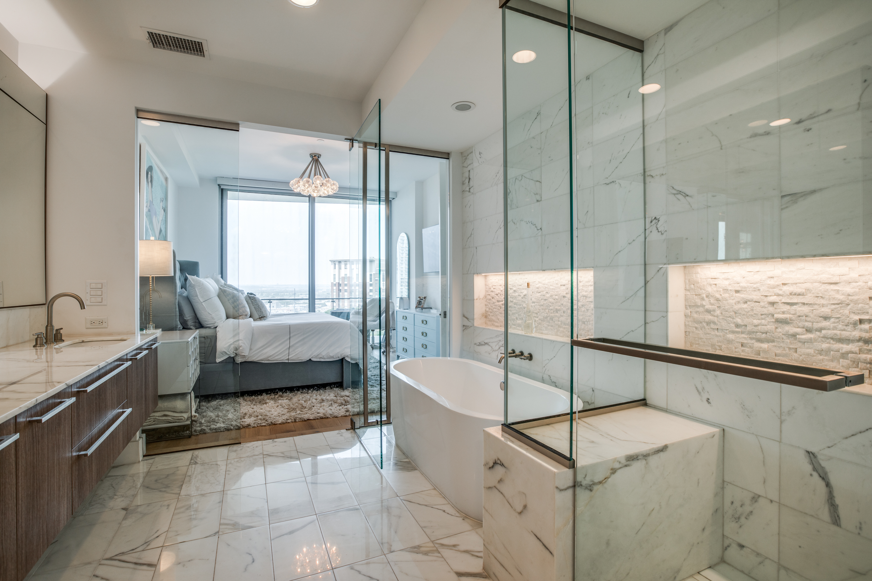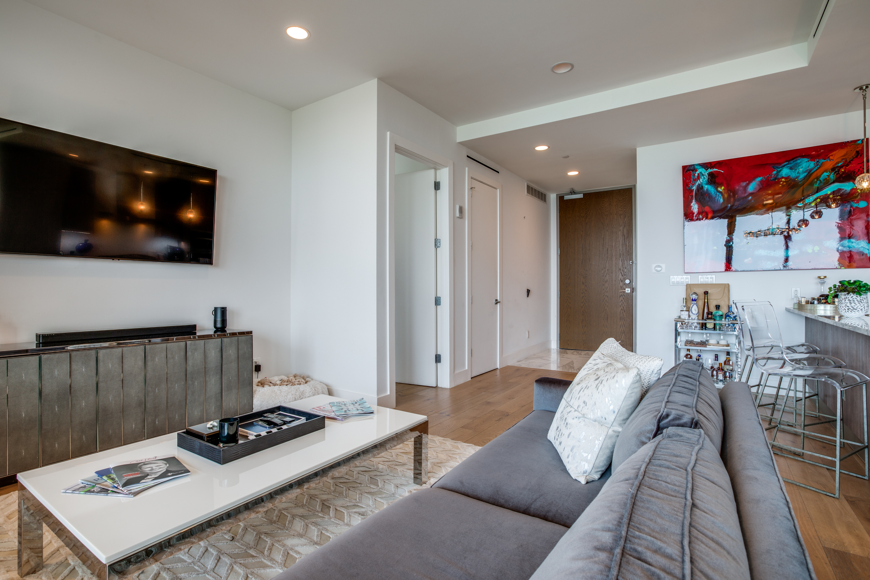 Executive fully furnished 2-bed condo with Resort style living at Bleu Ciel Condominium in Dallas! This modern unit comes with all Furniture, lamps and rugs, Bedding, Bath Linens, Dishes, Silverware, & Smart TV's with sound bars! Tons of upgrades including Wine cooler, Laundry room cabinets, Electric blinds, hardwoods and California Closets in both bedrooms, Restoration hardware lighting, Nest thermostats, Smart lock on front door. Floor to ceiling glass with incredible skyline views of Downtown, Victory Park & Trinity River from every room. Private katy trail access access or relax in the beautiful onsite Spa, Pool, fitness center & library. Bldg has a concierge, on-site dog run, private 2-car garage & more.