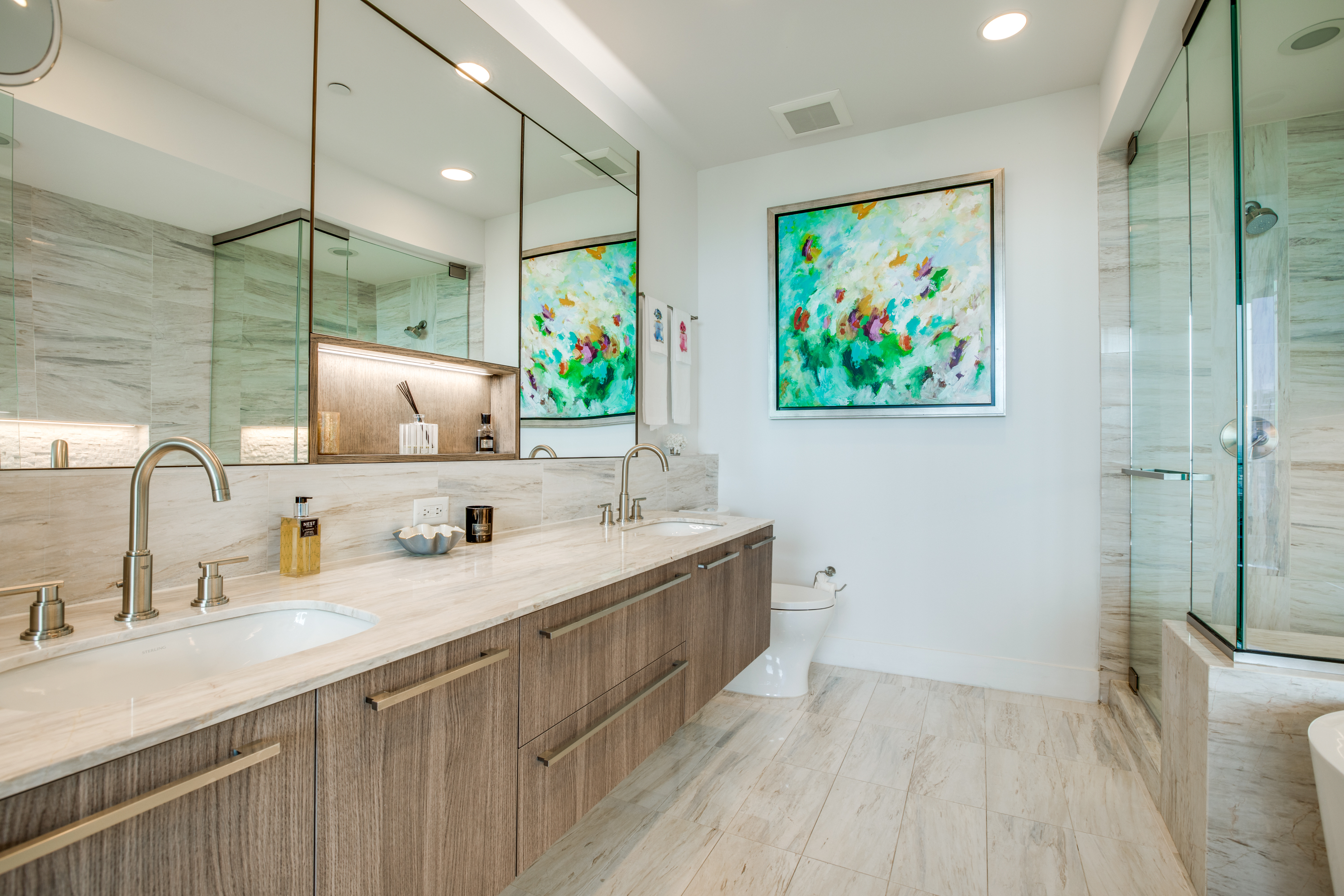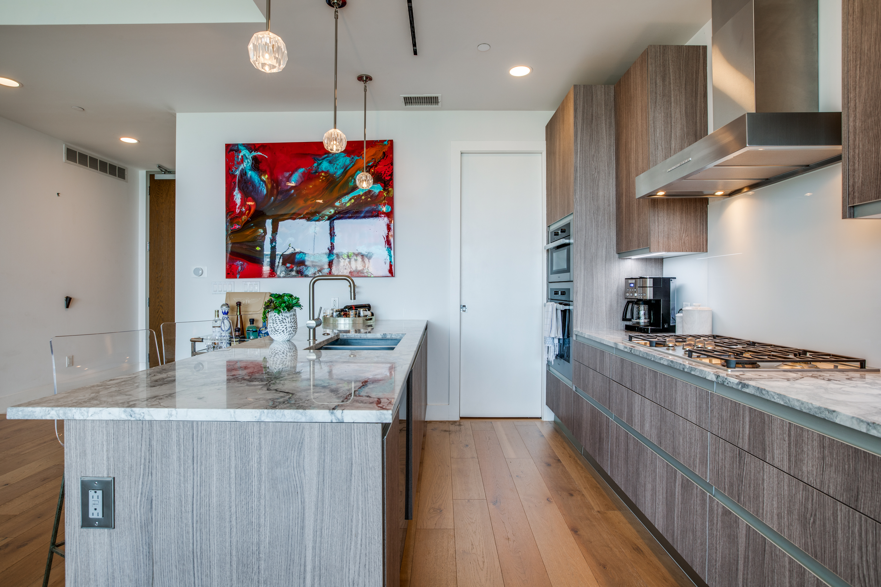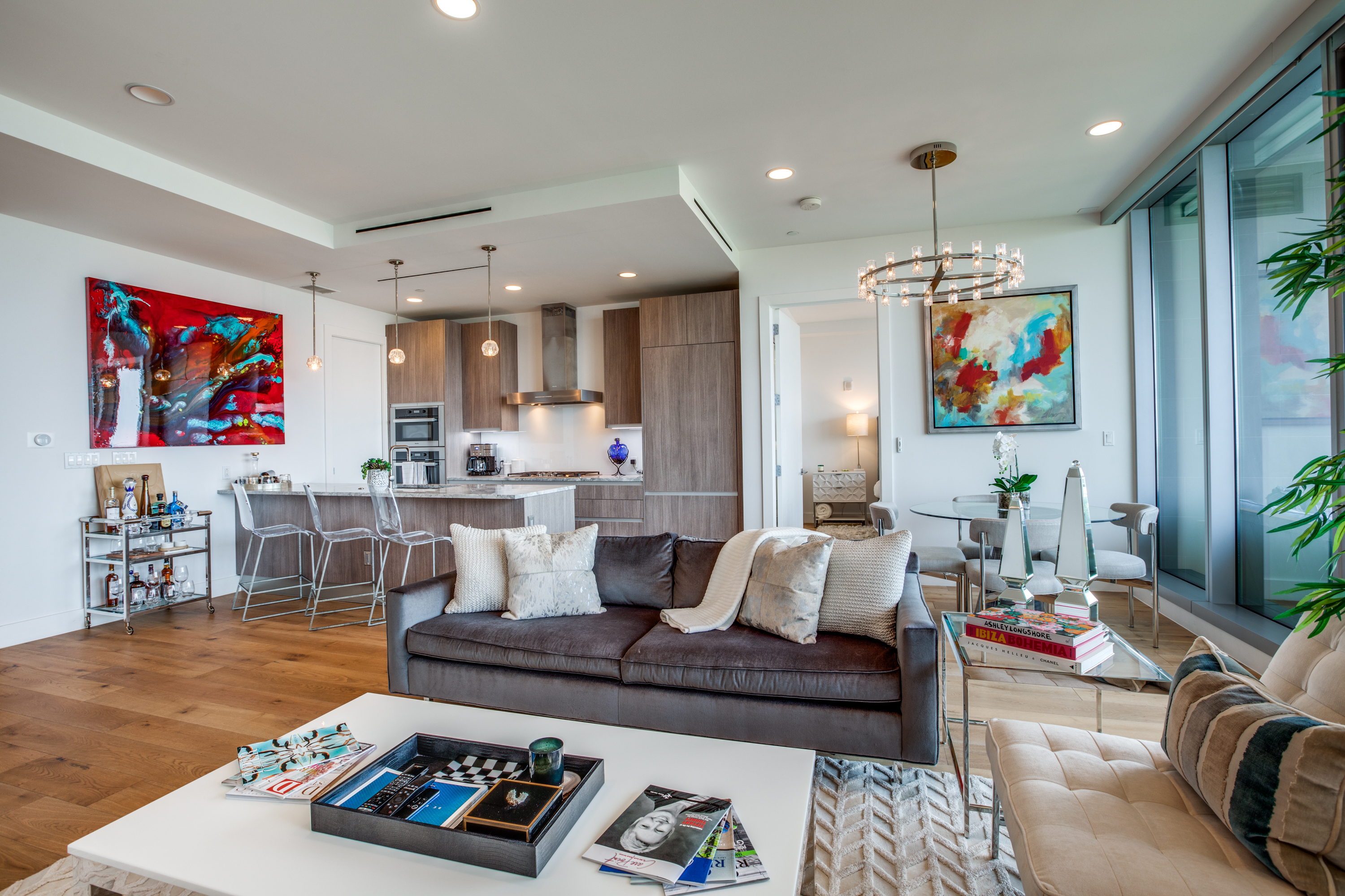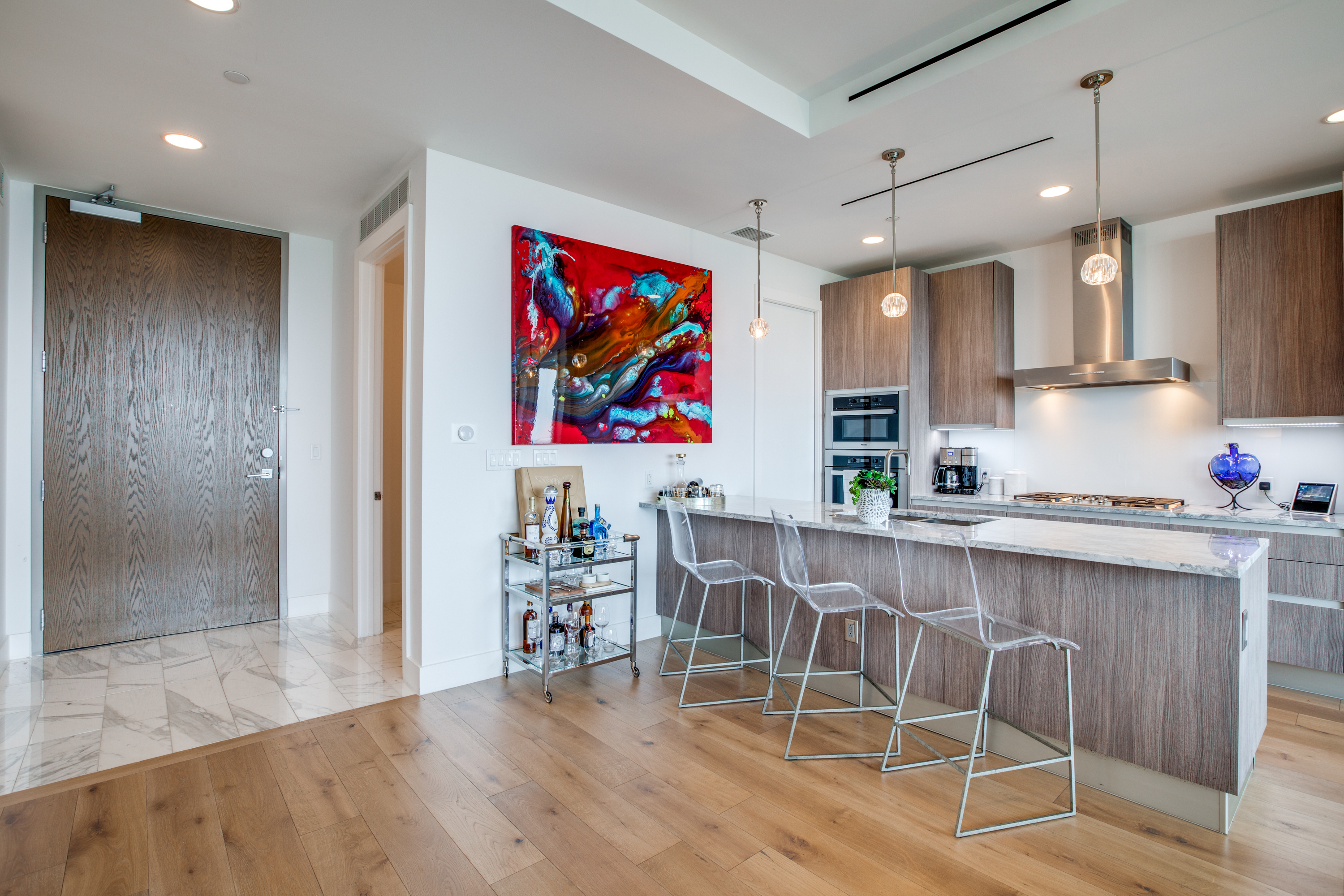 Executive fully furnished 2-bed condo with Resort style living at Bleu Ciel Condominium in Dallas! This modern unit comes with all Furniture, lamps and rugs, Bedding, Bath Linens, Dishes, Silverware, & Smart TV's with sound bars! Tons of upgrades including Wine cooler, Laundry room cabinets, Electric blinds, hardwoods and California Closets in both bedrooms, Restoration hardware lighting, Nest thermostats, Smart lock on front door. Floor to ceiling glass with incredible skyline views of Downtown, Victory Park & Trinity River from every room. Private katy trail access access or relax in the beautiful onsite Spa, Pool, fitness center & library. Bldg has a concierge, on-site dog run, private 2-car garage & more.