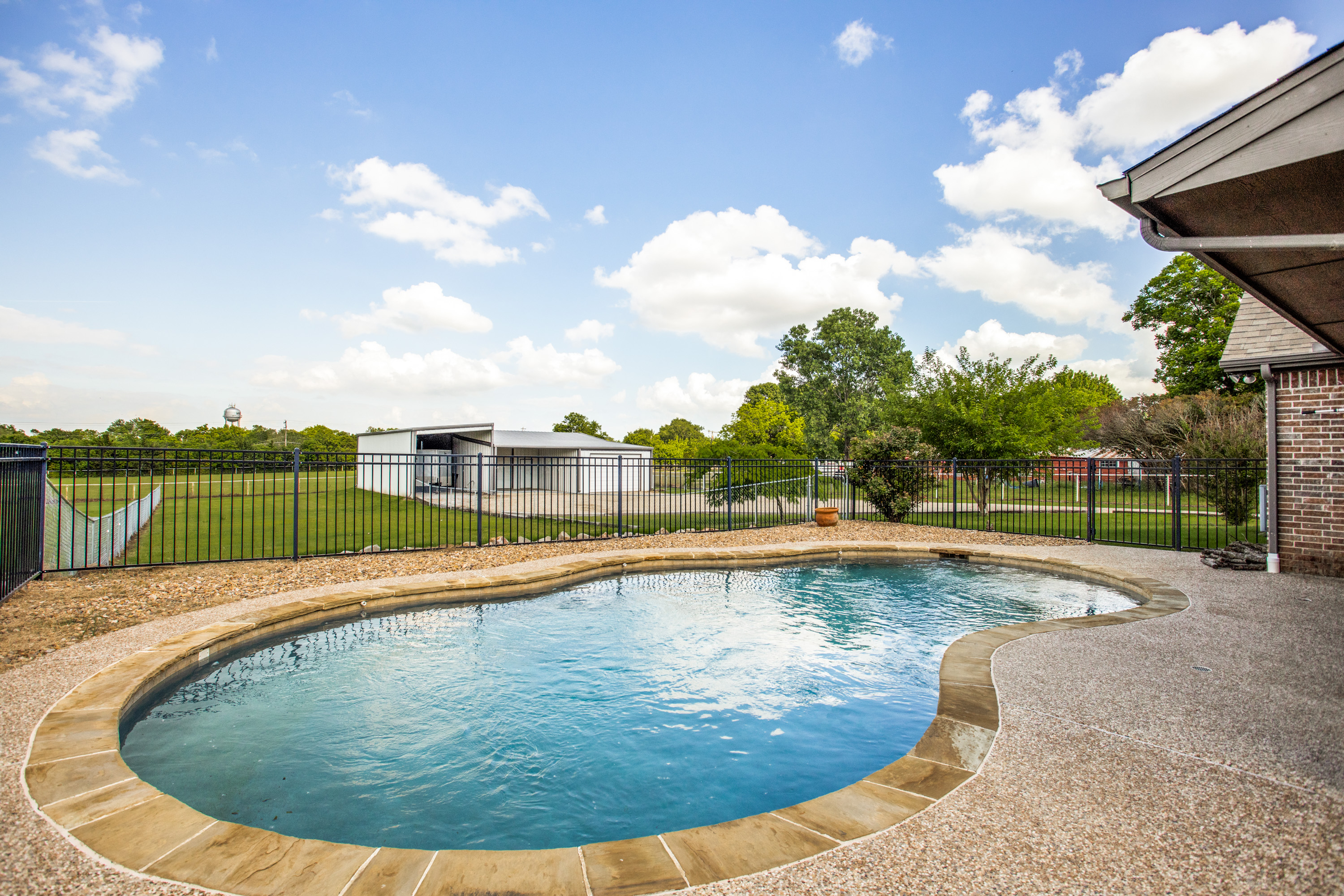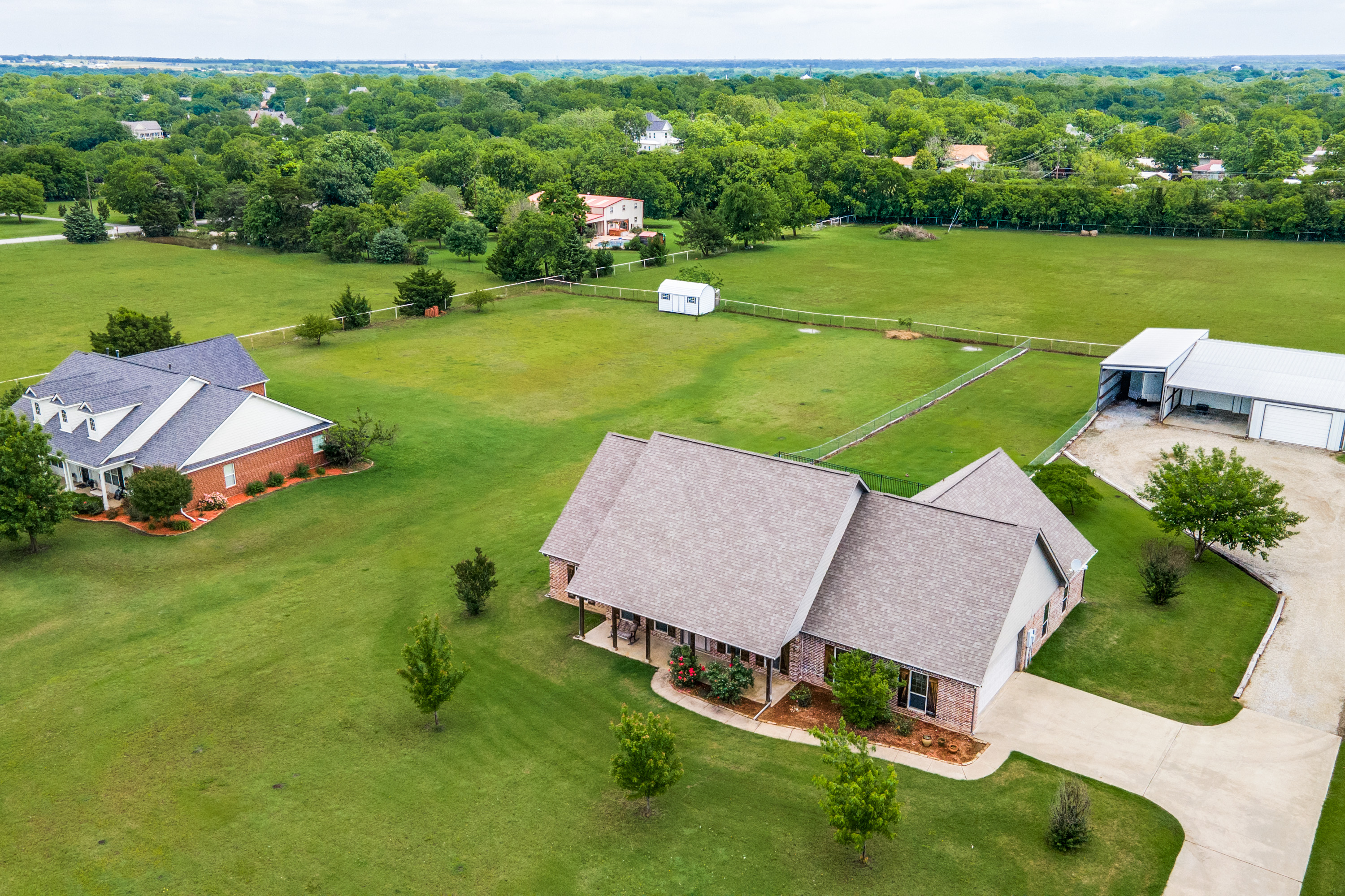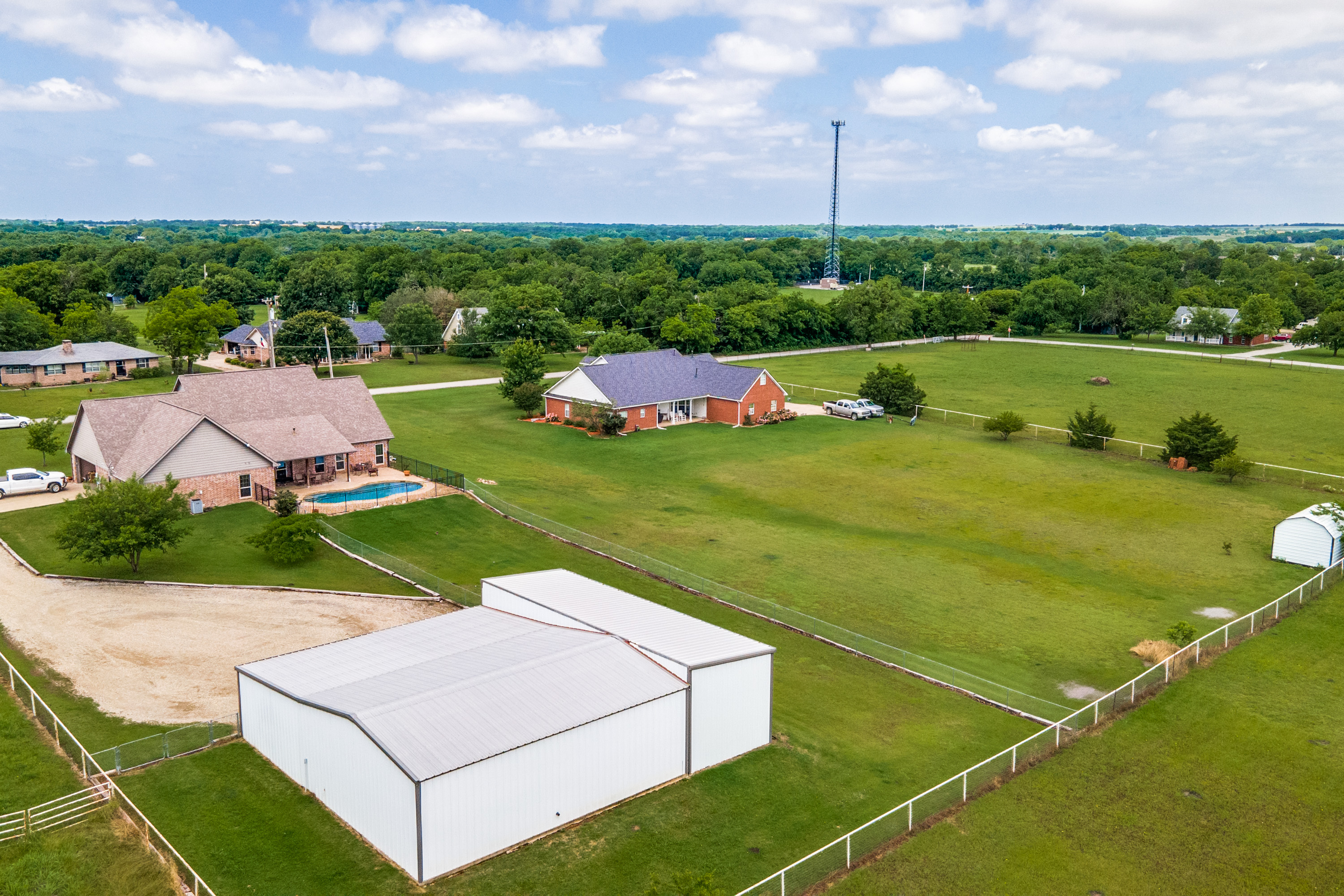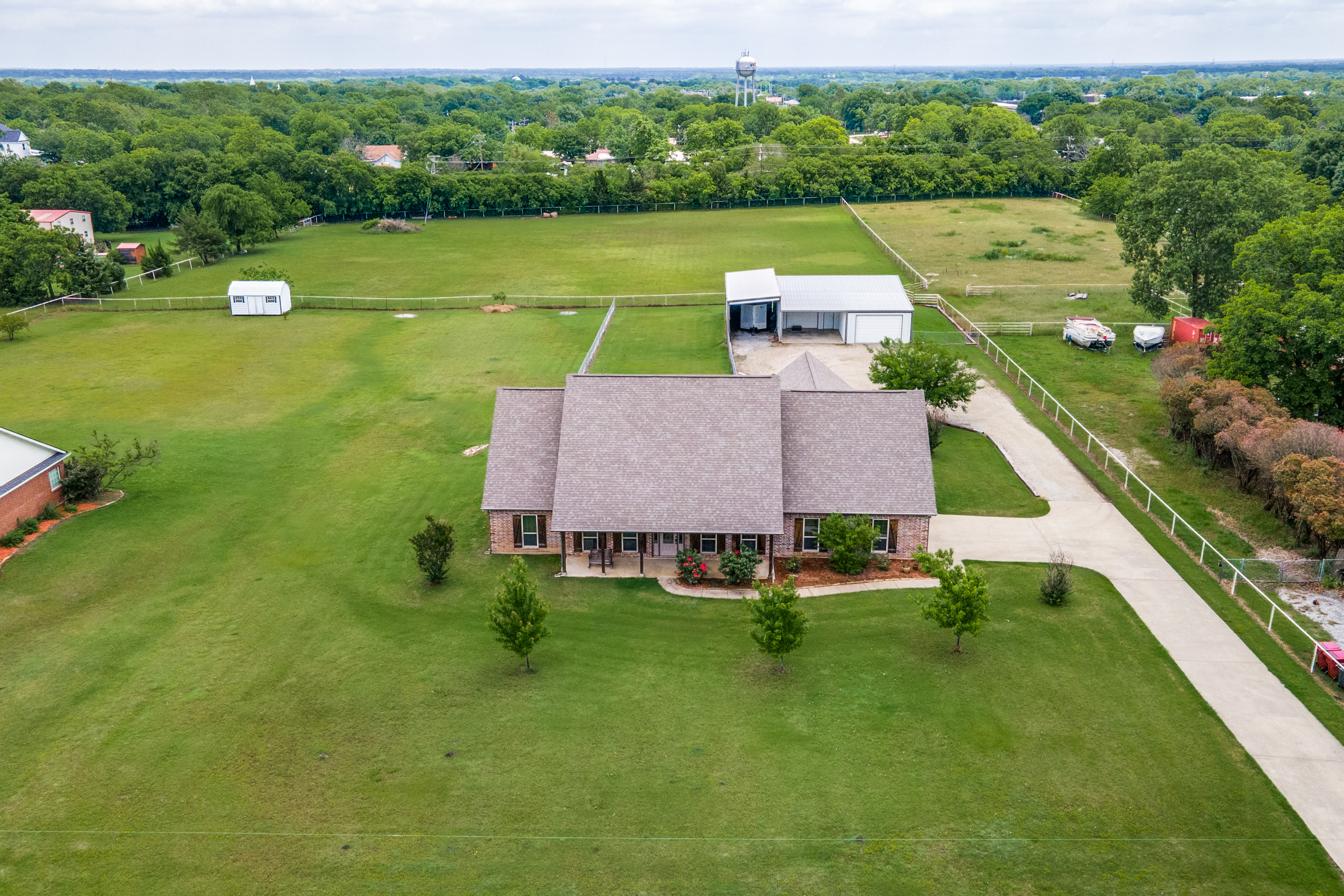 Stunning estate nestled in serene country setting. Separate 30x40 shop with electricity and water, includes 20x40 carport and 16x50 RV and boat parking. Don't miss this sprawling ranch style home with stunning hardwood floors and vaulted ceilings. Could easily be a 5 bedroom home with an armoire addition. Eat-in kitchen has breakfast bar, ample cabinets, separate pantry, and abundant granite counter space. Private master has walk-in shower, soaking tub, separate vanities, and spacious closet. Living room has Quadra-Fire Pellet Stove with separate thermostat. Generous property set-back provides space and privacy. Built in pool for hot Texas summers! Property line is not fence line, it is represented in drone photos.