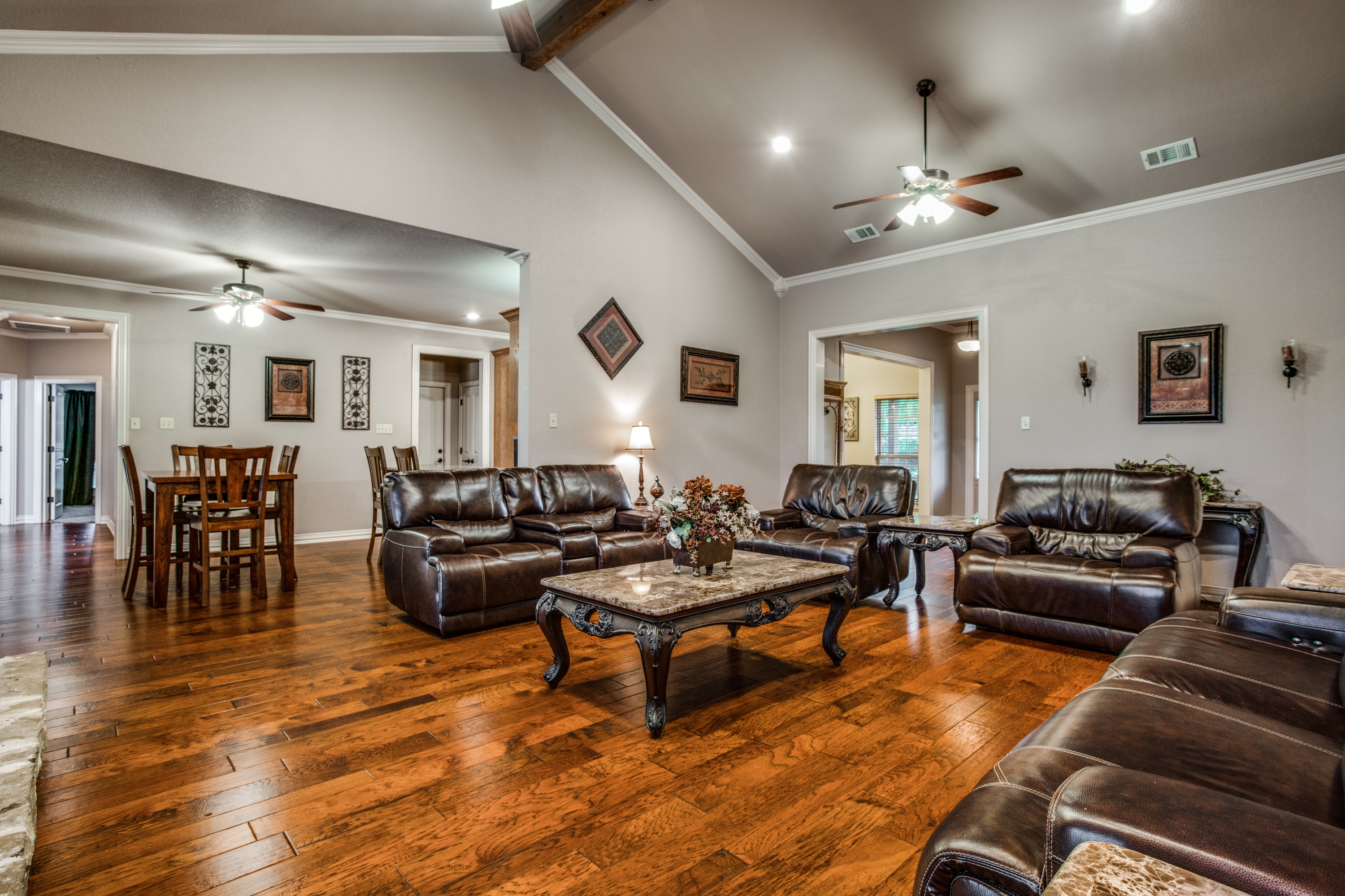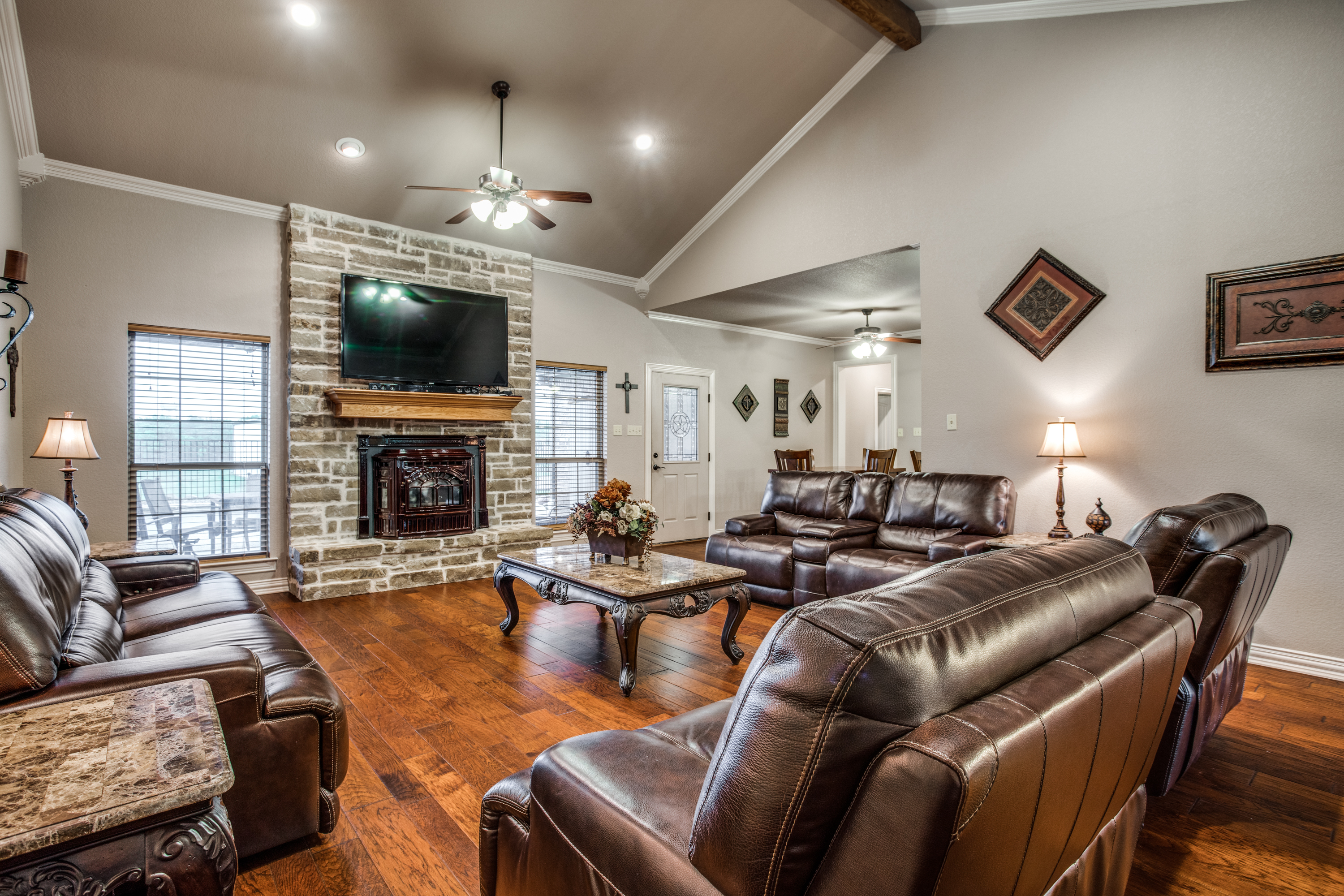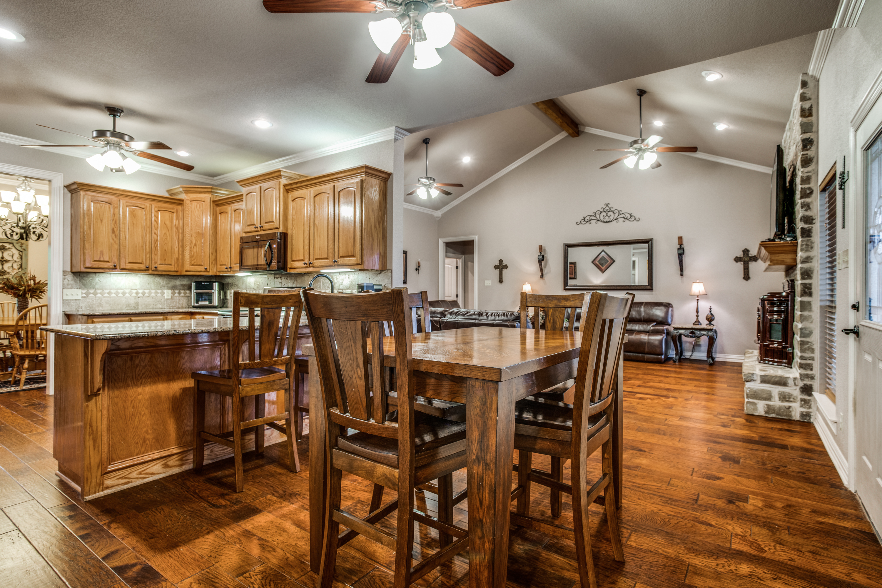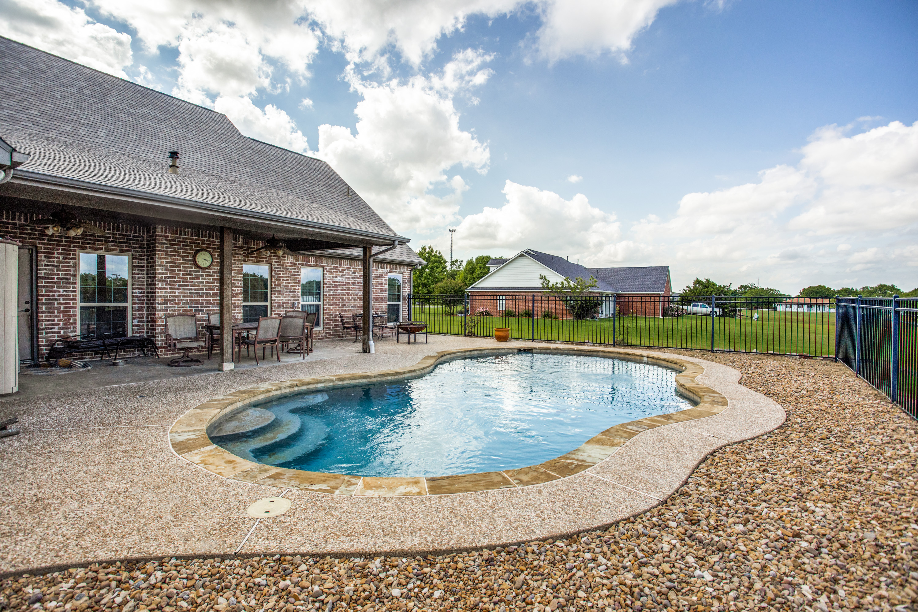 Stunning estate nestled in serene country setting. Separate 30x40 shop with electricity and water, includes 20x40 carport and 16x50 RV and boat parking. Don't miss this sprawling ranch style home with stunning hardwood floors and vaulted ceilings. Could easily be a 5 bedroom home with an armoire addition. Eat-in kitchen has breakfast bar, ample cabinets, separate pantry, and abundant granite counter space. Private master has walk-in shower, soaking tub, separate vanities, and spacious closet. Living room has Quadra-Fire Pellet Stove with separate thermostat. Generous property set-back provides space and privacy. Built in pool for hot Texas summers! Property line is not fence line, it is represented in drone photos.