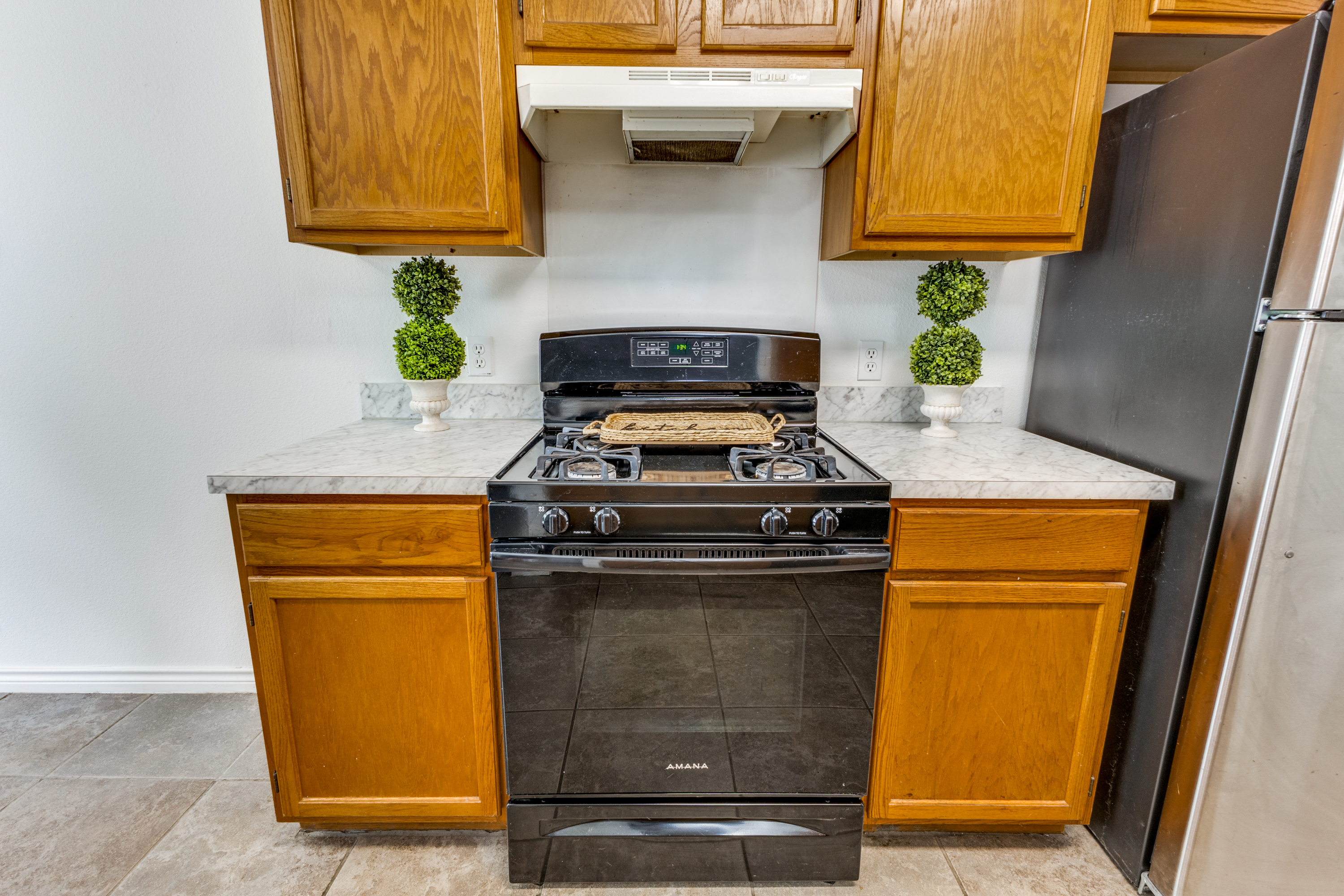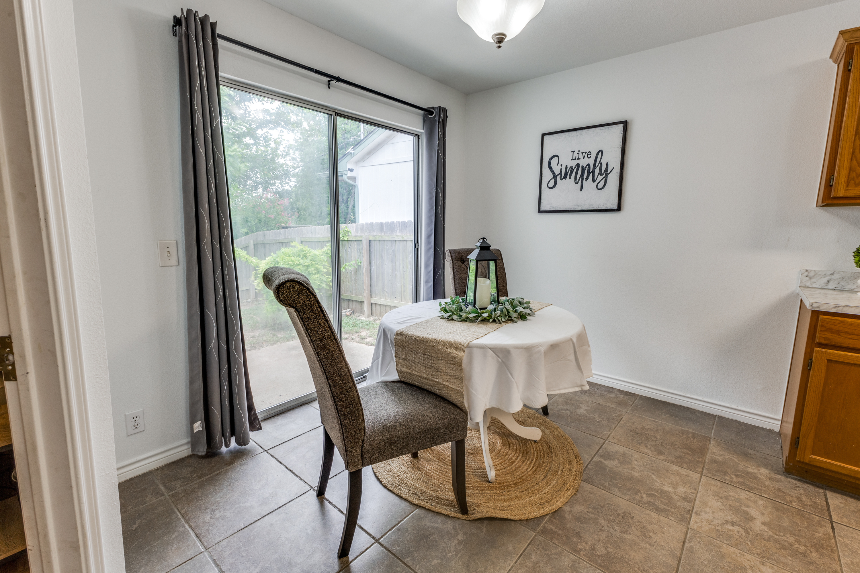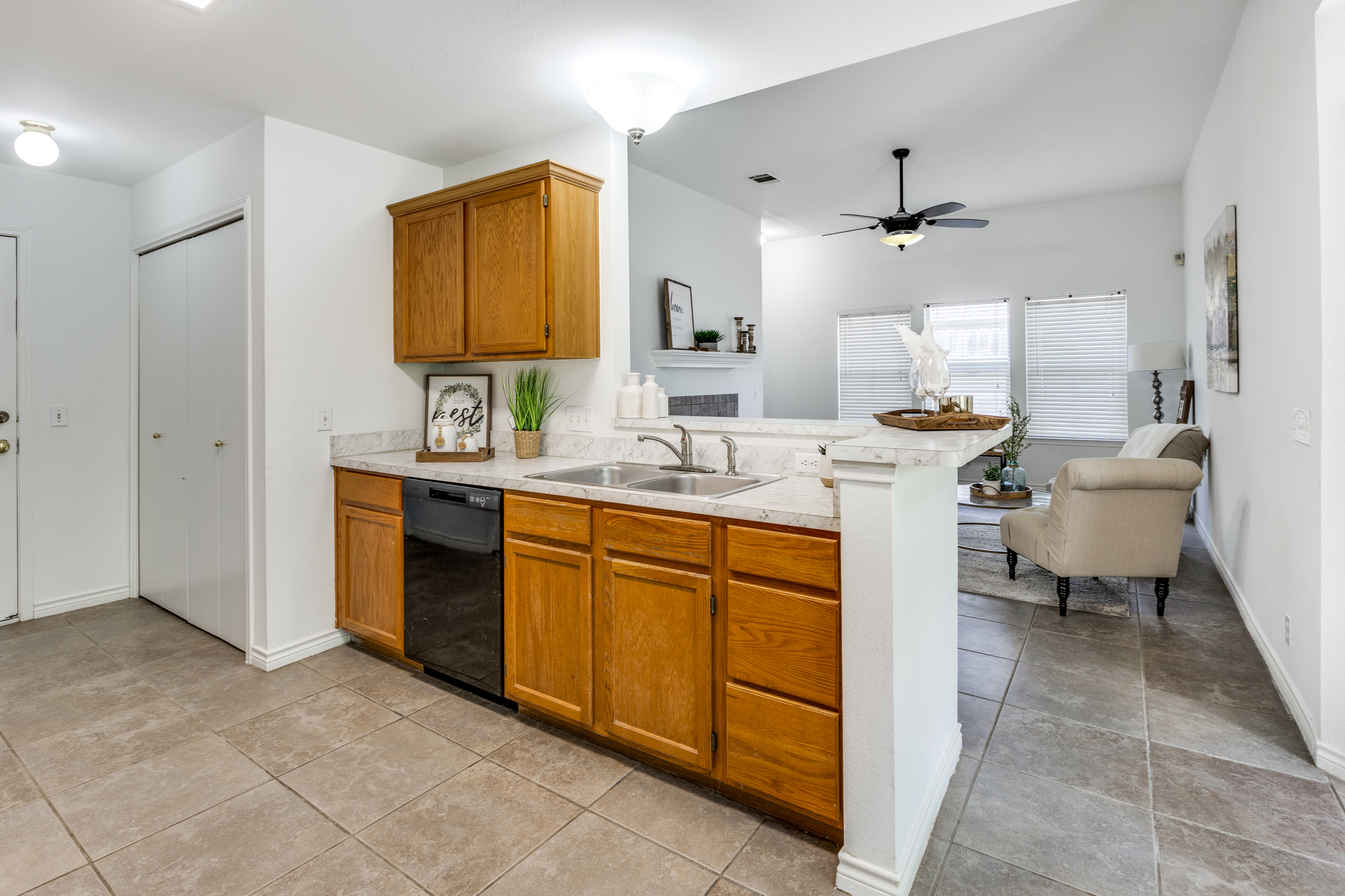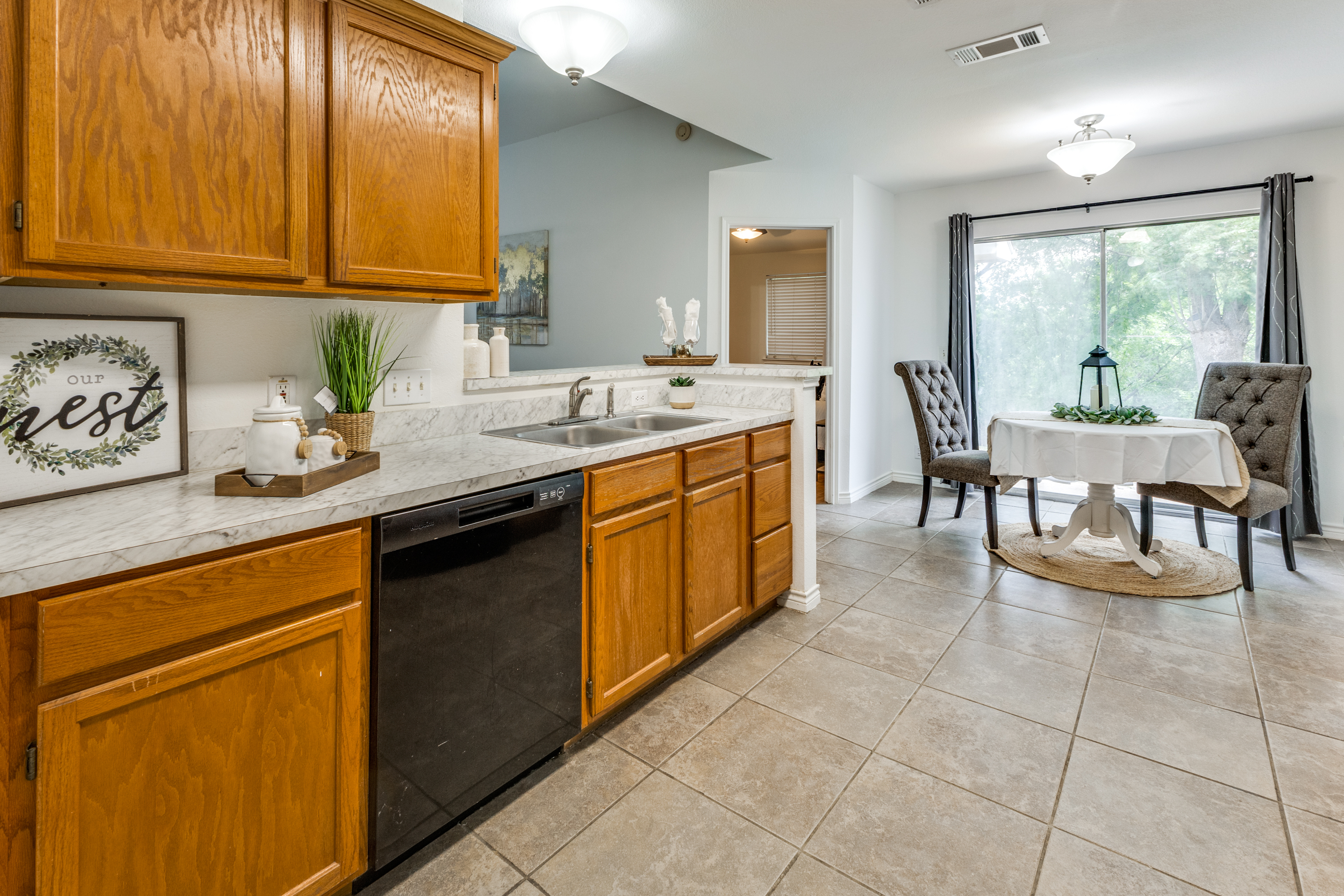 Welcome to this charming and meticulously maintained home. Fresh and clean both inside and out, this inviting property features a refreshed kitchen with new countertops. The home showcases durable ceramic tile and vinyl parquet flooring throughout, ensuring easy maintenance with no carpet.The thoughtful layout includes high ceilings, two bedrooms with walk-in closets, and two full bathrooms. The open-concept living area is enhanced by a cozy fireplace, and the convenience of three ceiling fans with remote-controlled lights adds a modern touch. The kitchen is fully equipped with a pantry, gas stove, dishwasher, disposal, washer, dryer, and refrigerator. Step outside to a spacious, fenced backyard that opens to a private gate leading to the Walnut Creek greenbelt, offering a serene setting with no rear neighbors. Mature shade trees enhance the outdoor space, making it perfect for relaxation or entertaining.