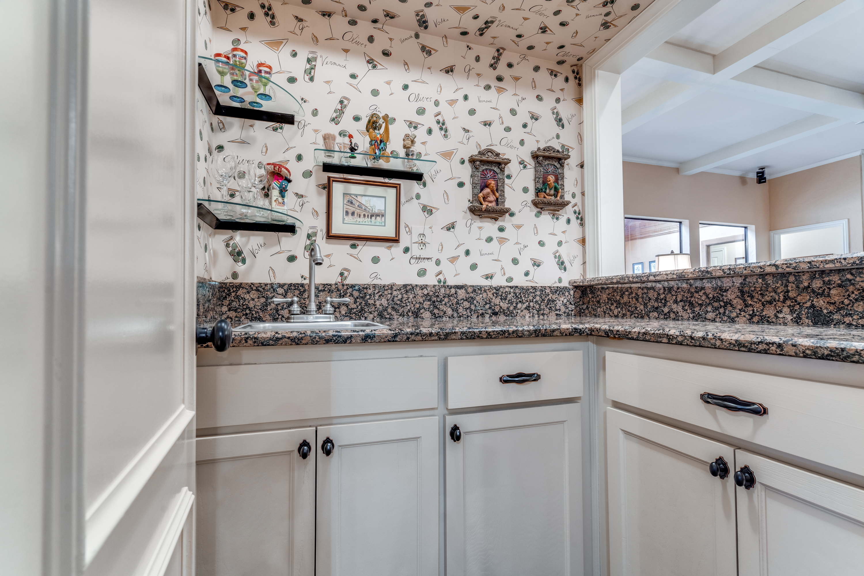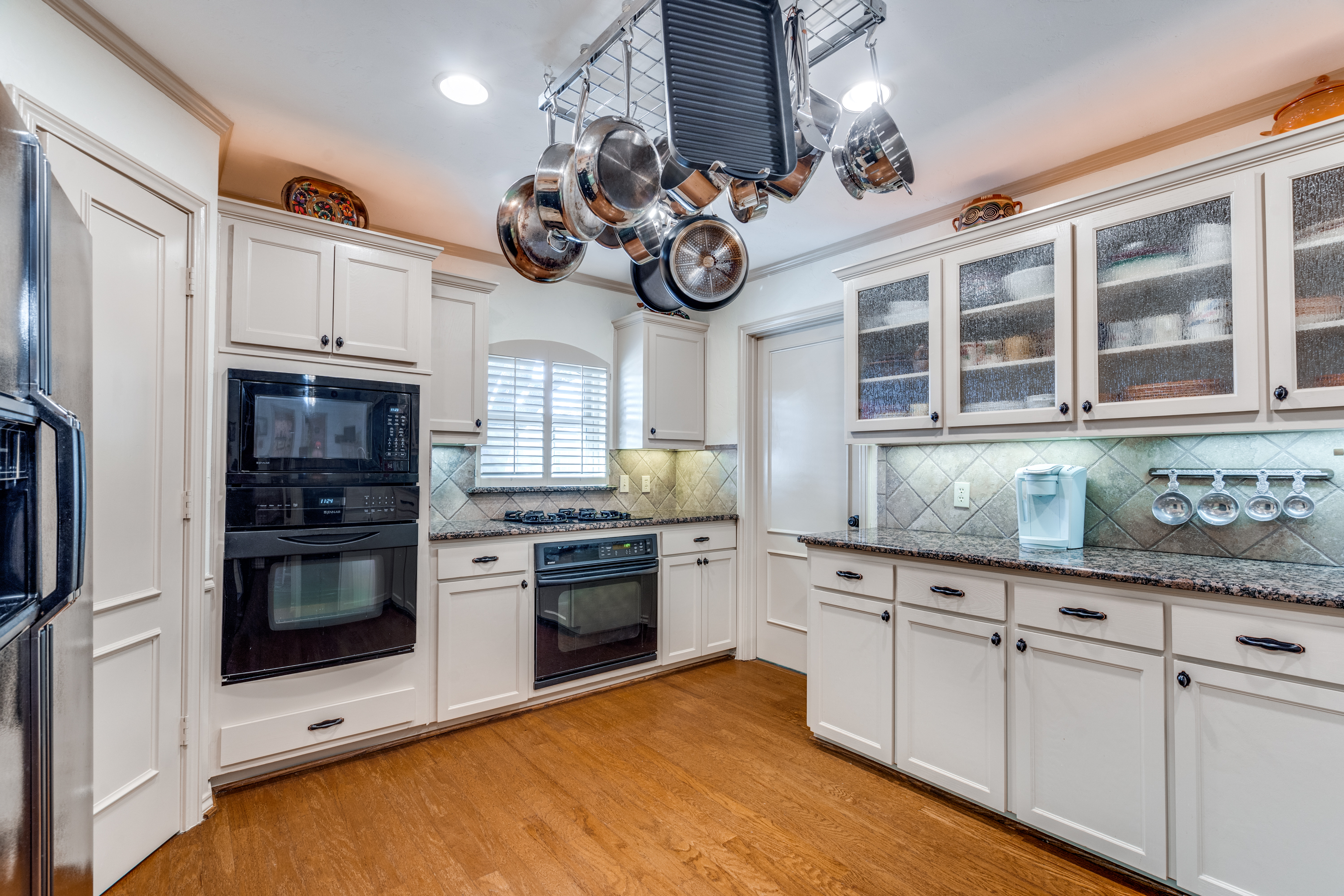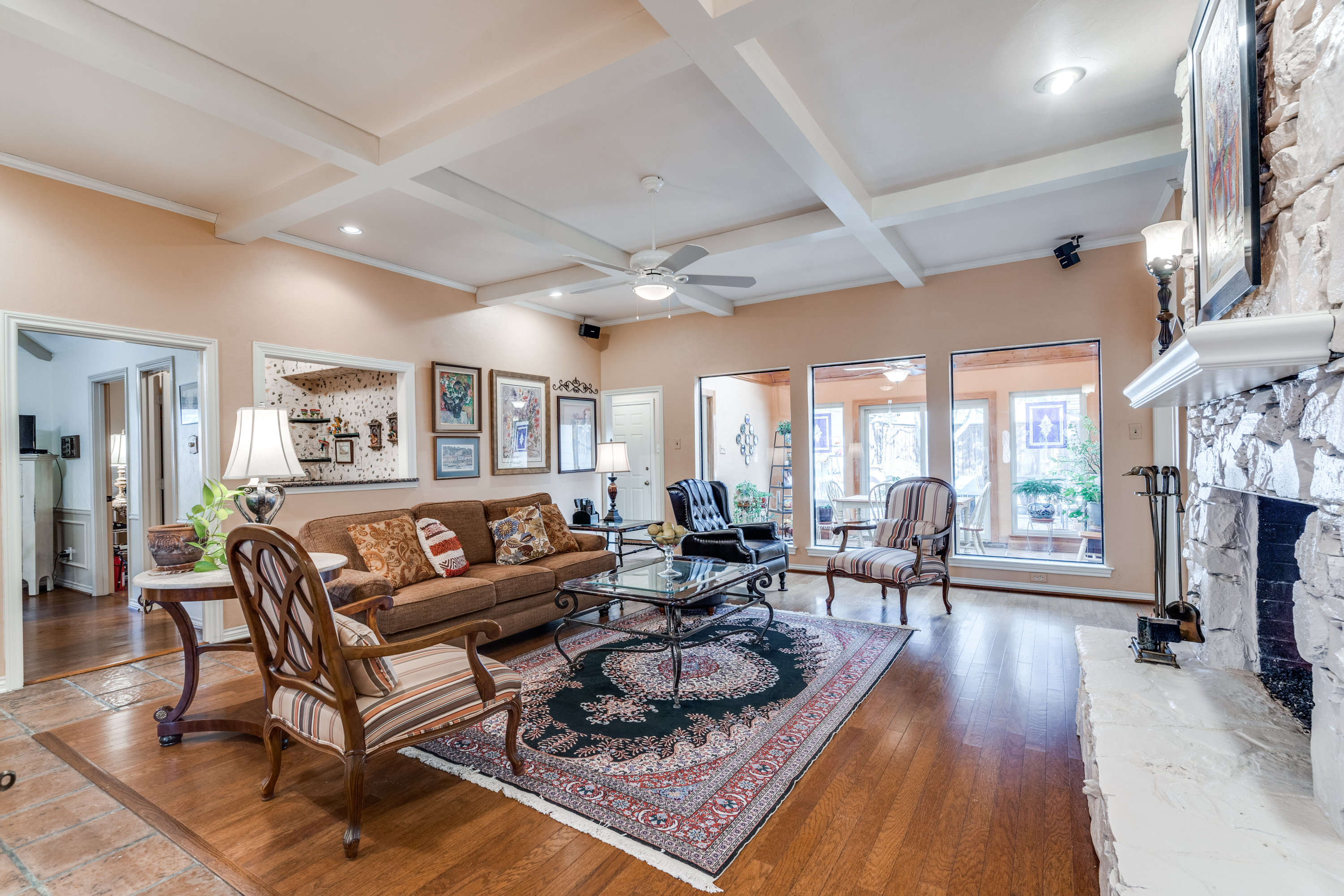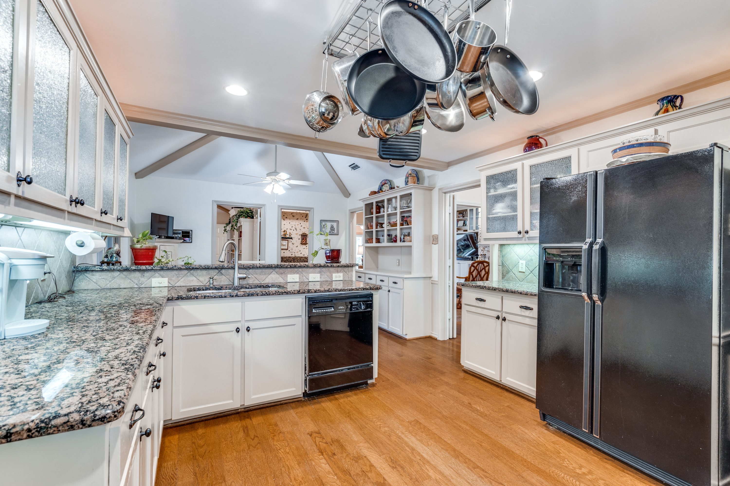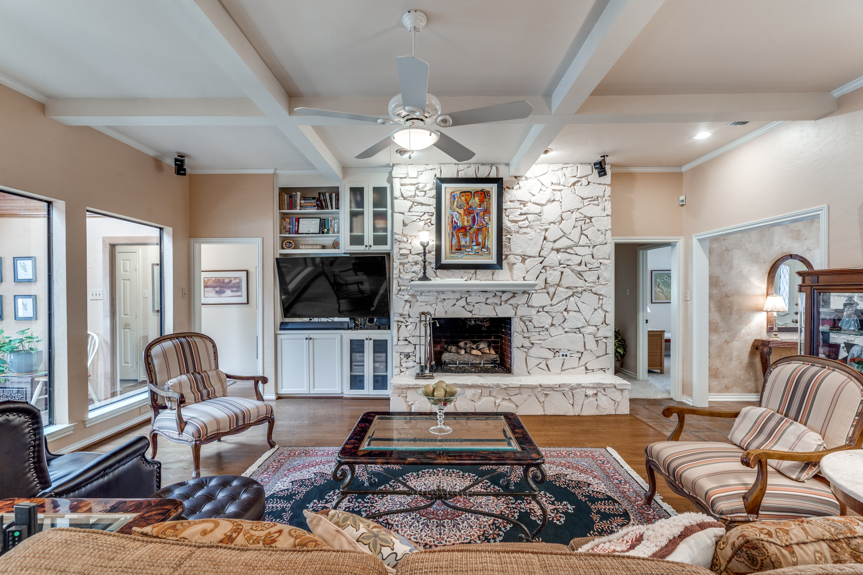 One story home with flexible floor plan. Can be a four bedrooms, 2 living areas or three bedrooms with 3 living areas. Fourth bedroom with closet can be family room or office/study. Kitchen with granite counter tops, double ovens, and gas cooktop is open to breakfast room with hutch. Living room with fireplace/gas logs. Large primary bedroom with sitting area. Primary bath with two walk-in closets. A must to see the amenities in this lovely home.