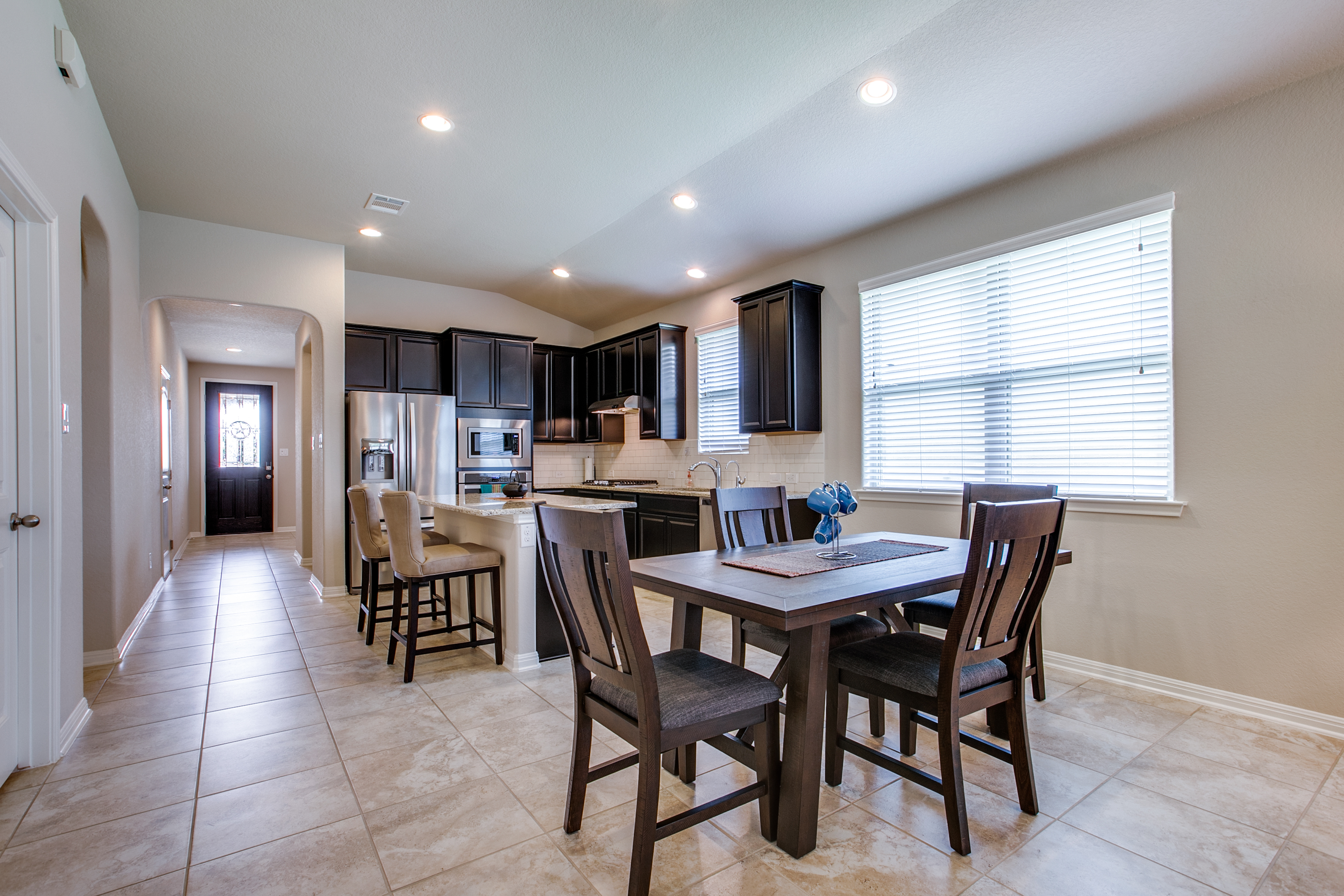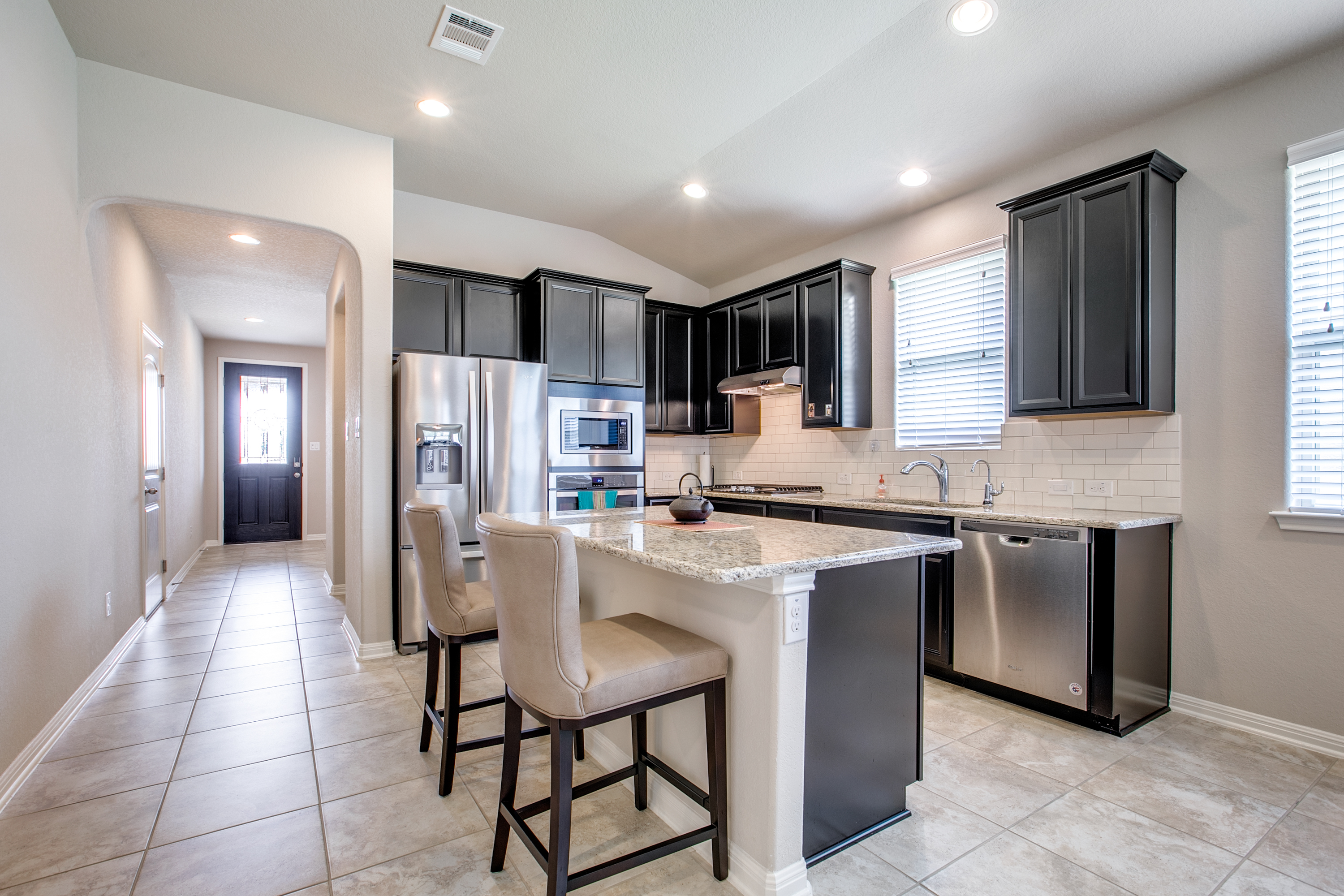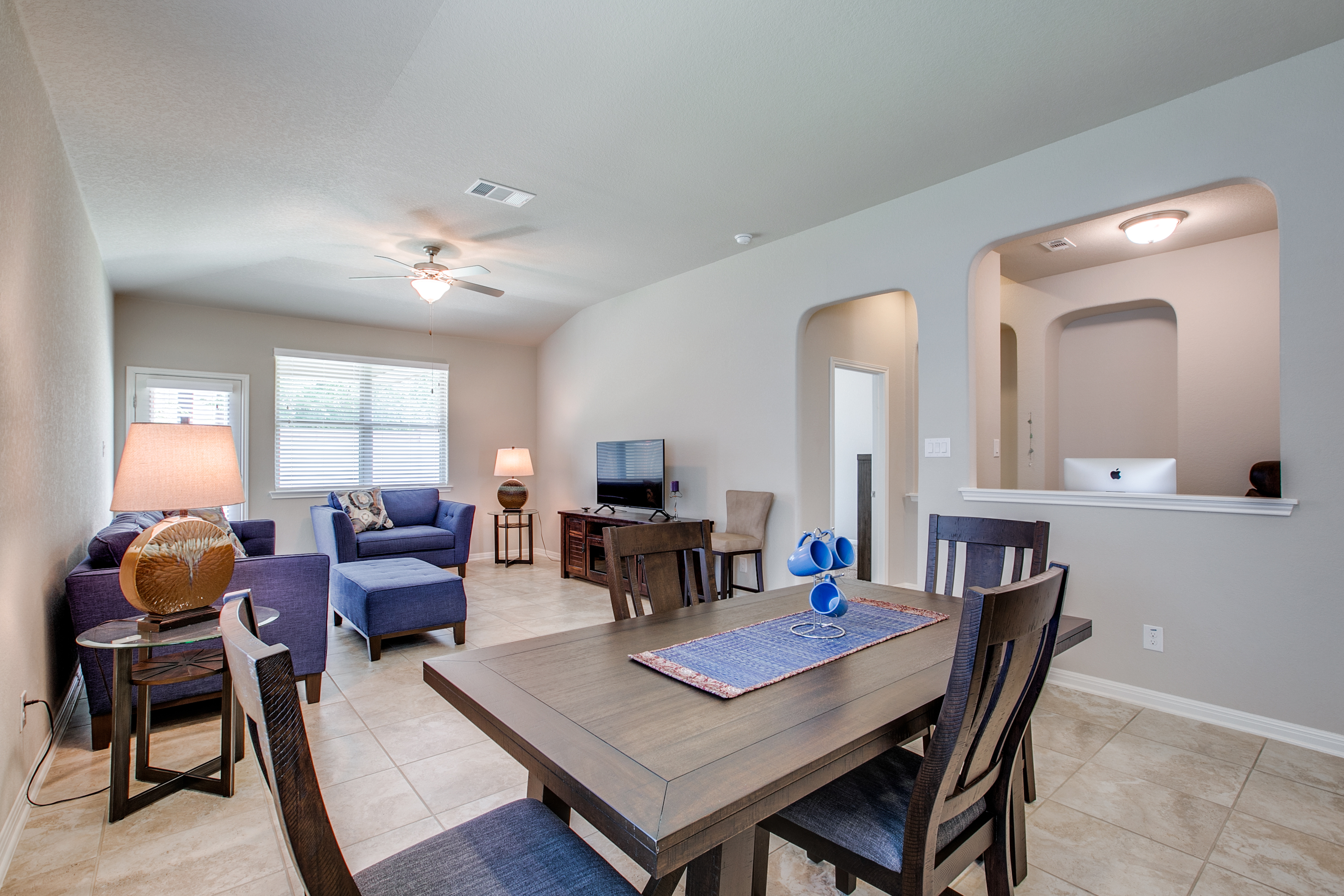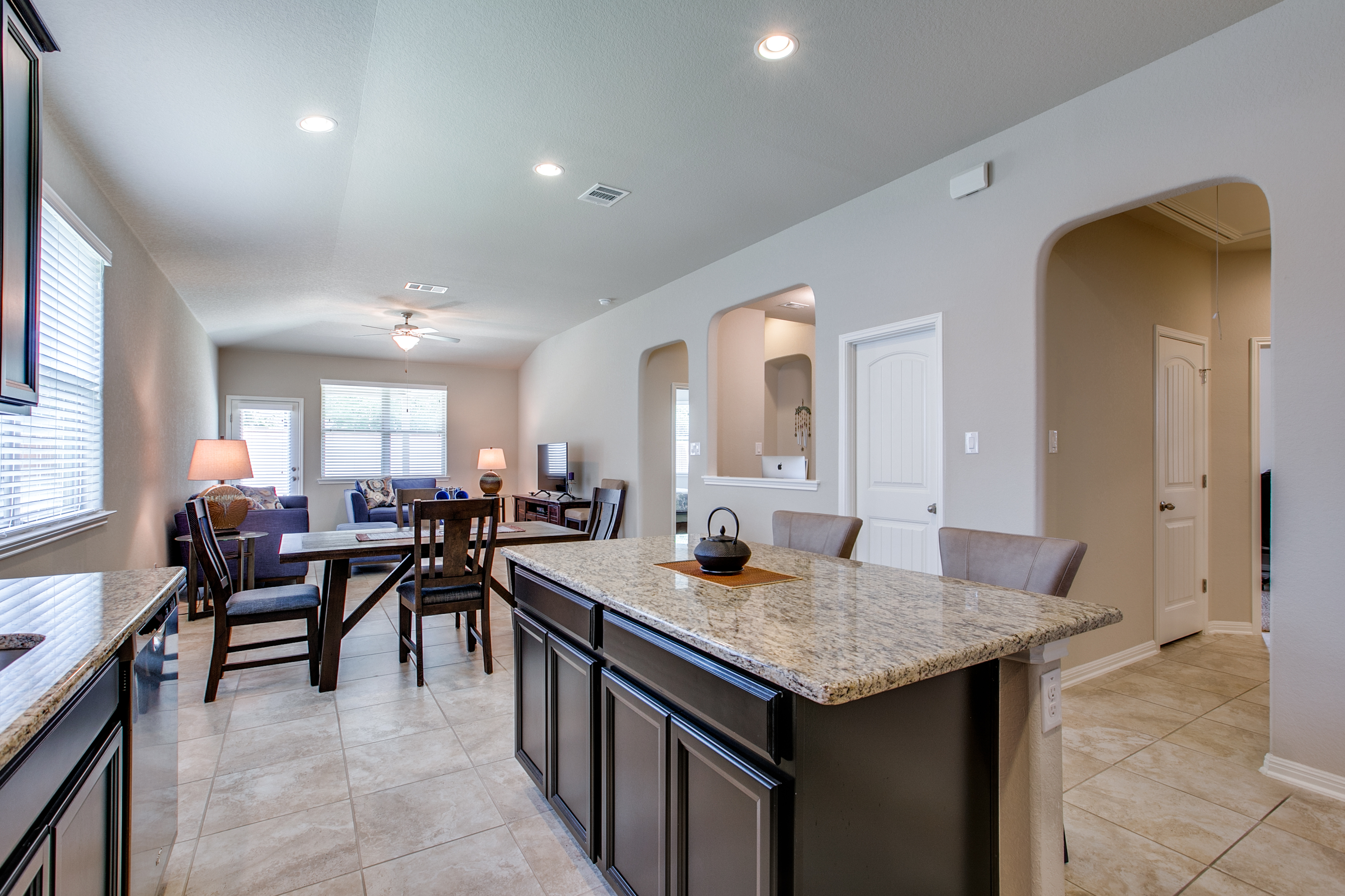 Charming 3 BR/2 BA, Open-floorplan with covered front porch, large covered back patio! Offers large island kitchen, a convenient pocket office for students or a home business, formal dining room PLUS a large Master Suite with dual sink, soaking tub, separate walk-in shower and a fabulous walk-in closet!
