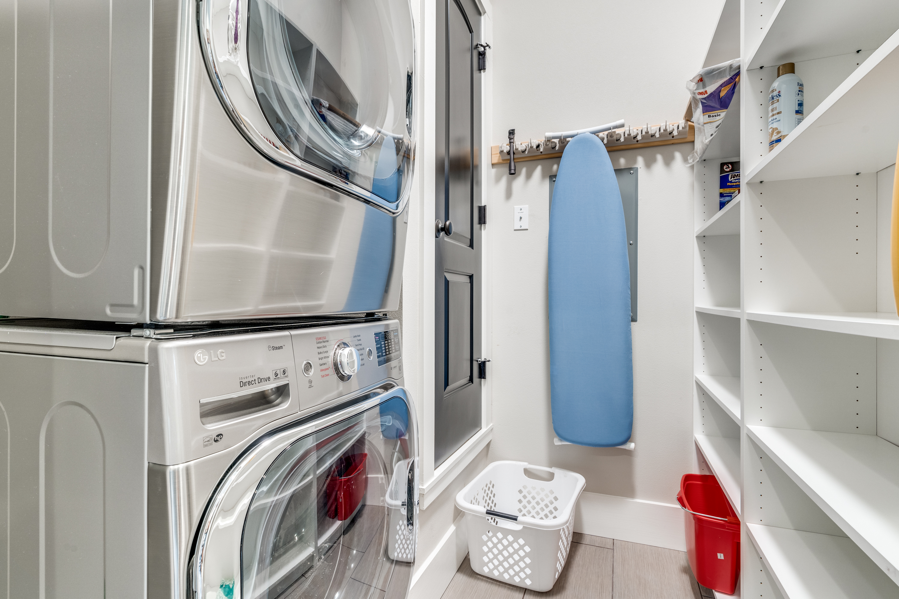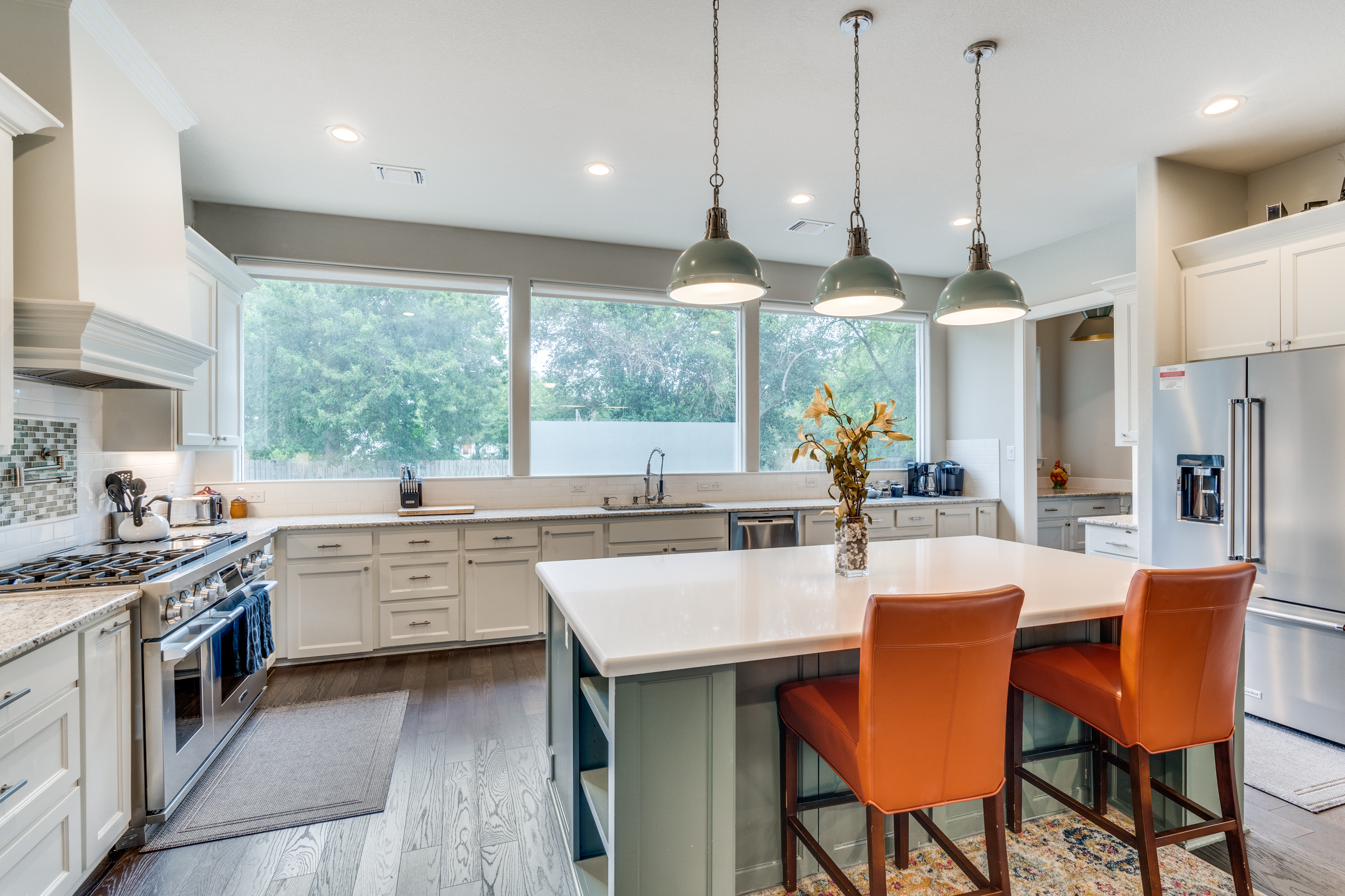 The chef’s kitchen features a 48" Signature Kitchen Suite gas pro range with 6 burners, stainless steel appliances, pot filler, under-counter microwave, and an oversized quartz island plumbed for an optional second sink. A butler’s pantry leads to a large mudroom/laundry area with sink and additional storage.