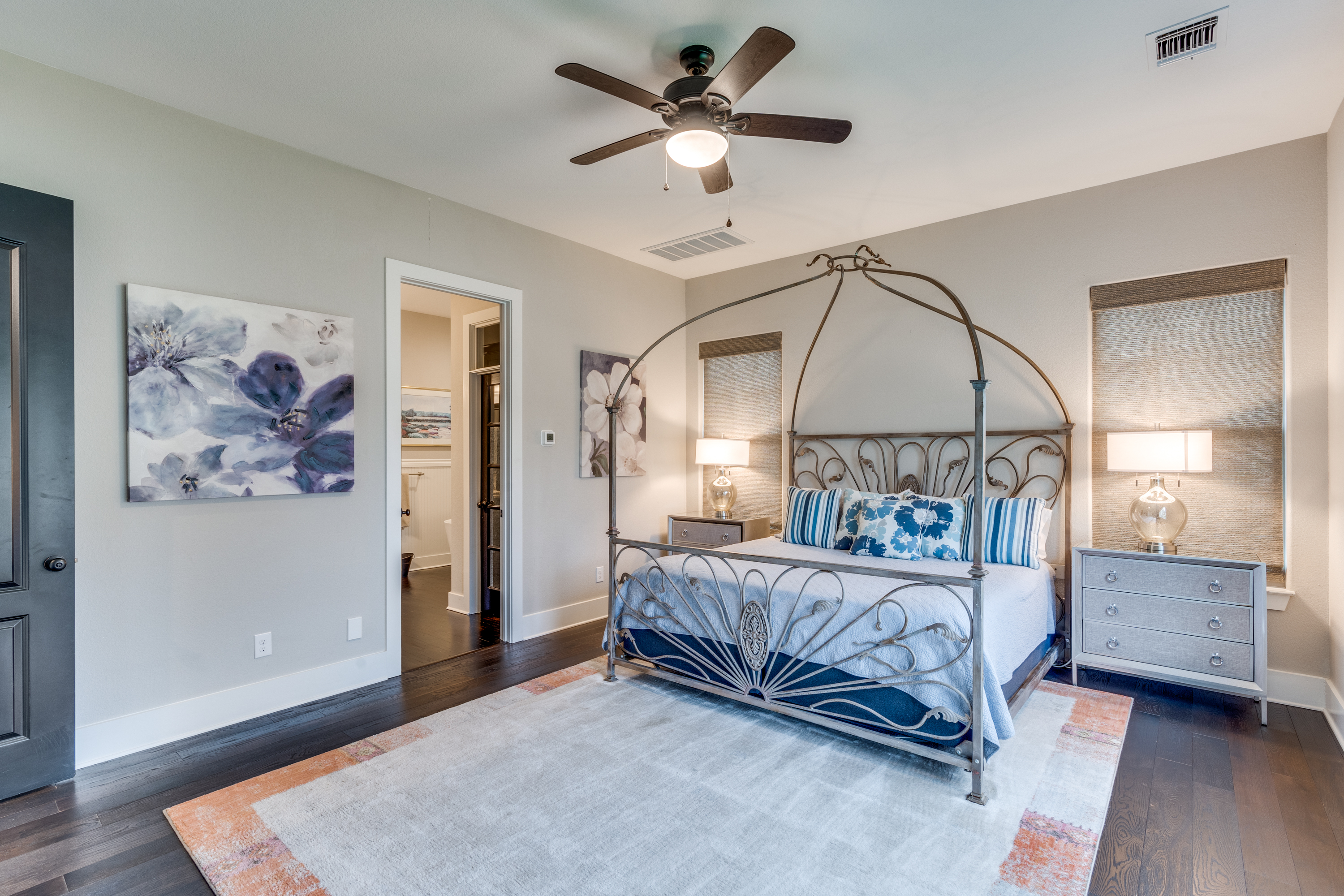 The primary suite is located on the main level and offers backyard access, double vanities, dual closets, soaking tub, and walk-in shower. The guest house offers 1 bedroom and 1 bath, ideal for guests or as a rental. Outdoor living includes covered patios, firepit, and covered bar/grill area overlooking a spacious backyard with room for a pickleball court.